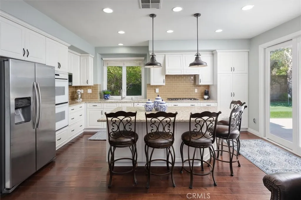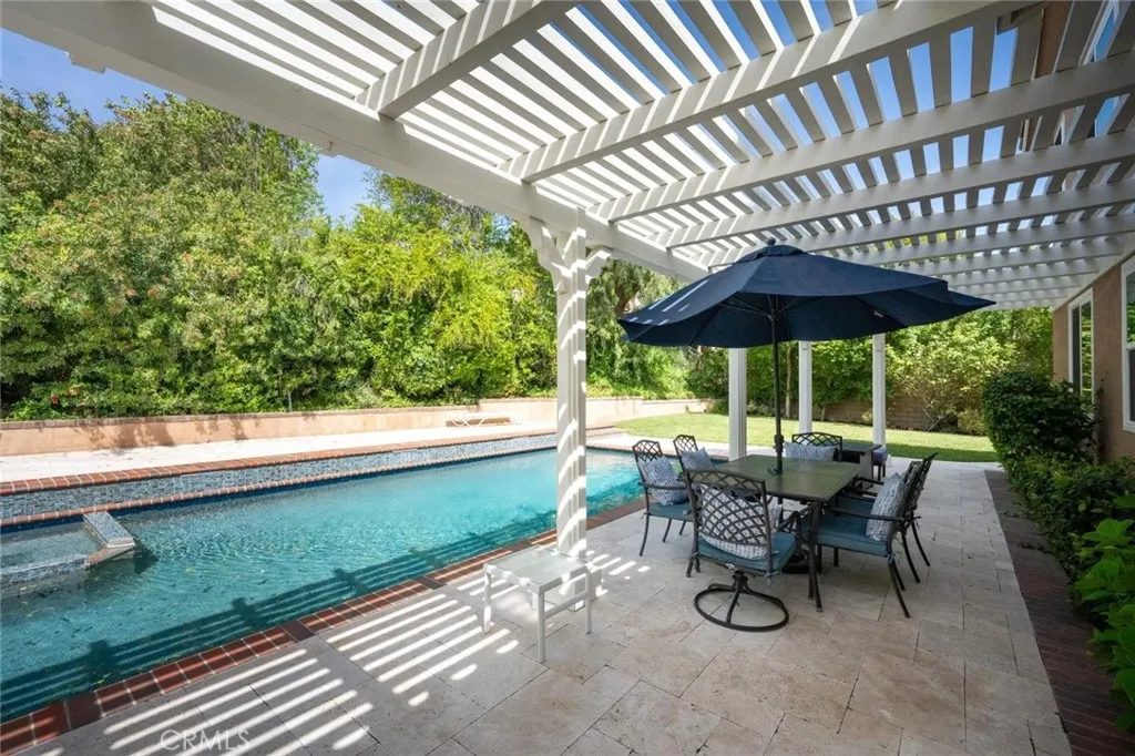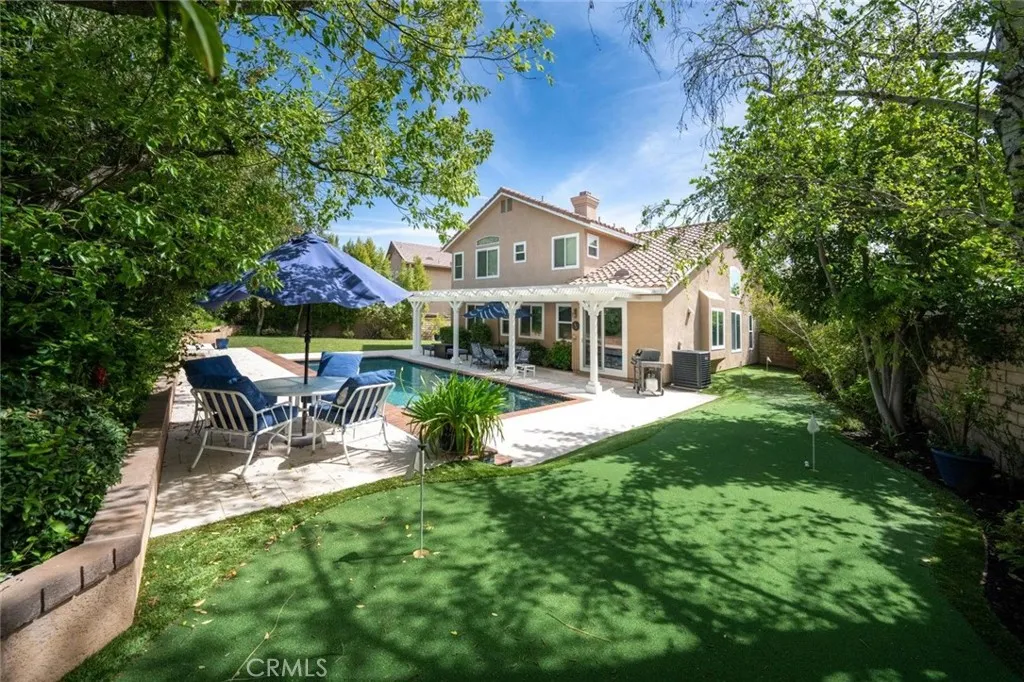 End of culdesac location with a private backyard featuring a pool, spa, putting green, grassy area, covered patio, large side yard, an oversized family room off the kitchen, and no mello roos. Original owners have meticulously maintained and thoughtfully upgraded this home throughout. The backyard was fully renovated with PebbleTec pool finish, Pentair equipment, and LED color changing lighting. The updated kitchen has white cabinetry, granite countertops, and a large center island and opens directly to the expanded family room with fireplace. Flooring includes wood and plush carpet. Additional upgrades include dual pane Milgard vinyl windows, HVAC system replaced approximately 2 years ago, and updated attic insulation. The flexible floorplan includes a downstairs bedroom and full bathroom, along with an indoor laundry room with sink. Upstairs features three additional bedrooms plus a loft. The primary suite offers high ceilings, a walk in closet, soaking tub, walk in shower, and dual vanities. Located in the Pacific Hills neighborhood and zoned for Valencia High School, Rio Norte Junior High, and Mountain View Elementary. No LMD on taxes as HOA cares for the common areas.