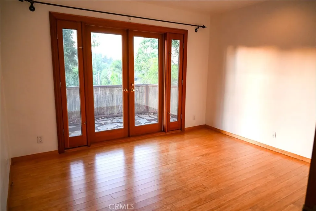 This gated, contemporary 3-bed, 2-bath home is located in a private cul-de-sac in the coveted Royal Woods neighborhood of Sherman Oaks. The turnkey home has been thoughtfully designed and meticulously maintained by its dedicated owner. The living and dining rooms feature a slate entryway and warm, hardwood floors complimented by an exposed, natural wood-beam ceiling, with integrated skylights, offering an abundance of natural light. Modern French doors throughout, offer more light and a seamless transition to the entertainers backyard; a tranquil retreat that hosts a dramatic, cascading waterfall, saltwater pool, and mature landscaping. The chefs kitchen, designed for functionality and style, has granite countertops, light-wood cabinetry, stainless appliances, recessed lighting, and a built-in wine rack. The adjoining breakfast nook features a unique built-in fireplace integrated into a large, concrete-finished wall. The primary bedroom suite offers a warm, inviting palette and transitions effortlessly to the poolside patio. The primary bath features granite countertops, a granite-wrapped tub, and an expansive, natural-stone walk-in shower. There is a second, well-appointed bathroom and two secondary bedrooms; both share a private patio, finished with a wooden-framed bamboo fence and flagstone pavers. The home also boasts a bonus room (office/gym), utility room, 2-car attached garage, a large car-port , extra storage room, and interlocking, paved driveway. Easy Westside access and proximity to top-rated private and public schools, local parks, the Sherman Oaks Galleria and
