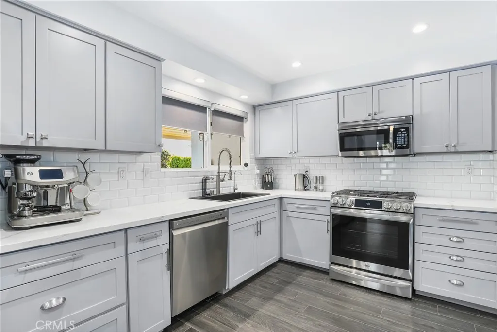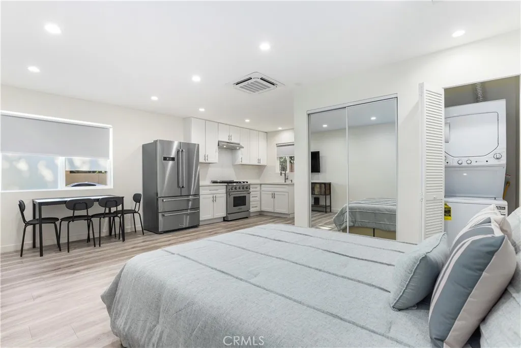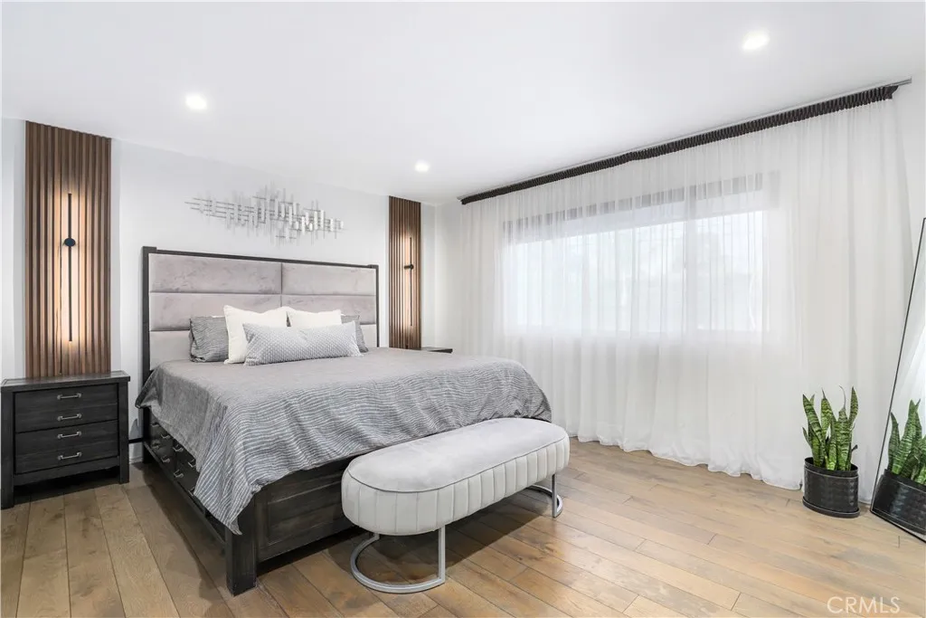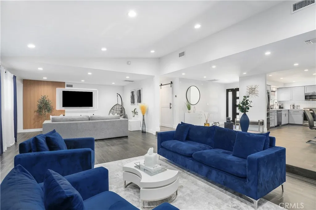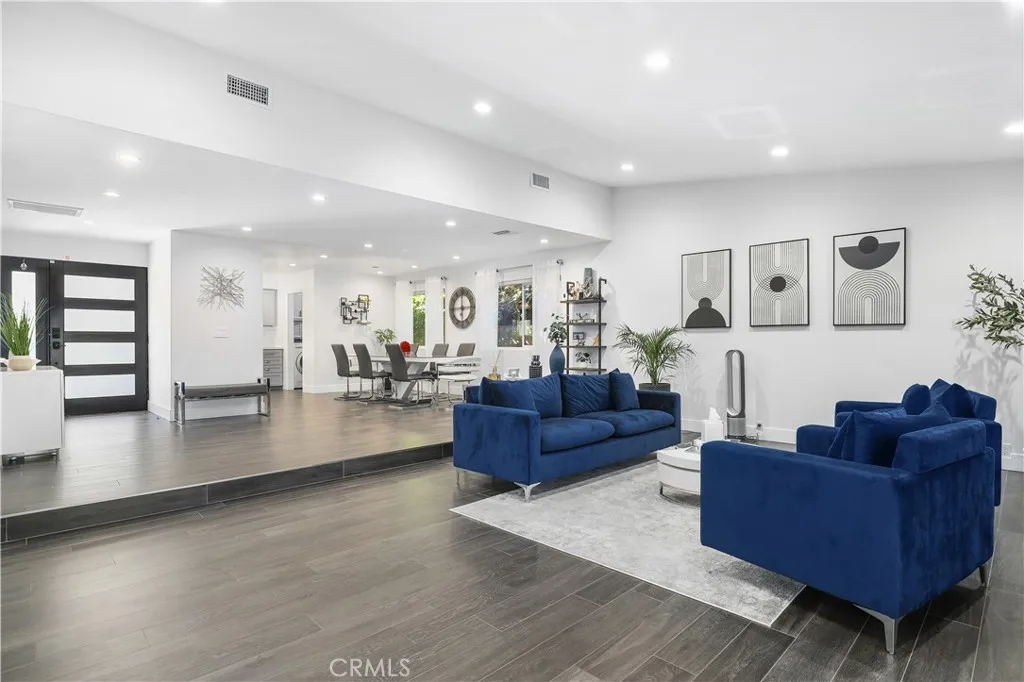 Gorgeous reimagined Mid-Century Modern residence, originally crafted by Galaxy Homes in 1964. From the moment you arrive, a custom paneled entry door sets a warm tone, opening to an elegant foyer adorned with Venetian plaster walls and premium engineered wood flooring that flows seamlessly throughout the home. Expansive living and family rooms are bathed in natural light, featuring high ceilings, recessed lighting, and a fireplace creating inviting spaces that feel both grand and intimate. The generous dining area is designed for memorable gatherings, effortlessly accommodating large-scale entertaining. At the heart of the home is a chefs kitchen with modern cabinetry, quartz countertops and upgraded stainless steel appliances perfect for both everyday living. Each bathroom feels like a spa, offering floating vanities, designer tile work, and elevated fixtures. The primary suite serves as a serene retreat, complete with a private bathroom and a spacious walk-in closet. Designed with both function and style in mind, the home also features a dedicated laundry room with abundant storage. The entertainers backyard is a true sanctuary highlighted by an oversized covered patio, a sparkling pool with an expansive deck, and a low-maintenance lawn framed by lush, thoughtfully designed landscaping. Modern efficiency meets quality with fully paid solar (41 panels), updated HVAC, a newer 200-amp electrical panel, energy-efficient windows and doors, solid core interior doors, custom millwork, and LED lighting throughout. Completing the property is a fully permitted JADU conversion, offe