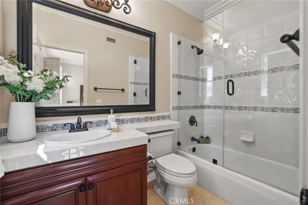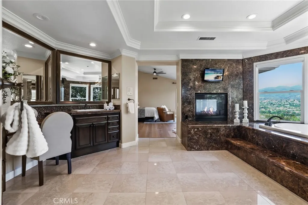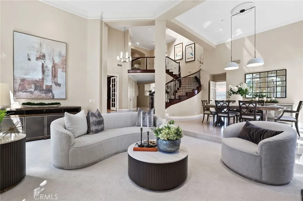 A panoramic masterpiece positioned near the highest elevations of the prestigious guard-gated community of Coto de Caza. Located toward the end of a quiet single-loaded street, this home offers exceptional privacy along with sweeping views of the golf course, rolling hills, and surrounding mountains. Recent improvements include a brand new roof, oakwood-color engineered flooring throughout both levels, a new pool pump, and fresh interior paint, creating a bright, cohesive, and updated interior. Interior features include rich wood detailing, plantation shutters, and stone flooring. The home is also equipped with a whole house water filtration system and soft water system. Spanning approximately 5,000 square feet on an expansive 0.45-acre lot, this home offers 6 bedrooms, 5 bathrooms, plus a dedicated office, thoughtfully designed for both functionality and comfort. Enter through double doors into a grand foyer with soaring ceilings and a skylight that fills the space with natural light. The living and dining areas are seamlessly connected, while expansive windows frame lush greenery and scenic views. The main level includes a private executive office with built-ins and a guest suite with ensuite bath, ideally positioned with views of the backyard garden, pool, and mountains, along with convenient access to the outdoor space. The chefs gourmet kitchen is equipped with stainless steel appliances, a 6-burner Viking Professional gas range, microwave, warming oven, center island, beverage refrigerator, and abundant cabinetry. A walk-in pantry has been converted into a wine storag