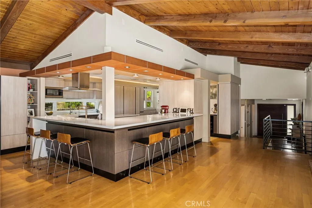 Perched high on a cul-de-sac street in Raymond Hills, and oh what a view! Relax with a sundowner on the upper balcony and watch Disneyland fireworks, city lights, and sunsets every night! This tri-level home is on a half-acre lot, and the sellers have spent hundreds of thousands of dollars opening up and expanding the floor plan with designer touches: open-beam ceilings, elegant suspended track lighting, endless storage throughout, a stunning open kitchen with double convection ovens, a Thermador range, Caesarstone counters with a movable center island, and a concealed Sub-Zero refrigerator and freezer. Kitchen counter and nook seating for 12 with a separate coffee station and wine refrigerator. Four main bedrooms are on the entry level with 2.5 fully remodeled baths. On the lowest level is a giant game room with a fireplace, a private bedroom, and another fully remodeled bath that opens onto the vast patio with a full outdoor kitchen: a BBQ, cooking burners, a refrigerator, and a sink with hot and cold filtered water. There is also a large raised veggie garden and side yard with nine different fruit trees. The current owners have hosted upwards of 200 people in this tropical backyard, with its patio areas located just below the outdoor sports court (which could be your own pickleball court). So you have a few cars? In addition to the huge entry motor court, there is a 4-car garage with EV charging capability. Solar and double a/c units increase energy efficiency, too. Ask yourself why you need to travel out to a resort when you can live in one. And let's not forget, this p