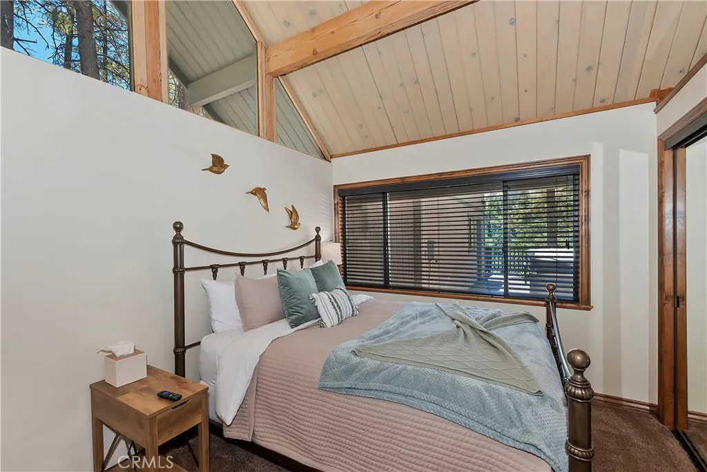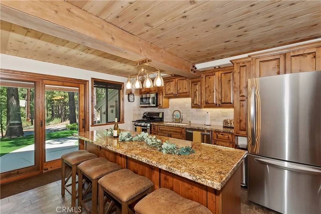 Discover the charm of this beautifully upgraded A-frame home, perfectly positioned in a convenient Moonridge location. This home has been a standout Airbnb, consistently receiving high reviews and generating excellent rental income. Offering breathtaking views of Bear Mountain and the nearby ski slopes, this property is ideally situated for skiing, golfing, and a range of outdoor activities just under a mile away. The interior of this home has been thoughtfully remodeled, blending modern upgrades with cozy mountain aesthetics. The fully equipped kitchen is a standout feature, boasting elegant granite countertops, new flooring, appliances, and a fully stocked coffee bar, making it a perfect space for entertaining or relaxing after a day on the slopes. Step into the living area and be greeted by soaring ceilings and a warm, inviting fireplace, creating a comfortable atmosphere for unwinding. The large sliding glass doors open to a private rear deck, where you can soak in the sunny mornings, enjoy peaceful afternoons, and take in the serene views of the ski slopes. Or enjoy soaking in the large hot tub tucked away with that feeling of privacy. You are truly amongst the trees. Additional conveniences of this home include a washer and dryer, recessed lighting, and a detached single-car garage. Whether youre looking for a turn-key vacation rental or a personal mountain retreat, this property is ready to offer comfort and style in a stunning setting.
