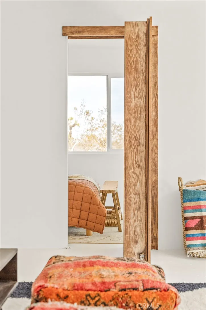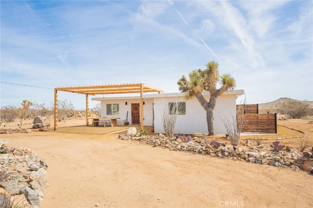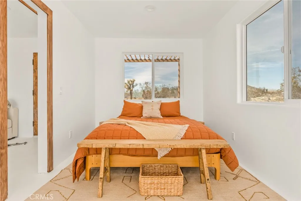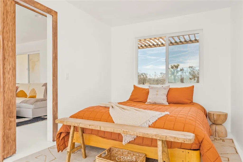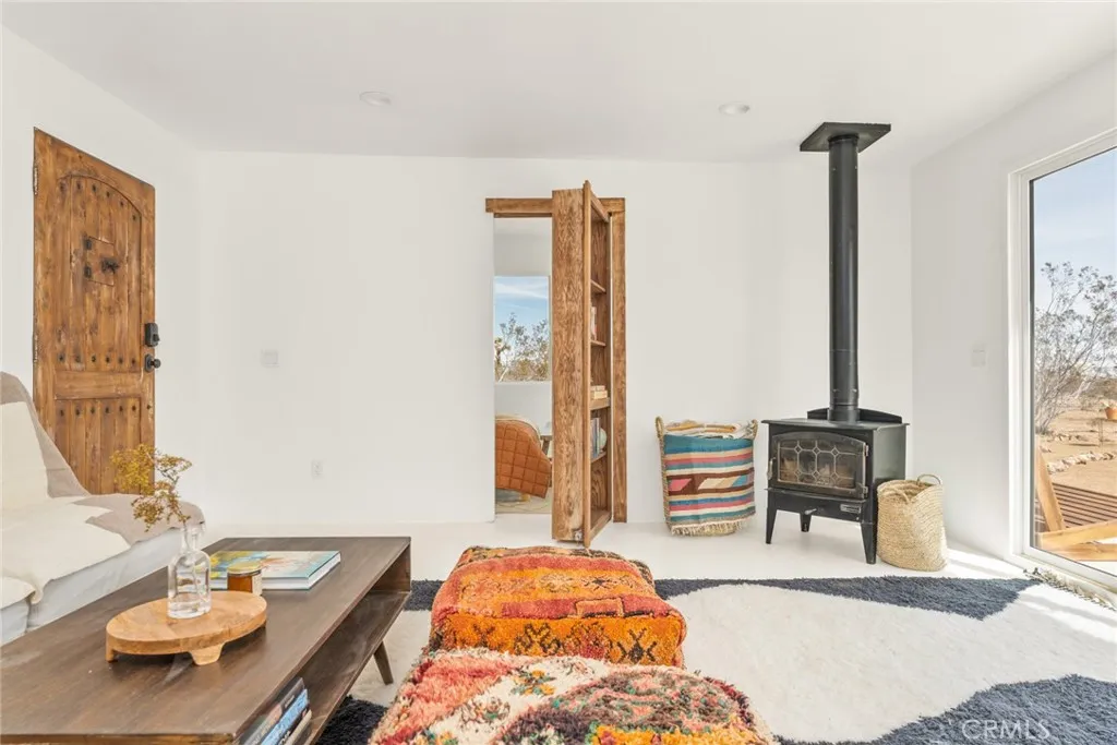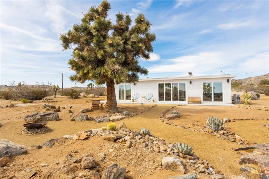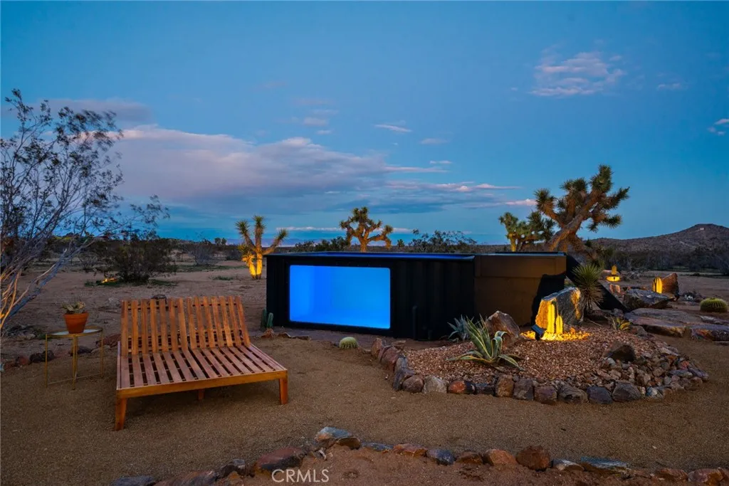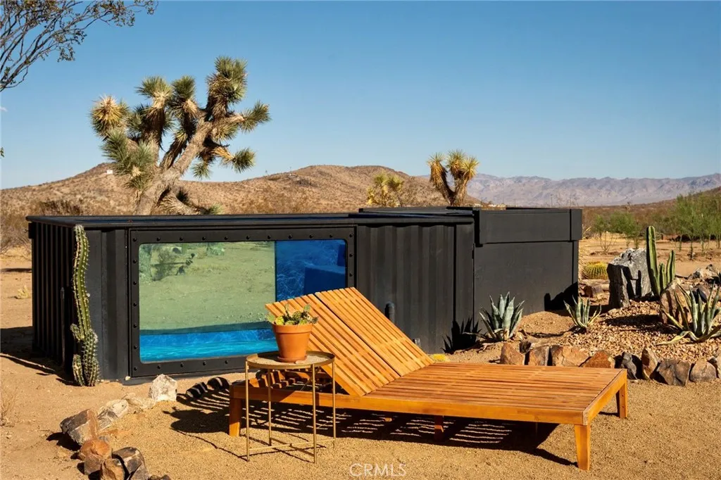 Welcome to SunDream, Yucca Valley. Set on five acres of open desert, SunDream captures over 100 miles of uninterrupted panoramic views. A glass pool, oriented east to west, is positioned to catch the shifting light at both sunrise and sunset. From here, snow-capped peaks in Big Bear rise to the north, while the High Desert stretches endlessly below nothing between you and the horizon but Joshua trees that have stood for over a century. The home, offered fully furnished, is intentional in both design and experience: two bedrooms, one bath, with every room oriented toward the surrounding landscape. Five custom sliding glass openings dissolve the boundary between indoors and out, allowing the desert to become part of the living space. The living room centers around a wood-burning fireplace and a deep-seat Lovesac Cloud sectional, offering both comfort and additional sleeping accommodations for a third guest. A hidden secondary bedroom is revealed behind a bookshelf door, furnished with a Casper queen bed and framed views of the eastern mountain range. The primary suite features a king-sized Casper bed and opens directly to an outdoor, eco-conscious desert shower finished with flagstone underfoot and biodegradable soaps, designed so water nourishes the surrounding succulents. The bathroom is a statement of its own pink tile, warm gold fixtures, a soaking tub, and dual showers creating a spa-like retreat to unwind after a day exploring the desert. The front patio and outdoor dining area, accessible from both the kitchen and living room, are immersed in a stillness so complete