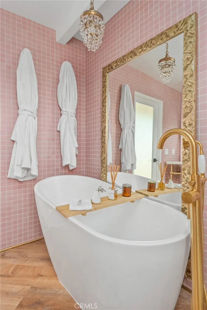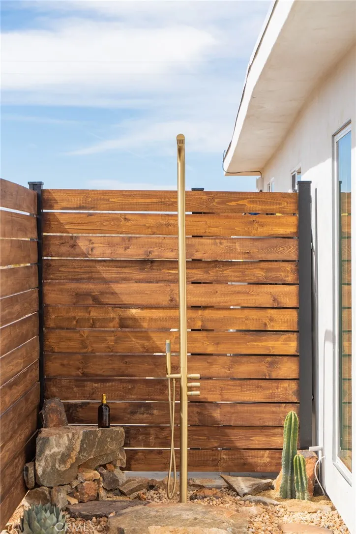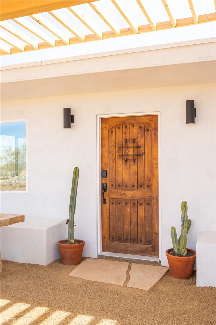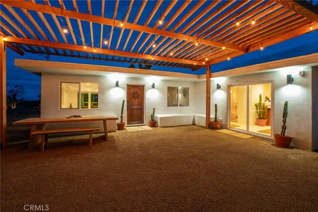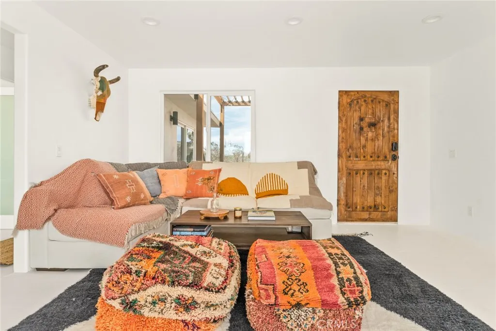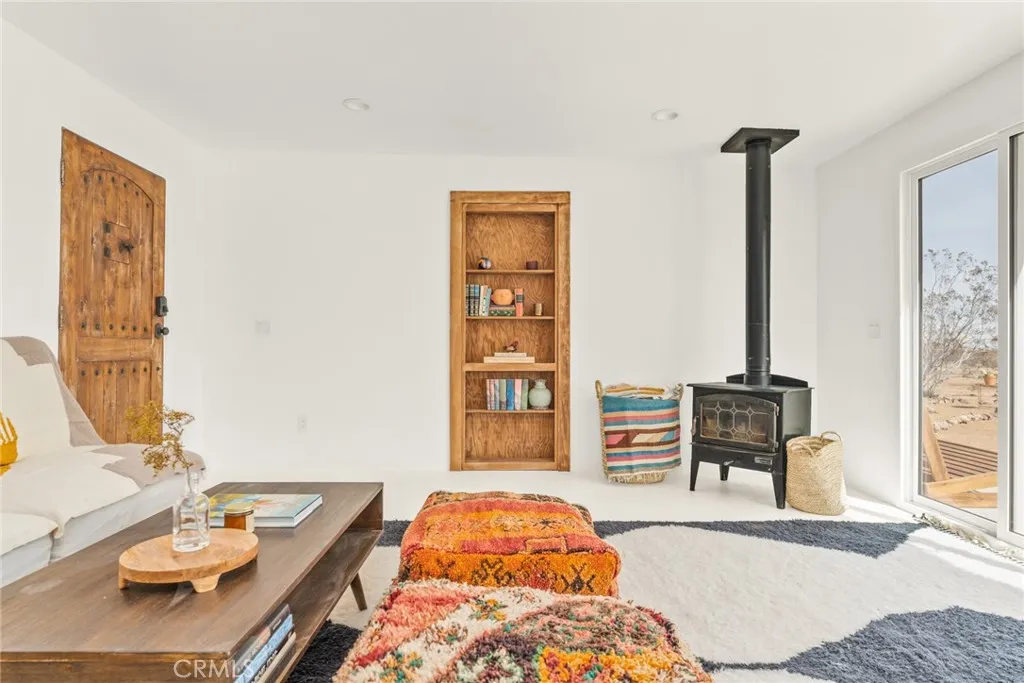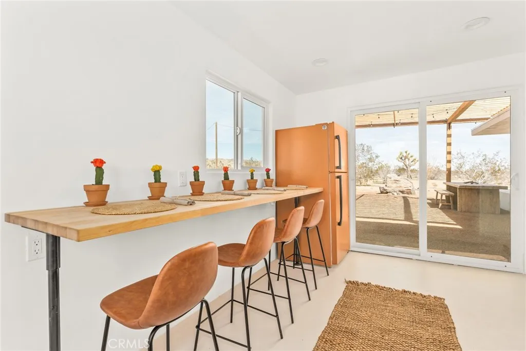 Welcome to SunDream, Yucca Valley. Set on five acres of open desert, SunDream captures over 100 miles of uninterrupted panoramic views. A glass pool, oriented east to west, is positioned to catch the shifting light at both sunrise and sunset. From here, snow-capped peaks in Big Bear rise to the north, while the High Desert stretches endlessly below nothing between you and the horizon but Joshua trees that have stood for over a century. The home, offered fully furnished, is intentional in both design and experience: two bedrooms, one bath, with every room oriented toward the surrounding landscape. Five custom sliding glass openings dissolve the boundary between indoors and out, allowing the desert to become part of the living space. The living room centers around a wood-burning fireplace and a deep-seat Lovesac Cloud sectional, offering both comfort and additional sleeping accommodations for a third guest. A hidden secondary bedroom is revealed behind a bookshelf door, furnished with a Casper queen bed and framed views of the eastern mountain range. The primary suite features a king-sized Casper bed and opens directly to an outdoor, eco-conscious desert shower finished with flagstone underfoot and biodegradable soaps, designed so water nourishes the surrounding succulents. The bathroom is a statement of its own pink tile, warm gold fixtures, a soaking tub, and dual showers creating a spa-like retreat to unwind after a day exploring the desert. The front patio and outdoor dining area, accessible from both the kitchen and living room, are immersed in a stillness so complete
