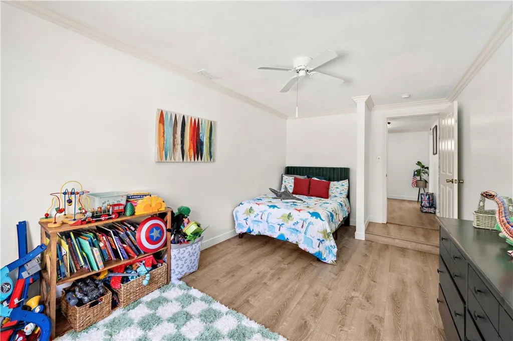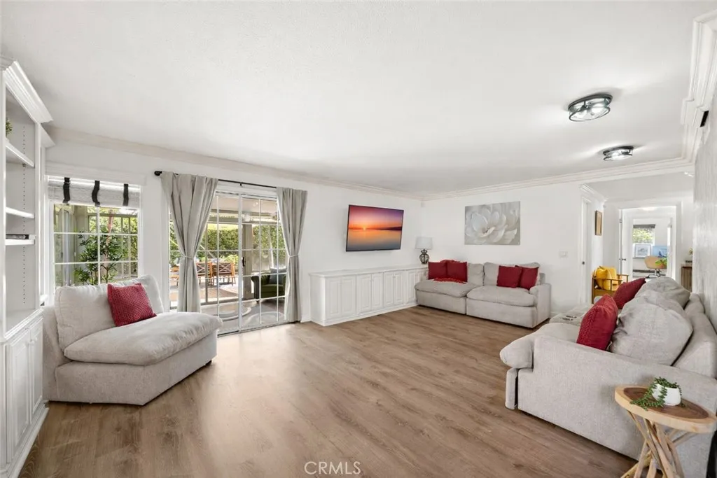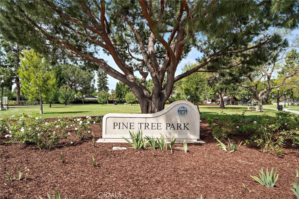 Ideally positioned in the heart of Tustin with quick access to shopping, dining, parks, and commuter routes, this beautifully designed single-level ranch-style home is tucked behind layers of mature landscaping and fencing that create a surprisingly private backyard retreat. Situated on an oversized 8,470 square foot corner lot that backs to the beautiful Pine Tree Park, this light-filled residence offers 4 bedrooms, 2 bathrooms, and over 1,700 square feet with wonderful flow for both everyday living and entertaining. A wide formal foyer welcomes you into the expansive wrap-around living room with fireplace, custom built-in entertainment cabinetry, and extensive built-in shelving, flowing seamlessly into the formal dining room and charming sunlit retro-style kitchen featuring a garden window, tile countertops, coffered ceiling with recessed lighting, white cabinetry with decorative niche shelving, and a breakfast bar. The home is beautifully appointed with wood laminate flooring, crown molding, raised panel interior doors, ceiling fans, central A/C, and a newer roof. French-style sliders open from the living room to a versatile sunroom (California room) that functions as additional indoor-outdoor living space, complete with TV hookups and walls of windows overlooking the spectacular backyard oasis. Designed for true Southern California living, the backyard feels like your own private resort with a sparkling pool featuring Baja-style coved seating, classic brick trim, and a diving board, surrounded by an expansive interlocking paver patio ideal for entertaining, outdoor dini