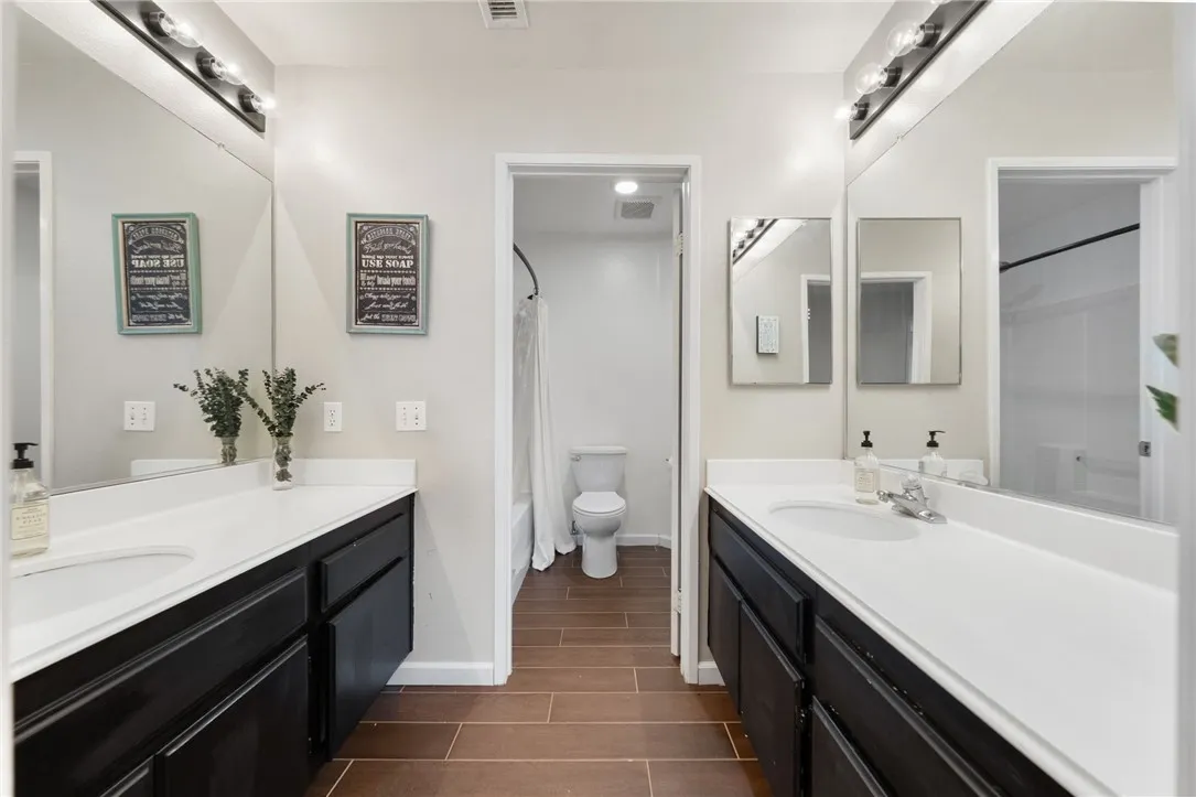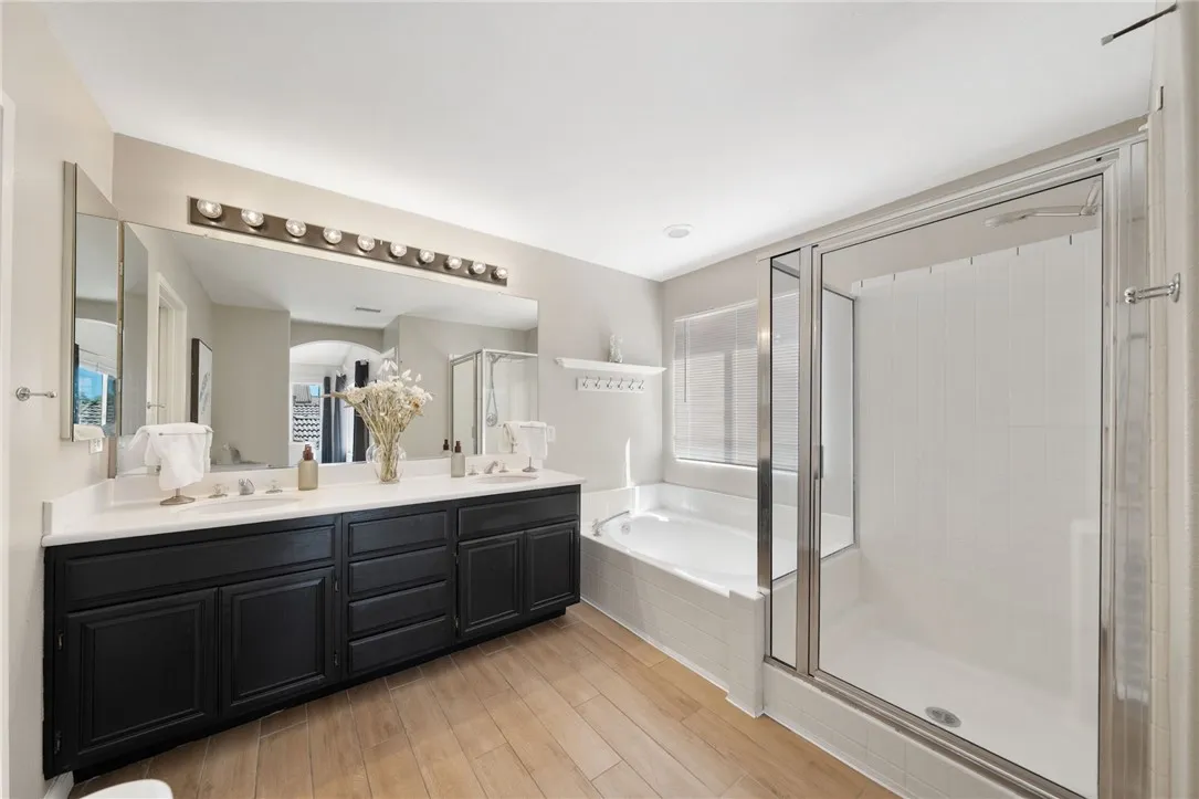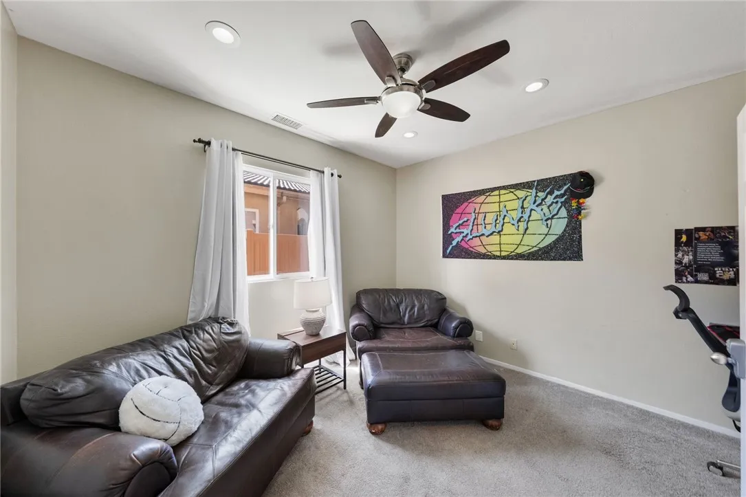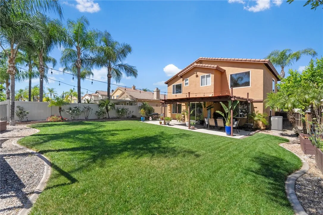 Welcome to your dream home in the highly sought-after Temeku Hills community! This beautifully maintained 5-bedroom, 2.5-bath home offers the perfect blend of comfort, style, and functionality. Featuring four spacious bedrooms upstairs and a versatile downstairs den that can easily serve as a fifth bedroom, this layout is ideal for families of all sizes. Step inside to find stunning wood-like tile flooring, a bright and spacious living room, and a formal dining area perfect for entertaining. The open-concept kitchen flows seamlessly into the inviting family room, complete with a cozy fireplaceperfect for relaxing evenings at home. Upstairs, the expansive primary suite offers a peaceful retreat with lovely views, a luxurious ensuite bathroom featuring a separate tub and shower, and a large walk-in closet. There are ceiling fans in all the bedrooms and family room, plus walk in closets in two of the secondary bedrooms upstairs. The upstairs guest bath is very roomy with vanities across from each other and lots of room for essentials. There is a convenient indoor laundry room and room for your vehicles in this spacious 3-car garage. Enjoy outdoor living in the beautifully landscaped backyard, complete with a patio cover and wrought iron fencing that backs to open spaceproviding both privacy and scenic surroundings. The home also includes leased solar for energy efficiency. As a resident of Temeku Hills, youll have access to resort-style amenities including a clubhouse, golf course, tennis courts, fitness center, and sparkling pool. The best part is the low HOA fees and low tax