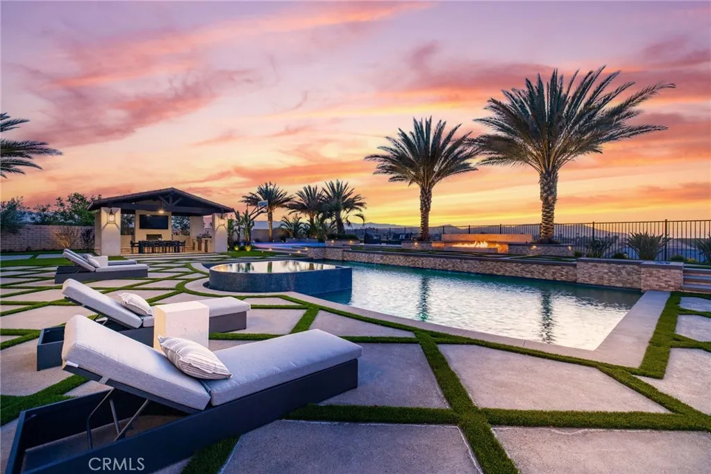 Commanding an unrivaled vantage point atop the most prestigious corner lot in Tramonte at Citrus Heights with breathtaking panoramic mountain and city light views, this masterfully remodeled estate represents the pinnacle of Riverside luxury, offering a level of sophistication and custom detail that far surpasses any neighborhood benchmark in the region. The interior is an architectural triumph, featuring intricate 8 crown moldings, 7 baseboards, luxury vinyl plank flooring, and custom shutters throughout. The chefs kitchen is a culinary masterpiece anchored by a 48 Sub-Zero refrigerator, Bertazzoni triple-oven range, dual Bosch dishwashers, and a massive seamless waterfall quartz island. Entertainment is redefined in the professional theater room with a 135 screen and 7.1 surround sound, while the formal living areas showcase stunning coffered ceilings and decorative paneling. A fully self-contained multi-generational suite offers a private entrance, separate 1-car garage, kitchenette, separate washer/dryer, and a marble-clad spa bathroom. The primary sanctuary is a true retreat, boasting a flush-mounted 85 TV integrated into a shiplap feature wall, a sleek electric fireplace, a boutique-style custom closet, and a private balcony overlooking the city lights. Outside, a five-star private resort awaits: a 45-foot pool with an infinity-edge spa, an outdoor entertainment pavilion with a full kitchen and fireplace, a regulation-size basketball court, RV gate, pet friendly turf area, and an expansive multi-hole putting green, all framed by 11 mature date palms and custom travert