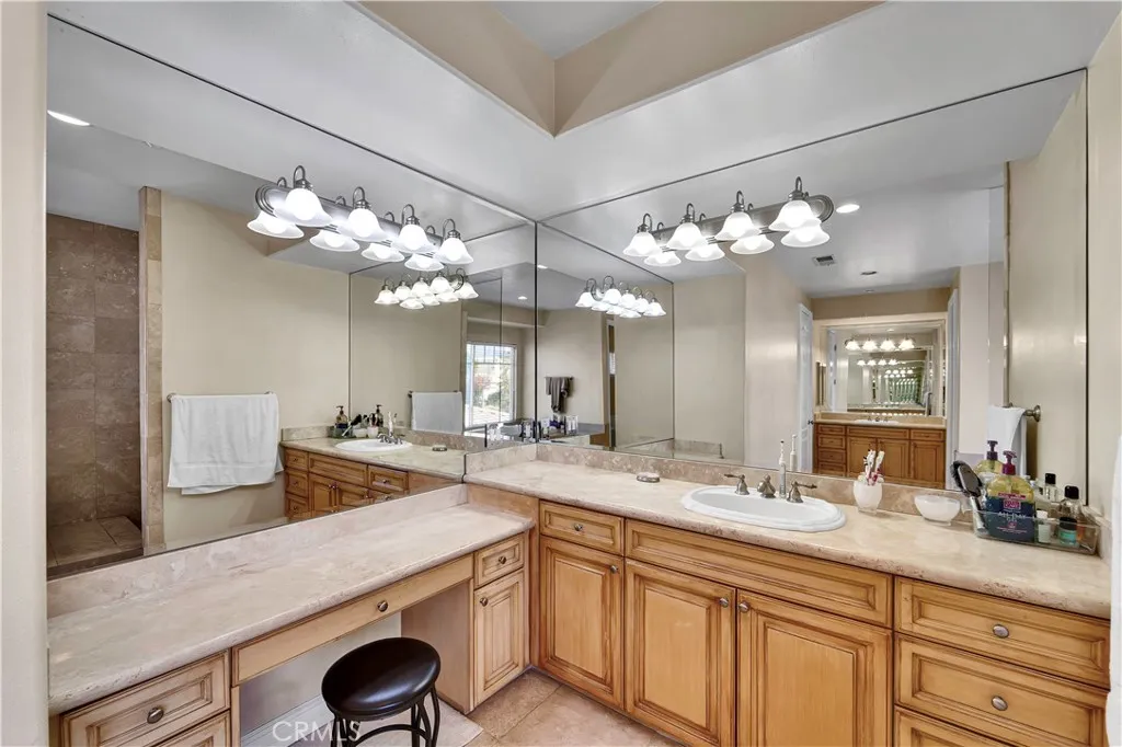 Set behind the gates of Trammell Estate, this Porter Ranch home makes an immediate impression. Enjoy panoramic mountain views and San Fernando Valley city lights stretch across the horizon, visible from both indoor and outdoor living spaces. The entry sets the tone: carved wood doors open to a two-story foyer finished in travertine that carries through the main level. A step-down living room with a fireplace and custom drapery flows into an expansive family room, while an upstairs loft offers flexible space for a media room, home office, or playroom. Five bedrooms and 5.5 baths are spread across the home, with a full guest suite conveniently located on the main floor. The kitchen is built for serious entertaining with an oversized island with a built-in sink, high-end appliances, and generous cabinetry make it as functional as it is well-appointed. Outside, the flat half-acre lot has been put to excellent use. A custom pool and spa, gazebo, fire pit, built-in BBQ, and a large covered patio surround a wide grassy lawn. A wonderful setup that works equally well for a quiet evening or a large gathering. Minutes from top-rated schools, premier shopping, fine dining, and freeway access, this is a well-located, well-appointed estate in one of the valley's most desirable communities.
