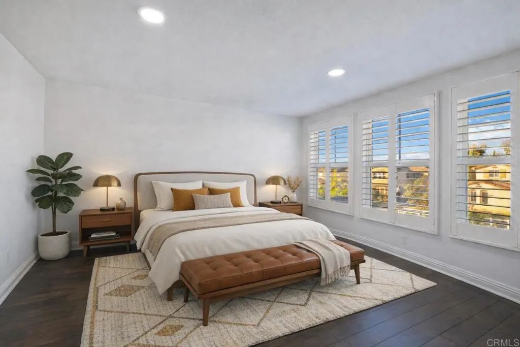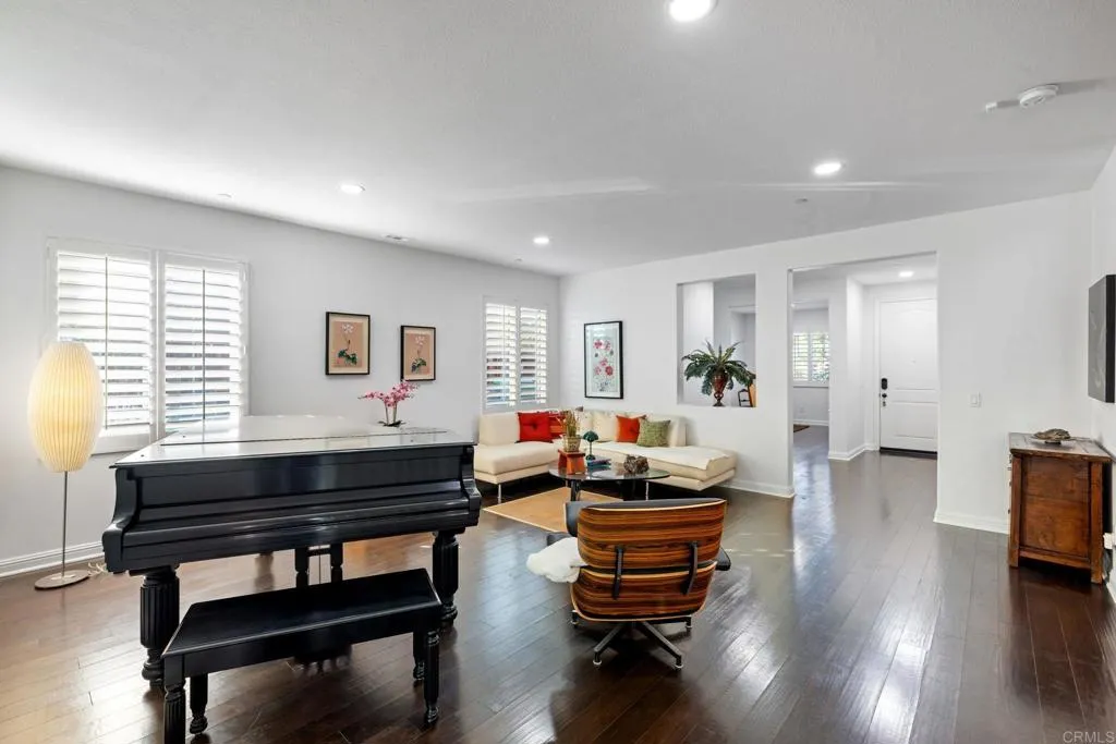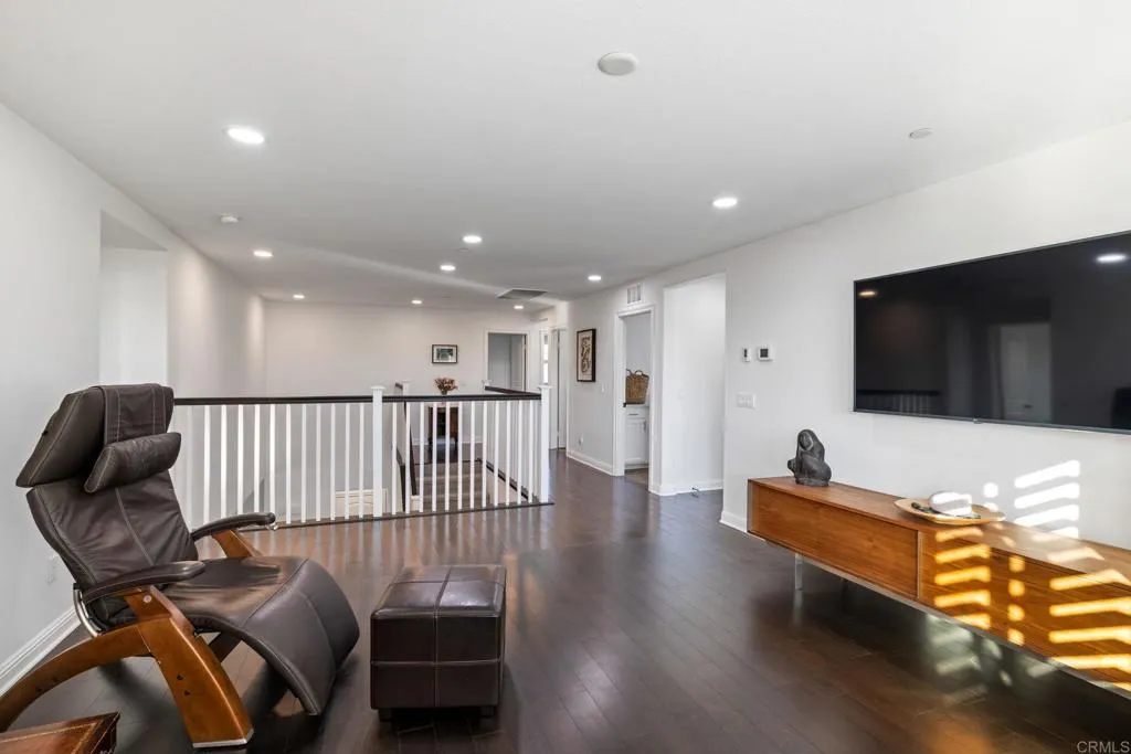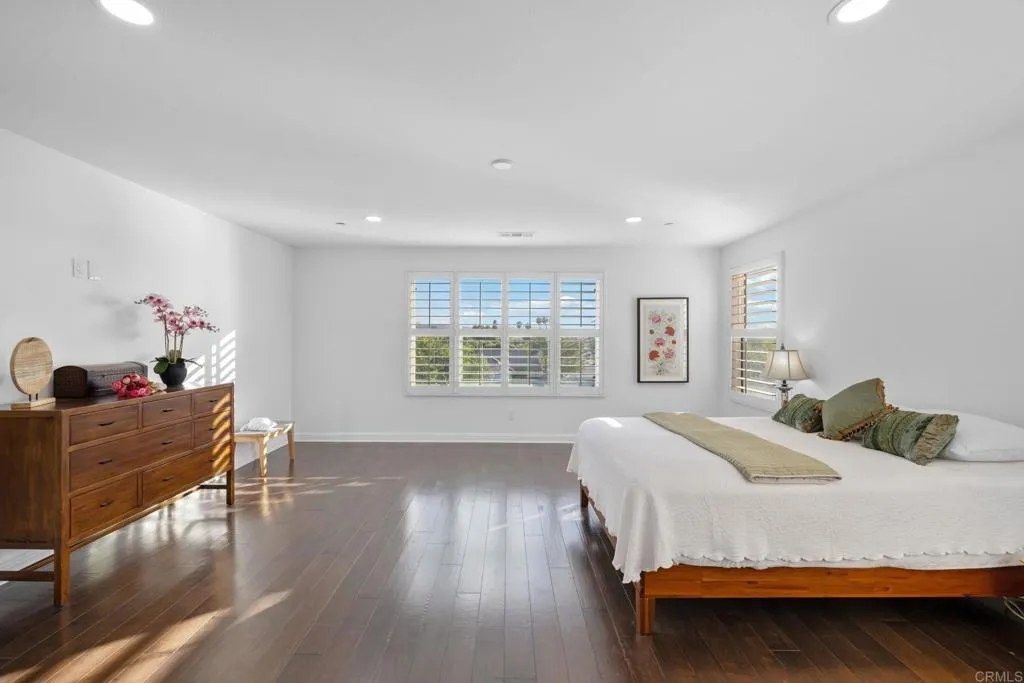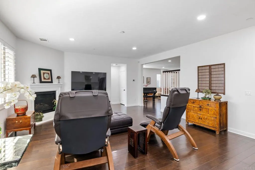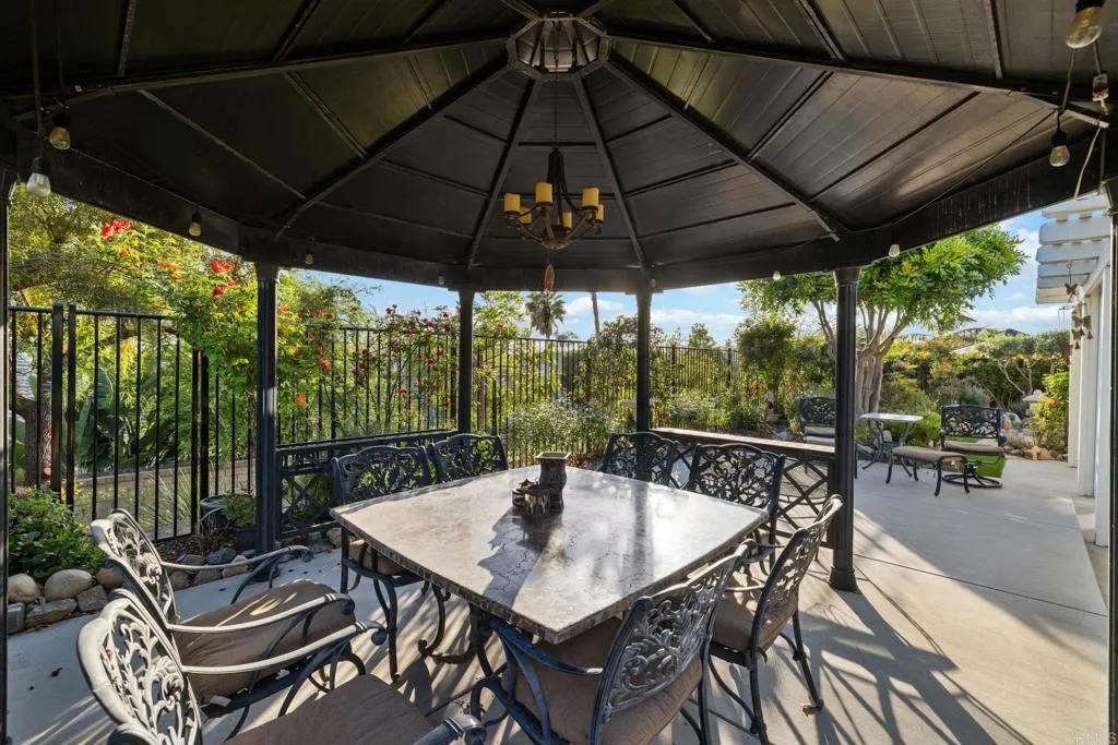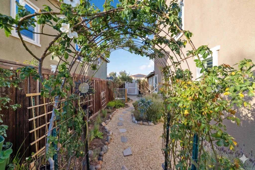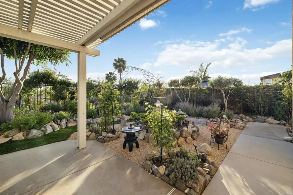 Welcome to this beautifully upgraded 5-bedroom, 3.5-bathroom home in the highly desirable Marisol community of Oceanside. Situated on a quiet cul-de-sac, this expansive 3,855 sq ft residence sits on an elevated, over 10,000 sq ft lot, offering enhanced privacy and sweeping views of rolling hills, treetops, and vibrant sunsets. Step inside to an open-concept floor plan featuring high ceilings, rich wood flooring, and seamless indoor-outdoor flow. The heart of the home is a stunning modern gourmet kitchen designed for both everyday living and elevated entertaining. Showcasing premium Silestone Calacatta quartz countertops with a full backsplash, Thermador Proline appliances, and a double oven with steam function perfect for bread baking and gourmet cooking, this space is as functional as it is beautiful. Custom modern European cabinetry with frameless construction, concealed hardware, and seamless full overlay doors creates a sleek, sophisticated look, while combined with 33 oversized soft-close drawers provide exceptional storage. A spacious walk-in butlers pantry enhances the kitchen even further, complete with heavy-duty built-in shelving, wine rack, and large pull-out baskets. The spacious great room opens to a lush, meticulously landscaped backyard designed for relaxation and entertaining. Enjoy a variety of garden spaces including a Zen garden, vibrant seasonal flowers, climbing roses, and mature trees. Entertain under the oversized aluminum pergola or gazebo while taking in expansive valley views. The property also features an impressive collection of fruit trees inclu