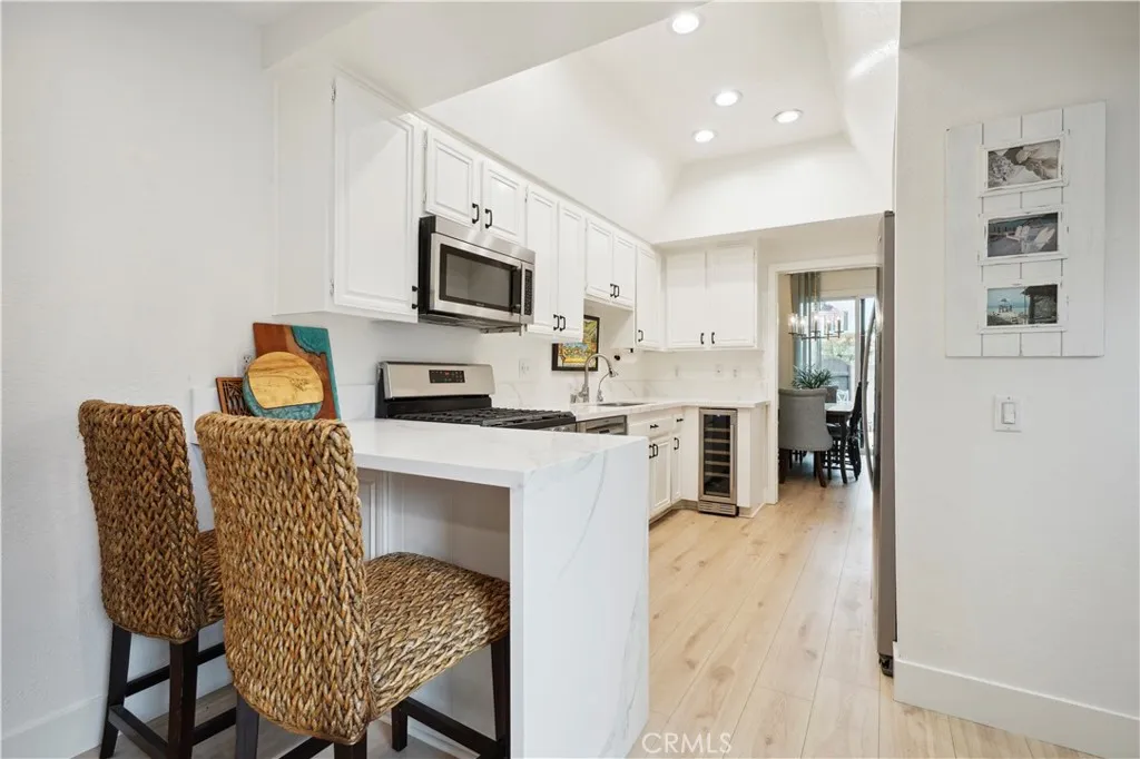 Beautifully remodeled coastal retreat in the prestigious, gated Las Fuentes community of Huntington Harbour. This 3-bedroom, 2.5-bath home features soaring 10-foot ceilings, new dual-pane windows (2022), upgraded electrical panel, and premium waterproof laminate/vinyl flooring throughout. The updated kitchen offers quartz countertops, stainless steel appliances, a built-in microwave, full-size refrigerator, dishwasher, and wine fridge, plus a cozy breakfast nook and direct access to the attached two-car garage. The open layout flows into a dining area with fireplace and sliding doors leading to a private patio with lush landscaping, lemon and lime trees, and a gas BBQperfect for outdoor living. Upstairs, the spacious primary suite includes vaulted ceilings, a private balcony, sitting area, a walk-in closet, dual vanities, and an upgraded walk-in shower. Two additional bedrooms share a balcony and a fully remodeled bath April 2026, with convenient upstairs laundry. Additional features include a remodeled powder room, ample storage, a water purifier, Levelor blinds, new front entry hardscape, and recent termite and stucco work. Enjoy added privacy with no rear neighbor. Community amenities include a pool, sauna, and beautifully maintained grounds. Ideally located near Huntington Harbour Mall, local dining, shops, and just minutes from the water for kayaking, paddleboarding, and beach days, with easy access to top schools, parks, freeways, and Long Beach Airport.