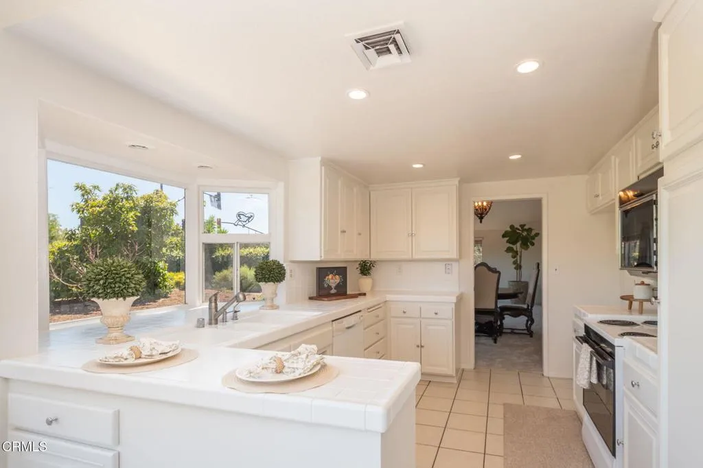 This Classic 1966 Two story home in Thousand Oaks has been beautifully refreshed, blending its original architectural character with clean, modern updates. With 2,600 Square feet of living space, the interior feels exceptionally bright and open, thanks to a fresh coat of neutral paint and brand new carpeting throughout. The home opens with a sense of drama and scale. The entry foyer leads into a spacious living room characterized by vaulted ceilings and large windows that flood the space with natural light. A standout feature is the floor-to-ceiling white brick fireplace, which serves as a sophisticated focal point. The adjacent dining area, under an elegant chandelier, offers a seamless flow for entertaining. The Kitchen maintains a crisp, 'all white' aesthetic with painted cabinetry and tile countertops. It is designed to take advantage of the 12,632-square-foot lot, featuring a large bay window over the sink and expansive wrap-around windows in the breakfast nook that offer panoramic views of the lush backyard and mature avocado, orange, and lemon trees. A short flight of stairs leads to the lower level, which is perfectly set up as an entertainer's hub with your own speakeasy. The double-sided fireplace creates a cozy atmosphere in the secondary lounge. Large sliding glass doors provide direct access to the back patio, creating your indoor-outdoor flow. The Convenient half bath featuring a modern black vanity top is the perfect powder room. The upper level provides a primary suite with vaulted ceilings and a large picture window. The en-suite bathroom includes a double