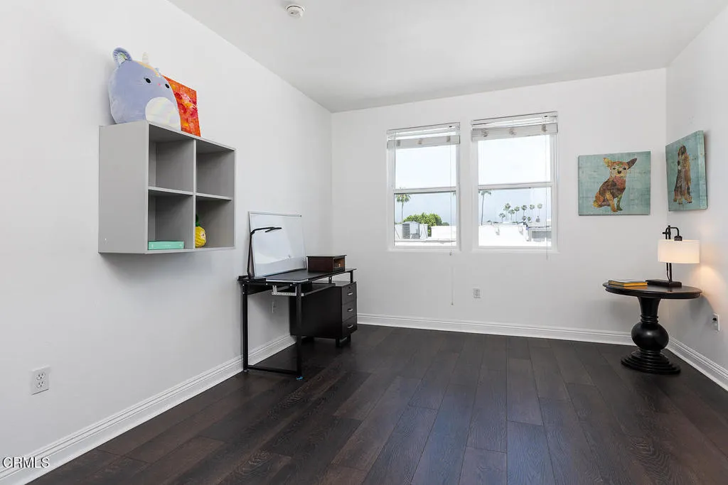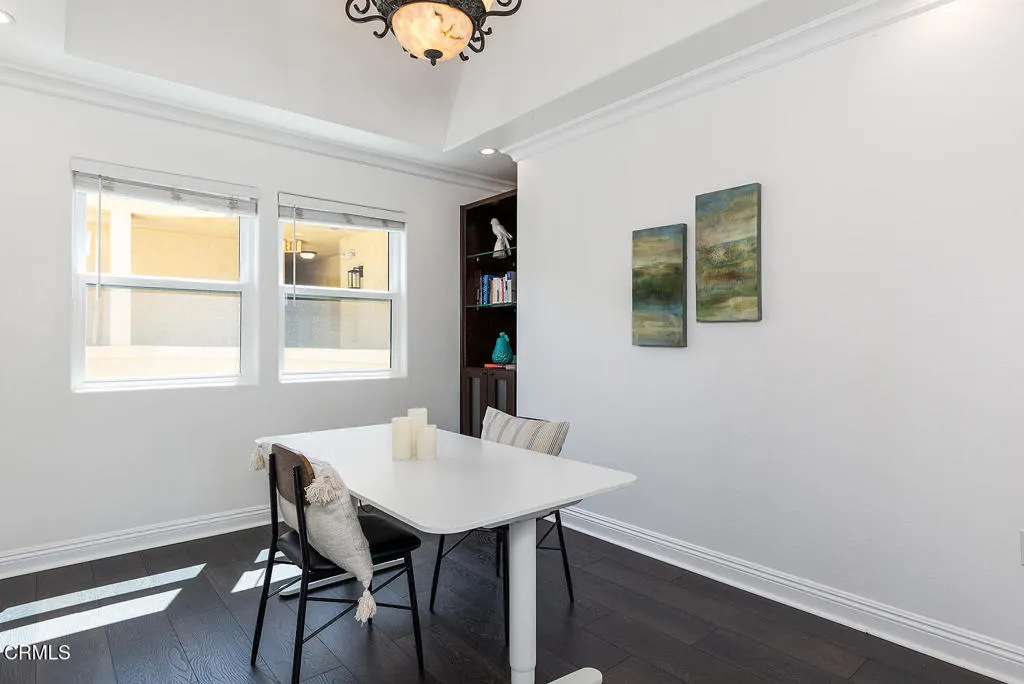 Right in the heart of Valley Village is this trendy top-floor condo. As a bonus to this unit, outside the front door is a shared patio area with barbeque. Inside, luxuriate in the massively high ceilings and abundant natural light. The open floor plan features a living room area with a 20-foot high ceiling, recessed lights, crown and baseboard molding, natural wood laminate flooring, gas fireplace with attractive wood mantel, 10-foot high sliding glass doors--with more windows overhead--that open out to the balcony where one can relax and watch the sun set on the San Gabriel Mountains. The kitchen, with breakfast bar, has large tile flooring, granite counters, plenty of wood cabinets, stainless steel appliances including a Whirlpool dishwasher, Frigidaire 4-burner gas stove, GE microwave and GE refrigerator. There's also a double porcelain sink with water filter and gooseneck faucet. The dining room with a high ceiling has an impressive wrought iron chandelier and built-in shelves and cabinet. There are two bedrooms on opposite sides of the unit for maximum privacy. The primary bedroom has a 20-foot high ceiling, crown and baseboard molding, two separate closets with mirror sliding glass doors, natural wood laminate flooring and plenty of natural light. Its full bathroom includes a skylight, shower over bathtub with sliding glass doors, Kohler toilet, single sink vanity, and tile floor. The other bedroom has two good-sized windows with medium-slat Venetian blinds, a large closet with mirror sliding glass doors, and baseboard molding. The full second bathroom in the hallway