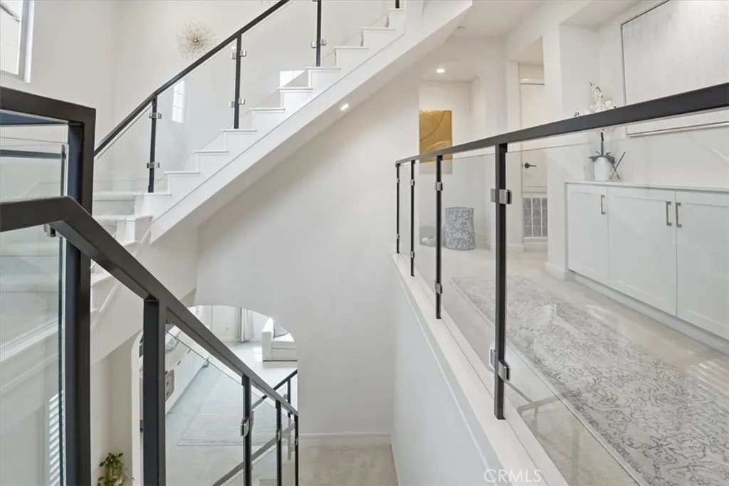 Discover this remarkable 4-bedroom, 4.5-bath home nestled in the prestigious Sierra enclave of Portola Springs. You are greeted by an impressive entryway featuring lofty ceilings and abundant natural light. Ascend the stunning custom glass staircase through a striking three-story atrium, where sunlight dances in brilliant patterns and rainbows, filling the space with an uplifting energy. The expansive open-concept great room seamlessly transitions into a gourmet kitchen adorned with Bosch appliances, quartz countertops, shaker cabinets, and stylish lighting. Each bedroom boasts its own en-suite bath, while the opulent primary suite offers a luxurious soaking tub, glass shower, dual vanities, and a generously sized walk-in closet. Perfect for multigenerational living, the main level includes a private en-suite, and the top-floor bonus room comes equipped with a kitchenette, powder bath, and adaptable space ideal for a home gym, office, or relaxation area. Additional highlights include paid-off solar, an EV charger, smart home enhancements, and custom shutters. The community offers an impressive array of amenities featuring over 15 resort-style parks, pools, scenic trails, and highly-rated Irvine Unified schools. This unique and move-in ready residence exemplifies elevated living at its best.