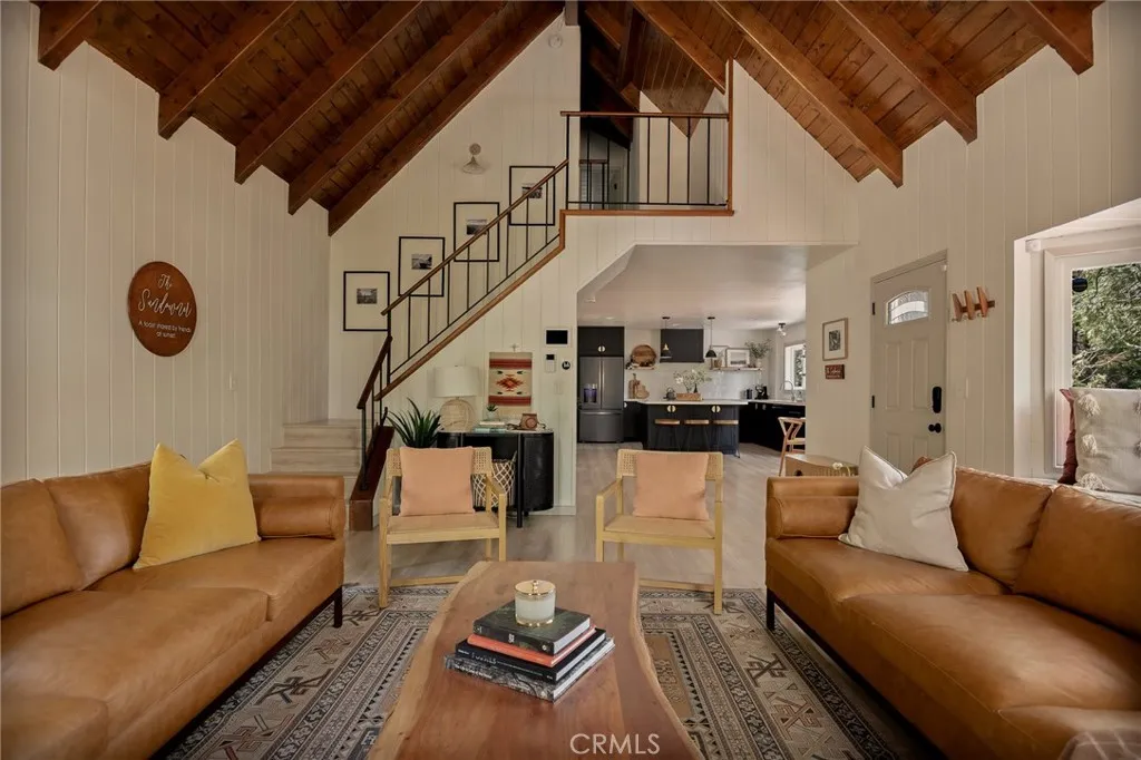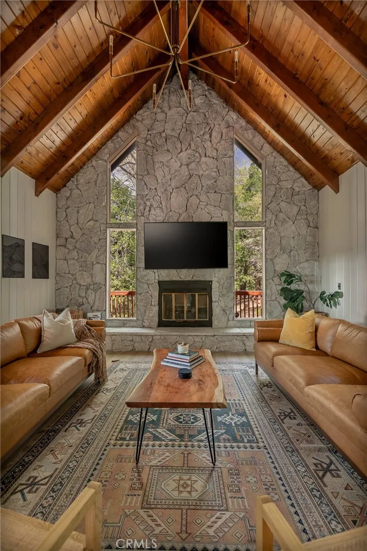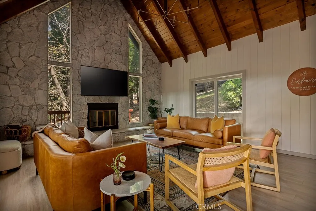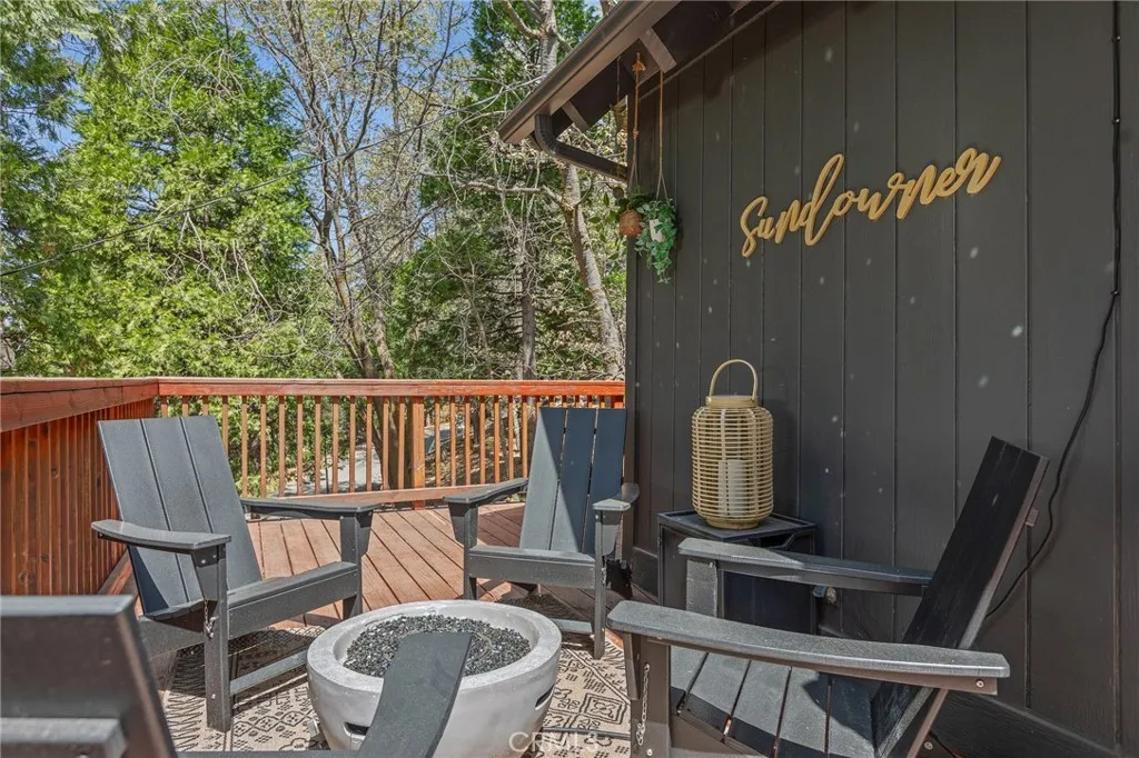 Perched up on the hillside you will find this stunning remodeled home located close to the Lake Arrowhead Village and Hwy 18. Enter in to this stunning high vaulted ceiling open floor concept home with primary bedroom on the main. Home was remodeled in 2020 and boasts an equipped kitchen with Calacatta Quartz counters, black stainless appliances, and a sliding glass door that leads to the expanded front near wrap around deck. The main living room boasts a large rock wall that exudes the focal point of the room. The back area has a covered private spa area that allows you to take in the mountain surroundings. Upstairs is 2 more bedrooms with high ceilings, and a bath. Home has been a successful Airbnb and has been used for multiple catalog branding shoots. Home has been updated with Dual Pane windows, and Pergo WetProtect flooring along with a curated style to exude the current trend. Home comes furnished and is located in Lake Rights. You will find lots of privacy on this lot, tucked in with the cedars, oaks, and dogwoods. Don't let this one pass you up.