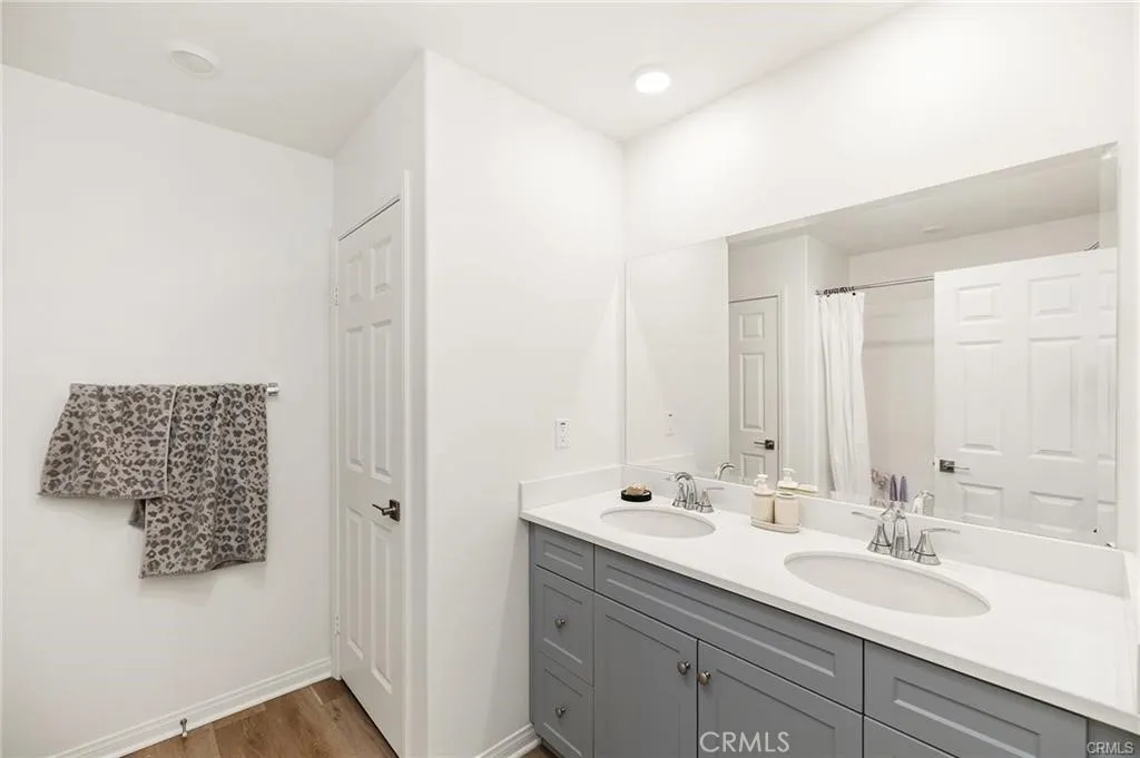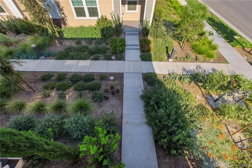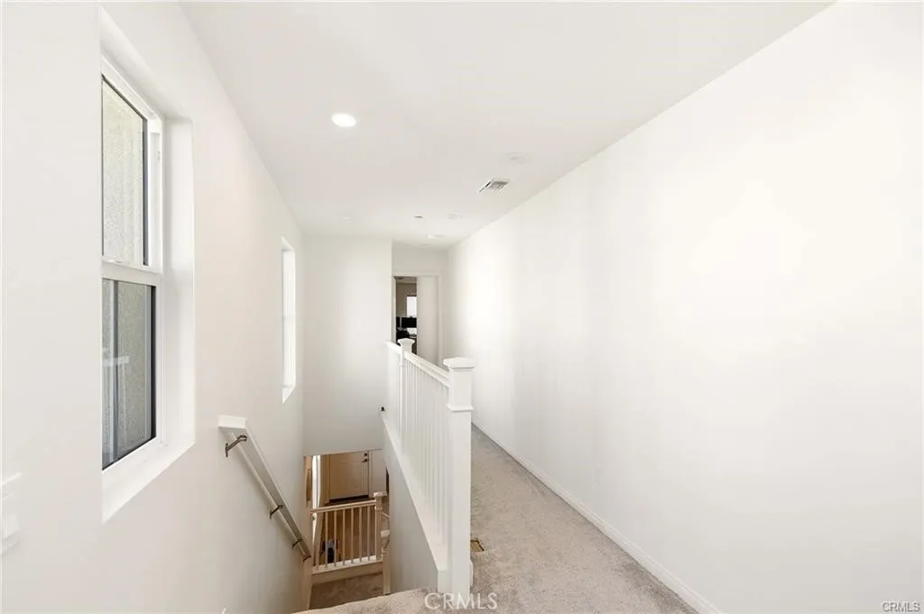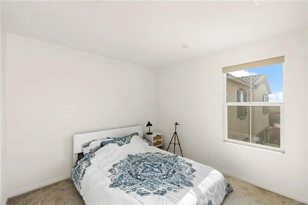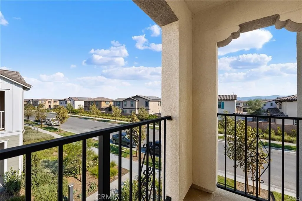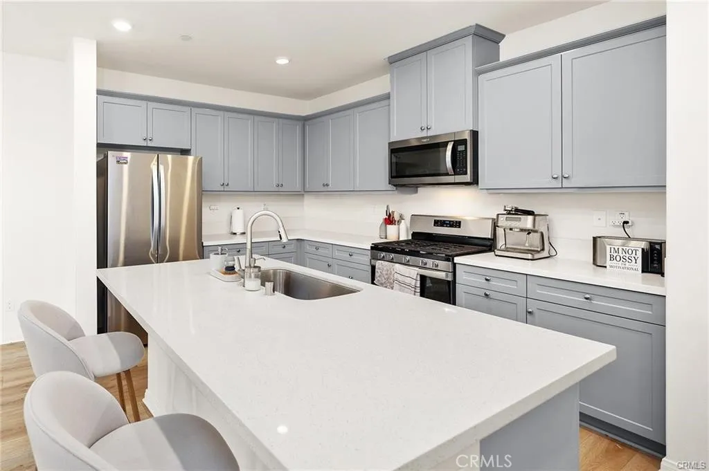 Experience refined living at Belmont at Sunset Ranch, a thoughtfully designed enclave in the vibrant community of Ontario Ranch. This sophisticated 3-bedroom, 2.5-bath residence blends modern design with effortless comfort, offering a polished yet highly livable space. Positioned as a premium end unit with ideal southern exposure, the home is filled with soft, natural light throughout the day. A private 2-car garage is complemented by convenient guest parking nearby, creating both ease and flexibility for residents and visitors alike. Upon entry, soaring 9-foot ceilings and an open-concept layout set the tone for a bright, expansive interior. The main level is curated for both everyday living and entertaining, where the living, dining, and kitchen spaces flow seamlessly together. The kitchen serves as a true centerpiece, appointed with elegant cloud-toned shaker cabinetry, a generous island, walk-in pantry, and sleek quartz surfaces. A suite of Whirlpool stainless steel appliancesincluding a slide-in gas rangeadds both function and sophistication, while luxury vinyl plank flooring enhances the clean, contemporary aesthetic throughout. Upstairs, a versatile loft offers a secondary lounge or workspace, thoughtfully separating the private quarters. Two well-proportioned secondary bedrooms share a beautifully appointed bath featuring dual vanities and a full tub/shower combination. The primary suite is designed as a tranquil retreat, complete with a spacious walk-in closet and a spa-inspired bath with dual sinks, cultured marble finishes, and a walk-in shower. A private balcony