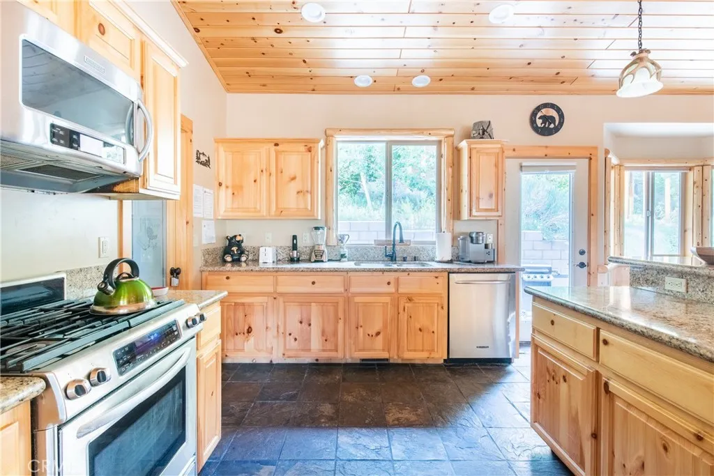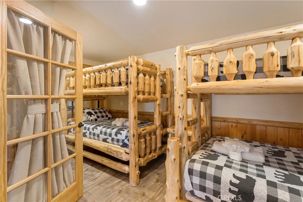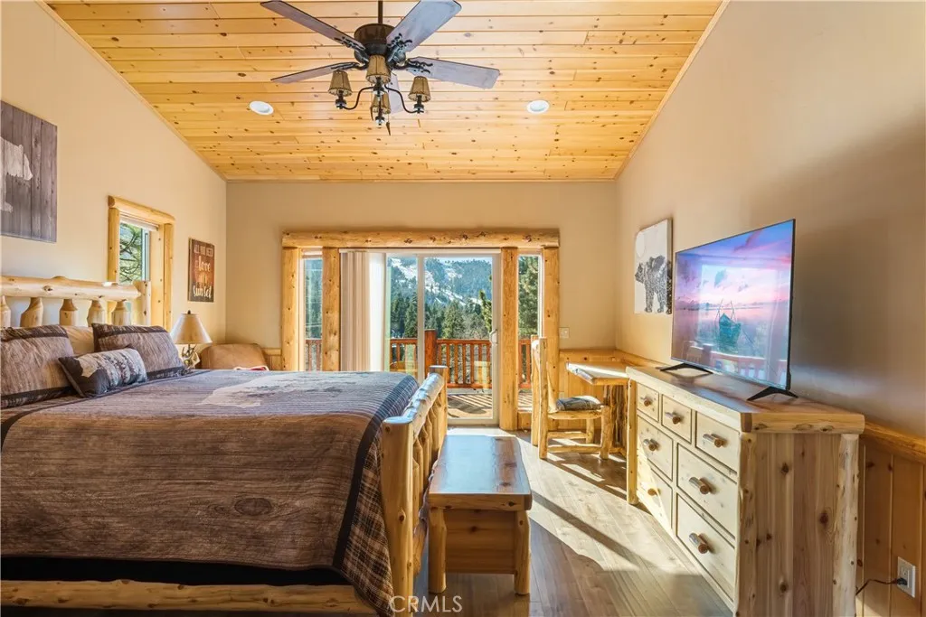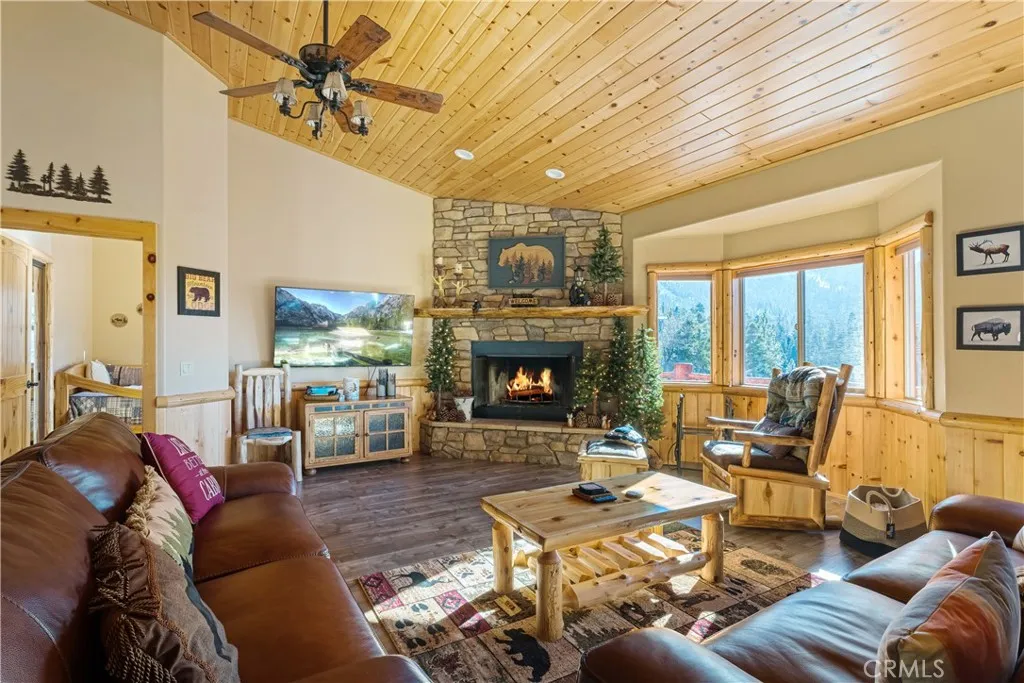 Majestic Views!! Tucked away on a quiet cul-de-sac in Moonridge, this 4-bedroom log-style retreat captures sweeping ski slope views and a premier mountain setting. Designed with an open-concept layout and multiple gathering spaces, the home offers room for everyone to relax, entertain, and create lasting memories. The main level features a spacious great room with vaulted T&G ceilings, a well-appointed kitchen with granite countertops, and a generous primary suite with stunning views, a private en-suite bath, and separate shower and tub. Two additional bedrooms and a dedicated laundry room provide comfort and functionality with thoughtful separation. Downstairs, the remodeled game room and newly permitted fourth bedroom add flexibility for guests and entertainment. Recent upgrades include new premium water-resistant laminate flooring, new carpet, recessed lighting, a tankless water heater, new furnace, and a 240v EV charger. Step outside to the expansive redwood deckperfect for dining, unwinding, and taking in the surrounding valley views. An oversized garage with direct access offers convenience and ample storage. Ideally located near Bear Mountain Ski Resort, the Moonridge Zoo, National Forest, and all the amenities of the Moonridge corridor, this property combines lifestyle, comfort, and proven rental potential.