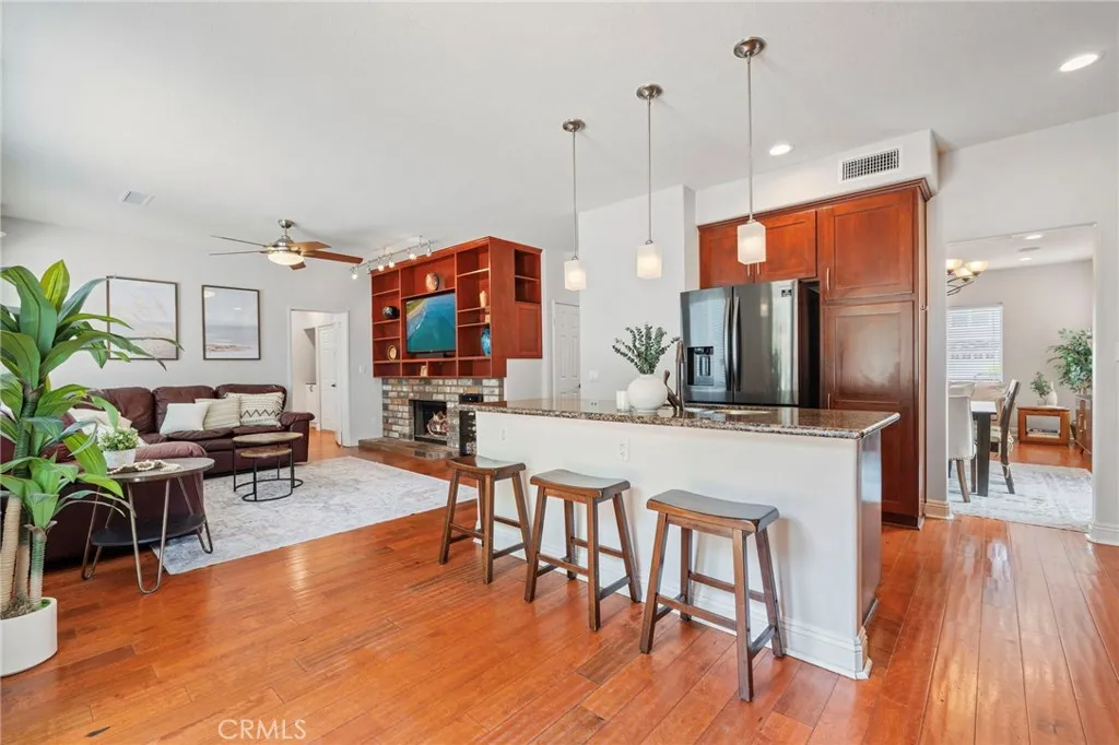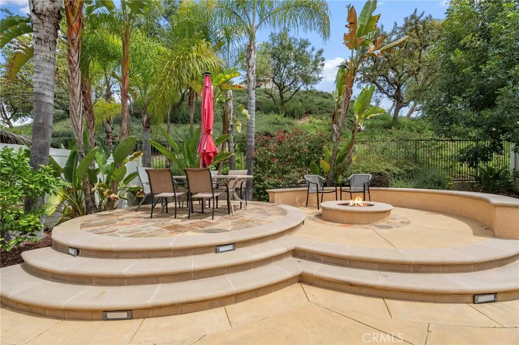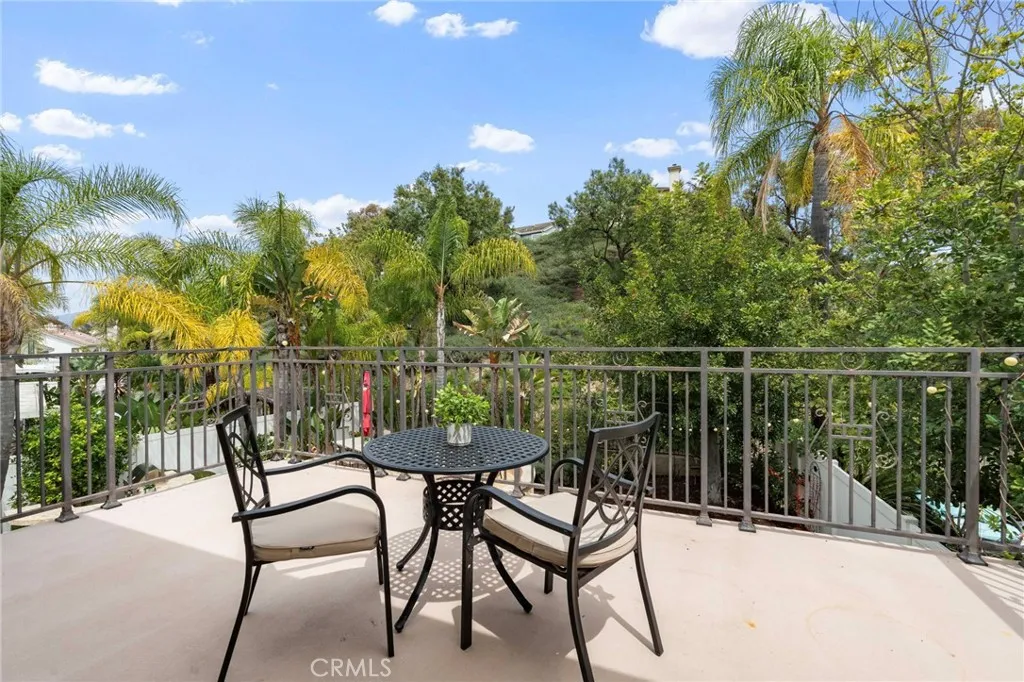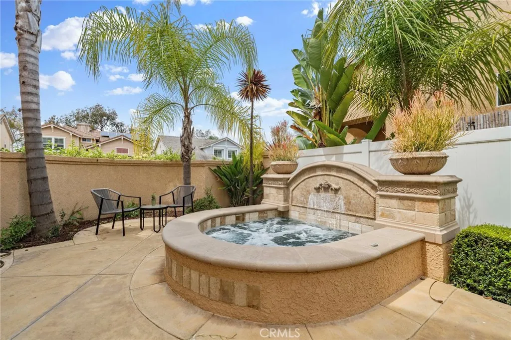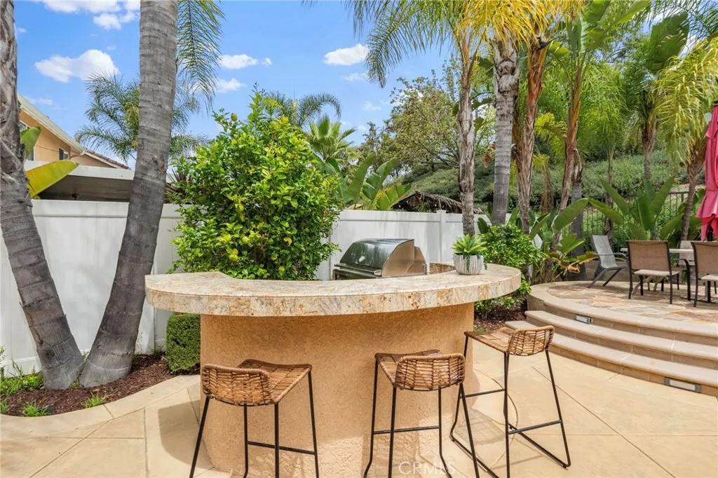 Nestled at the end of a double cul-de-sac in the highly sought-after Las Flores community of Rancho Santa Margarita, this warm, inviting, move-in ready 5-bedroom, 2.5-bath home offers flexible living space with rich hardwood floors, solid wood cabinetry, and updated finishes throughout. From the moment you enter, elevated ceilings and a distinctive octagonal tray ceiling detail set the tone for the charm and elegance found throughout. The bright, inviting open-concept kitchen and family room features granite counters, a beautiful mosaic backsplash, and picturesque views of the backyard oasis and lush greenbelt. A downstairs bedroom provides ideal flex space for a home office or guest room. Upstairs, the primary suite is a true retreat with a private balcony, an updated bath with separate soaker tub and shower, dual sinks, and generous closet space. Three additional bedrooms share an updated hall bath with shower and dual sinks, and the laundry room is conveniently located on the same level. Your private backyard oasis features a spa, built-in BBQ with outdoor kitchen, fire feature, and plenty of room to entertain on your own sunny slope under the California sky. Thoughtfully upgraded throughout, this home includes a whole-house PEX repipe, an American Standard Platinum heating and cooling system with updated ductwork and heat pump, and an EV-ready garage with an electric vehicle charger. The prepaid solar lease transfers to the new owner no monthly payments, with service and maintenance included providing energy efficiency and long-term savings. Located in the heart of La