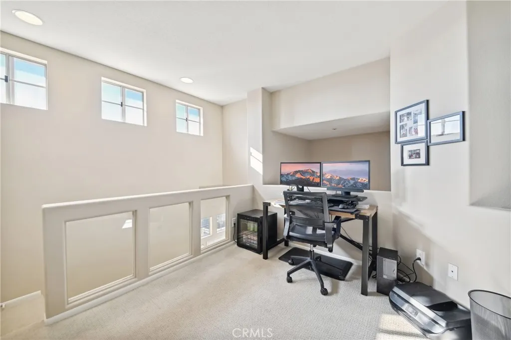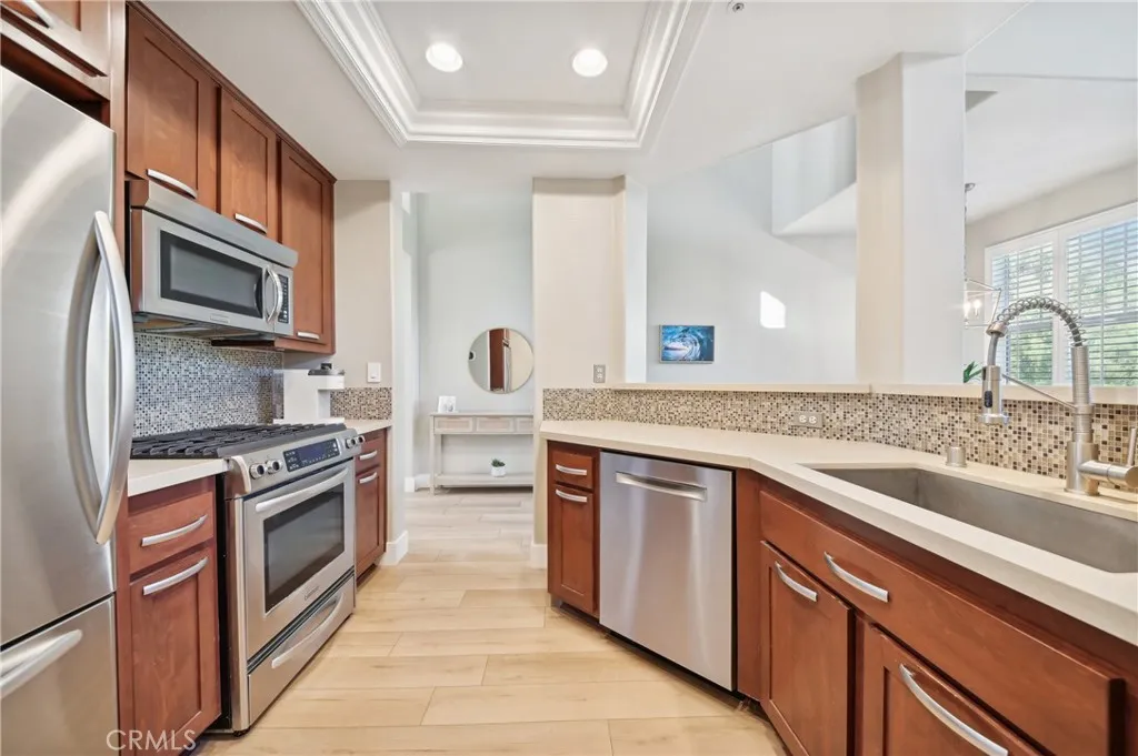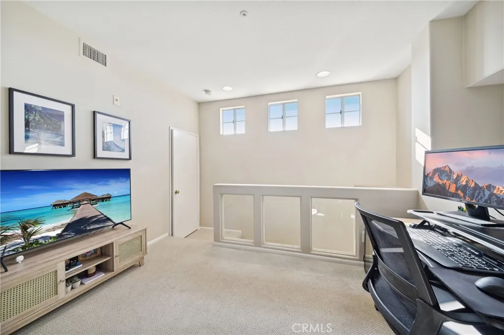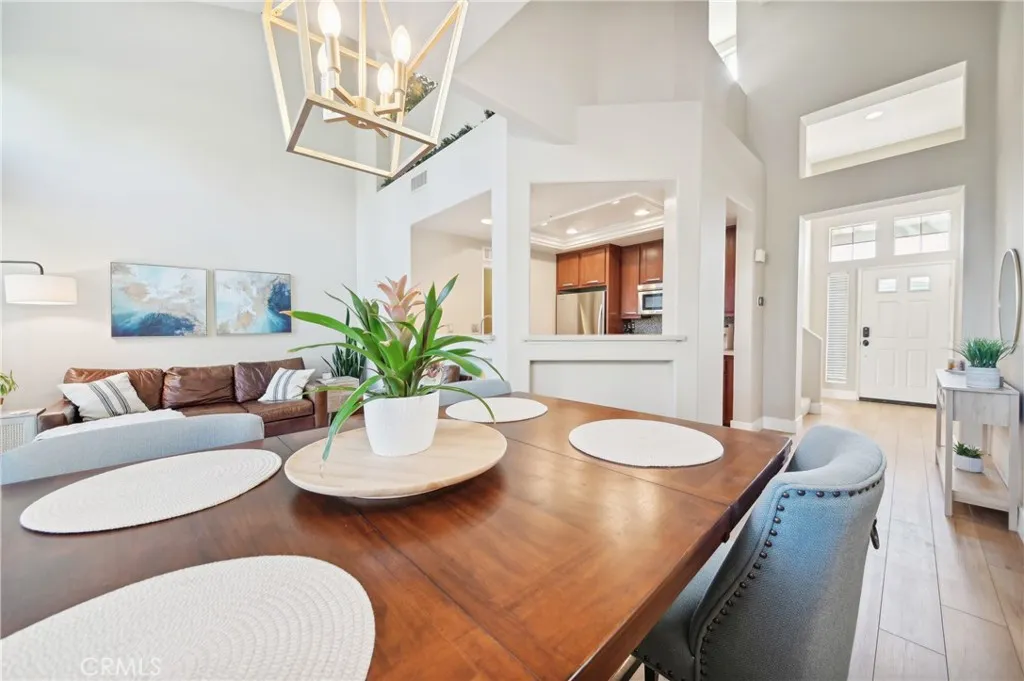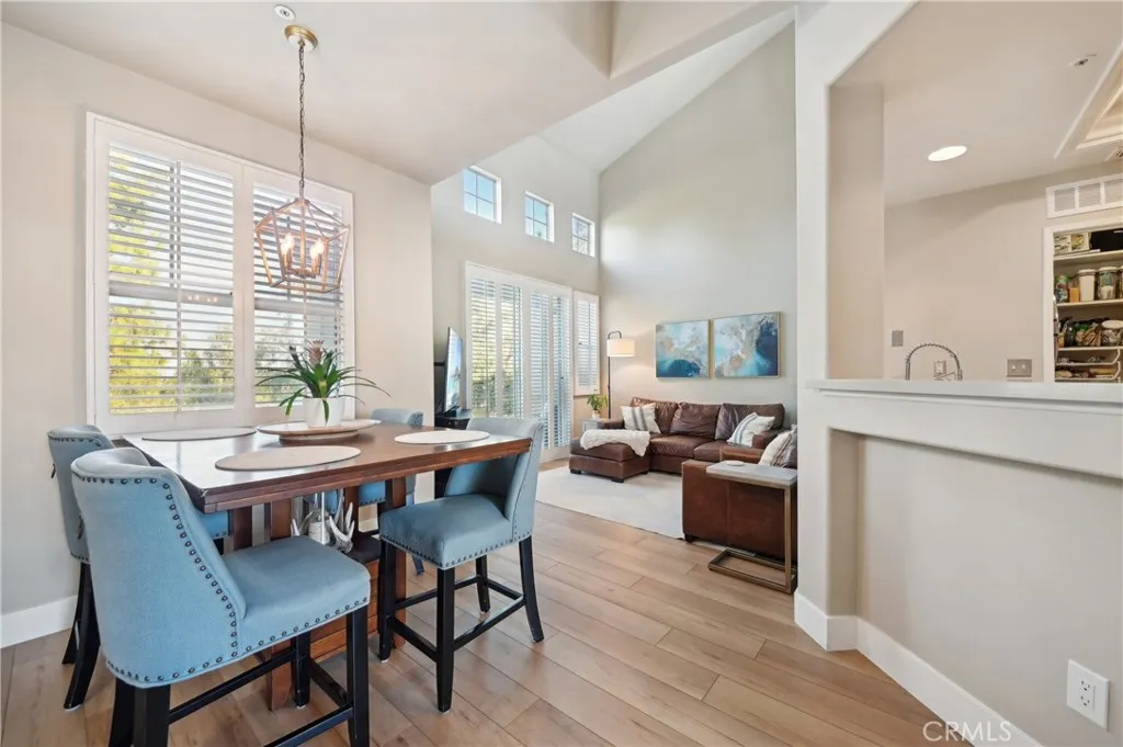 Welcome to the Vistas community in picturesque Aliso Viejo! This exquisite third-level penthouse condo features a generous living space, comprised of one bedroom plus a loft/office and a bathroom. The bathroom has been recently updated, showcasing a spacious walk-in shower, a new vanity, and elegant countertops. The open floor plan, complemented by soaring vaulted ceilings, ensures an abundance of natural light fills every room. Enjoy the serene tree-top views from your private patio. The kitchen, tastefully modernized, is equipped with stainless steel appliances and quartz countertops, making it a delight for cooking. A laundry room with a brand-new LG washer and dryer is conveniently situated on the main floor. Recently installed beautiful white Oak Coretec luxury vinyl plank flooring enhances the main level. The loft upstairs serves as an ideal home office space or guest bedroom. Additionally, there is a detached one-car garage featuring a new Chamberlain garage door opener with a quiet belt, along with one assigned parking space. A new water heater and an energy-efficient HVAC system were installed in 2024. The community is conveniently located near the famous Top of the World hiking and biking trails, Canyon View Park, shopping, dining, and entertainment. It also offers a pool, spa and gym for residents enjoyment. Dont miss out on this remarkable property; it wont be available for long!