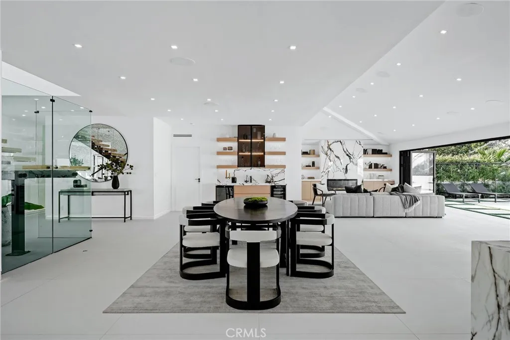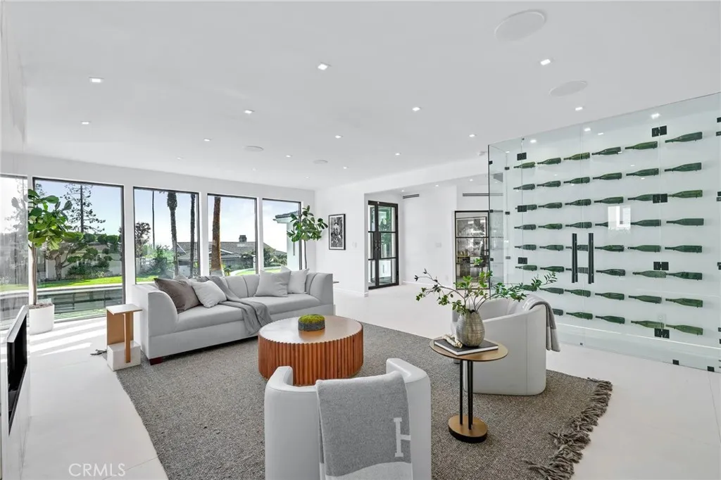 Perched above the coastline with sweeping ocean and Terranea Resort views, the property is an exquisitely designed and thoughtfully curated contemporary residence just moments from a world-class, Pete Dye-designed golf course. Entering the main level, the home unfolds through a light-filled open floor plan defined by vaulted beamed ceilings, Italian porcelain flooring, and expansive windows that frame the coastal backdrop. At the heart of the home, a custom Snaidero kitchen appointed with Thermador appliances features a large center island with breakfast bar seating, complemented by a sunlit breakfast nook surrounded by floor-to-ceiling windows. The kitchen flows seamlessly into the dining area and rear family room, where sliding glass doors open to the backyard, creating a natural extension of indoor-outdoor living. A custom wet bar sits adjacent to the dining space, enhancing the homes effortless entertaining design. A striking glass and steel staircase serves as an architectural focal point, connecting the homes two levels with a refined modern presence. The main level offers three en-suite bedrooms, a dedicated home office, and a temperature-controlled wine cellar. Upstairs, the primary suite provides a private retreat with a fireplace, spa-inspired bath, dual walk-in closets, and an oversized terrace with sweeping ocean views. An additional en-suite bedroom features its own private balcony, capturing the same panoramic views of the Pacific. Designed for both relaxation and entertaining, the resort-style backyard includes a pool and spa, outdoor kitchen, fire pit, and l