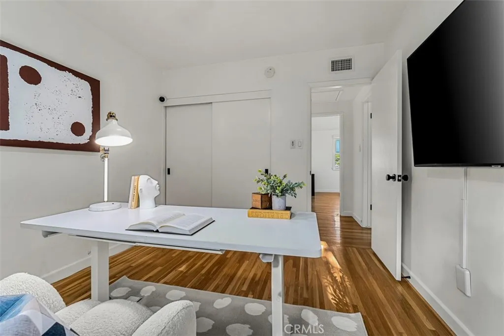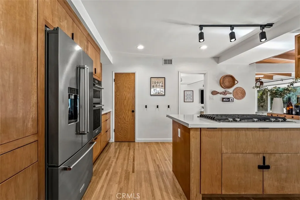 Discover a single-level Craftsman home with Mid-Century Modern influence offering a balanced combination of original architecture and thoughtful contemporary updates, ideal for buyers seeking the comfort and ease of living in a quiet neighborhood. Built with solid craftsmanship, the home retains key architectural features beginning with exposed wood beams & original stacked stone fireplace juxtaposed to the remodeled dining and kitchen space. These elements are complemented by a modern kitchen featuring open shelving and flat-panel walnut cabinetry, sleek and polished quartz countertops, creating a clean and functional layout that highlights the homes structure without excess detail. Throughout the residence, updated orb colored-glass pendant lighting and matte black hardware provide a pop and visual consistency. Hallways are accented with globe pendant lighting, black door knobs that matches the kitchen drawer pulls. Bathrooms are finished with vertical subway tile, matte black silhouette mirrors, and beveled glass shower enclosures, creating aesthetic continuity across the home. Slim wall light sconces flank mirrors for functionality and modern contrast. Recent upgrades include new double pane, energy efficient windows with light-filtering and privacy blinds, paired with simple white ceiling fans. Refinished original wood flooring extends throughout the home, reinforcing its single-level flow. Additional improvements include a tankless water heater, fresh interior paint and water softener offering a move-in-ready opportunity. The HVAC system and the roof are a little over