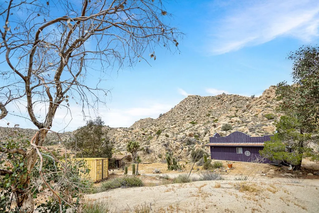 Just Like Living In The National Park! Come experience the reason people fall in love with the high desert! Nestled on 5 acres high in the Boulder Hills of the coveted Western Hills Estates, this property features sprawling views filled with majestic mountains and twinkling city night lights. Youll want to see this 2-bedroom, 1-bathroom character-driven charmer twice just to take it all in! The drive up to the property sets the mood, as you are surrounded by beautiful desert flora, rolling hills, and boulder formations often only found in Joshua Tree National Park. Pulling into the private driveway, youll find a hip artistic compound ready for your ideas! Stepping through the door of the main house, youll be taken aback by its unique style. The living area is accompanied by open beam and corrugated steel ceilings, beautiful rock flooring, knotty pine wood, and a gorgeous rustic rock fireplace that ties it all together. An abundance of windows positioned to take advantage of the phenomenal views provides a large amount of natural light, creating an open and airy feeling that flows throughout. The kitchen, designed with entertaining in mind, opens up to the living area so that you can prepare your favorite meals while still being part of the action. Featuring rock countertops, stylish cabinetry, and stainless steel appliances! Each bedroom features well-thought-out rustic features and windows offering even more views! The large bathroom comes outfitted with a porcelain sink, vanity, and a full bathtub/shower. Now, out on the private patio, youll find an expansive deckperfect