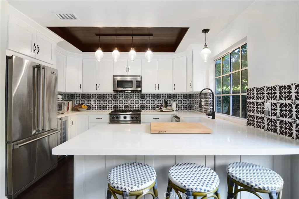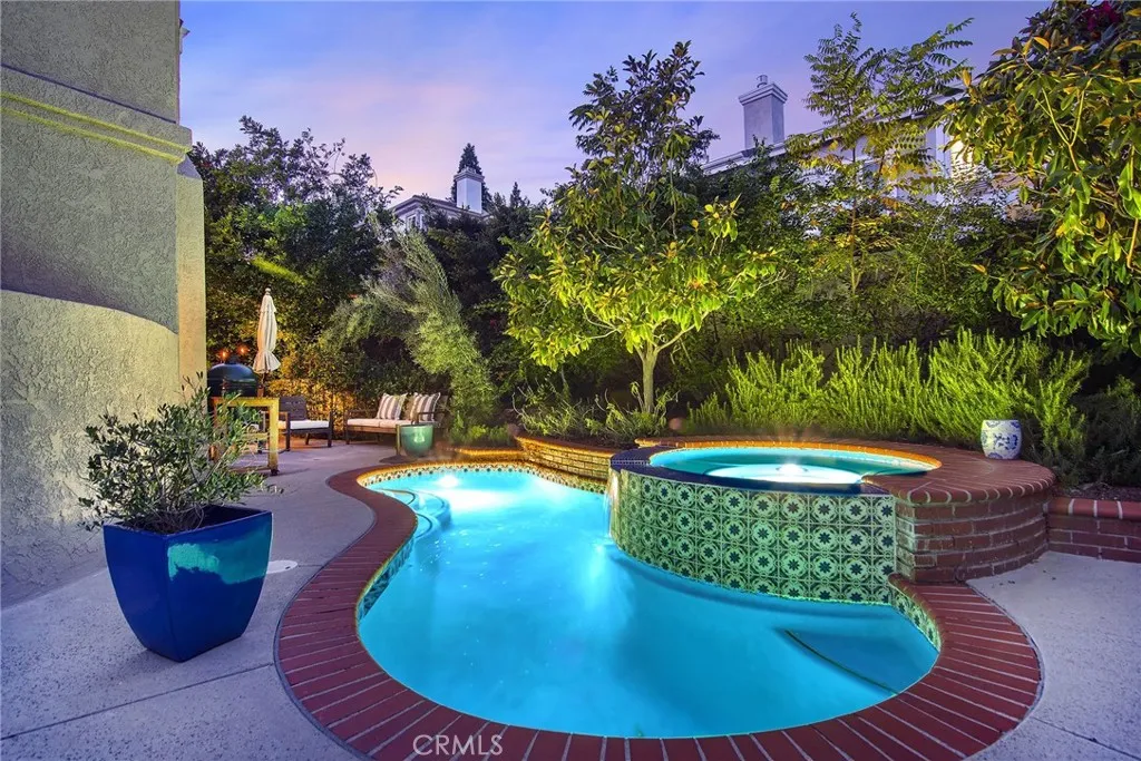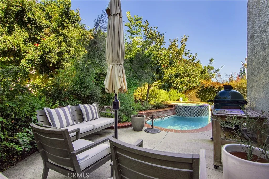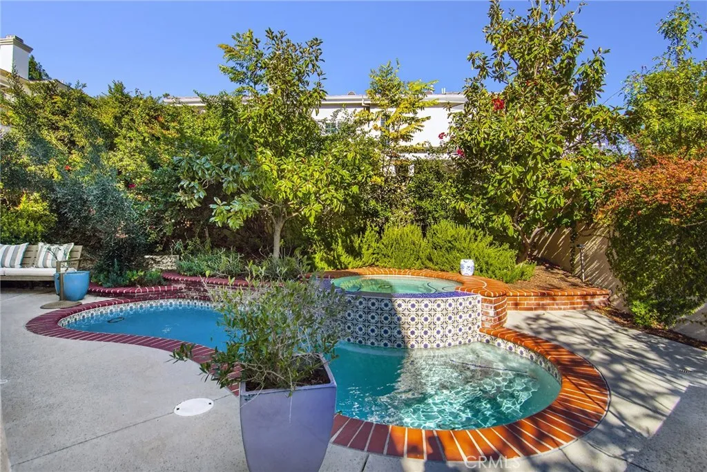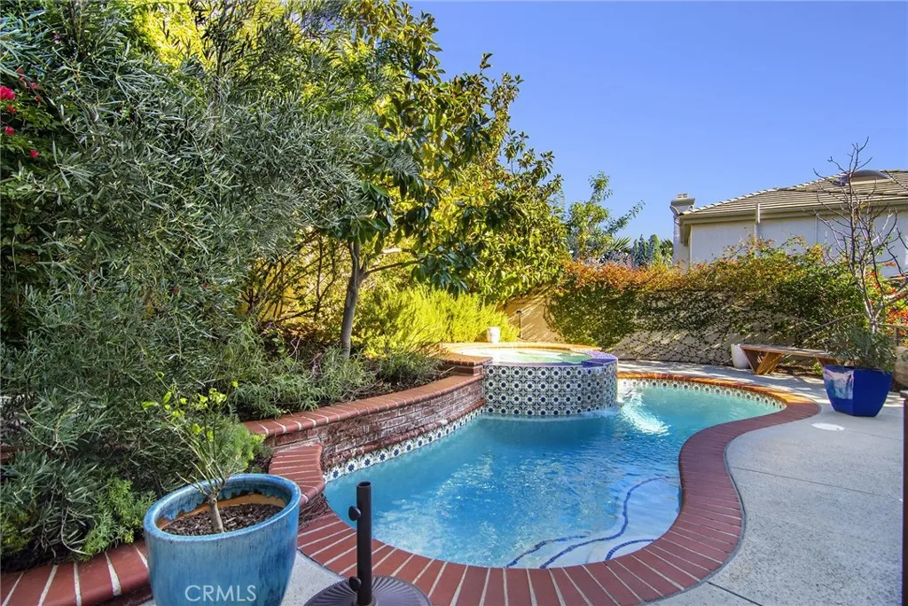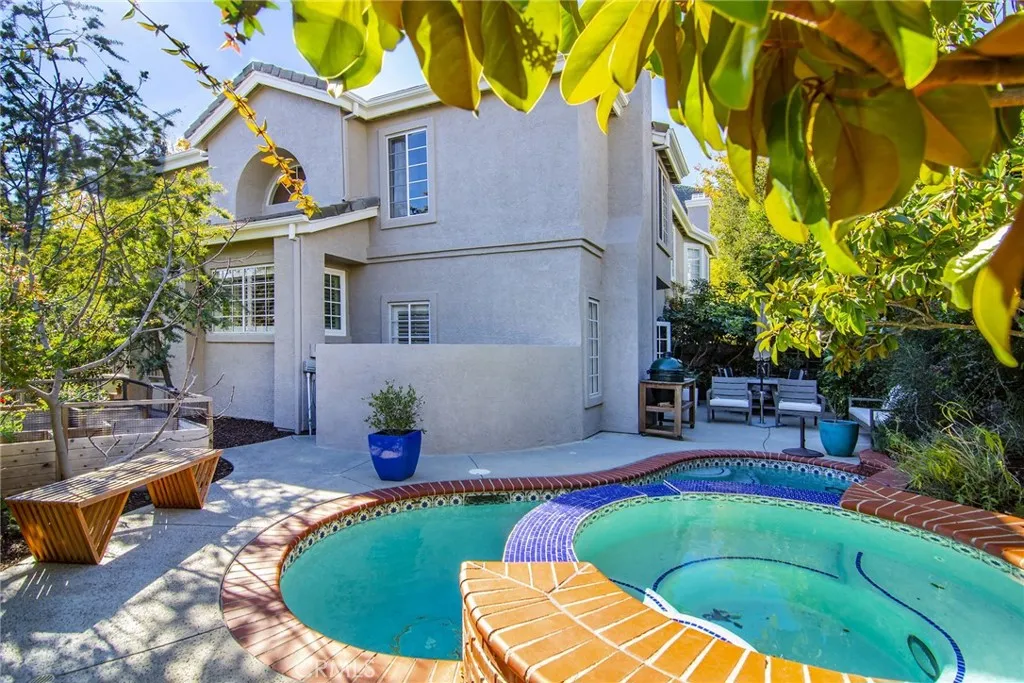 This serene Braemar Garden Home in the highly desirable North Ranch community of Westlake Village offers 1,819 square feet of living space and features one of the larger outdoor layouts within the neighborhood, with outdoor areas on three sidesan uncommon and highly sought-after feature, particularly among homes on Shadow Canyon Place. The expansive outdoor setting accommodates a private saltwater plunge pool and jacuzzi, vegetable garden, and citrus trees, creating a unique garden home experience. Designed for both comfort and entertaining, the home includes inviting front and backyard spaces with multiple patio areas ideal for dining, lounging, and enjoying the California lifestyle. Inside, the residence is filled with natural light and features wood flooring, plantation shutters, French doors, and a second fireplace, enhancing the homes seamless indoor-outdoor flow. The kitchen opens to the family room and is equipped with stone countertops, custom cabinetry, and a full suite of Viking appliances including range/oven, refrigerator, dishwasher, microwave, and wine cooler. All bathrooms have been updated, including Italian tile and a porcelain claw foot tub in the en suite primary bedroom. Additional highlights include a tankless water heater, epoxy flooring and custom cabinetry for ample storage in the detached garage.