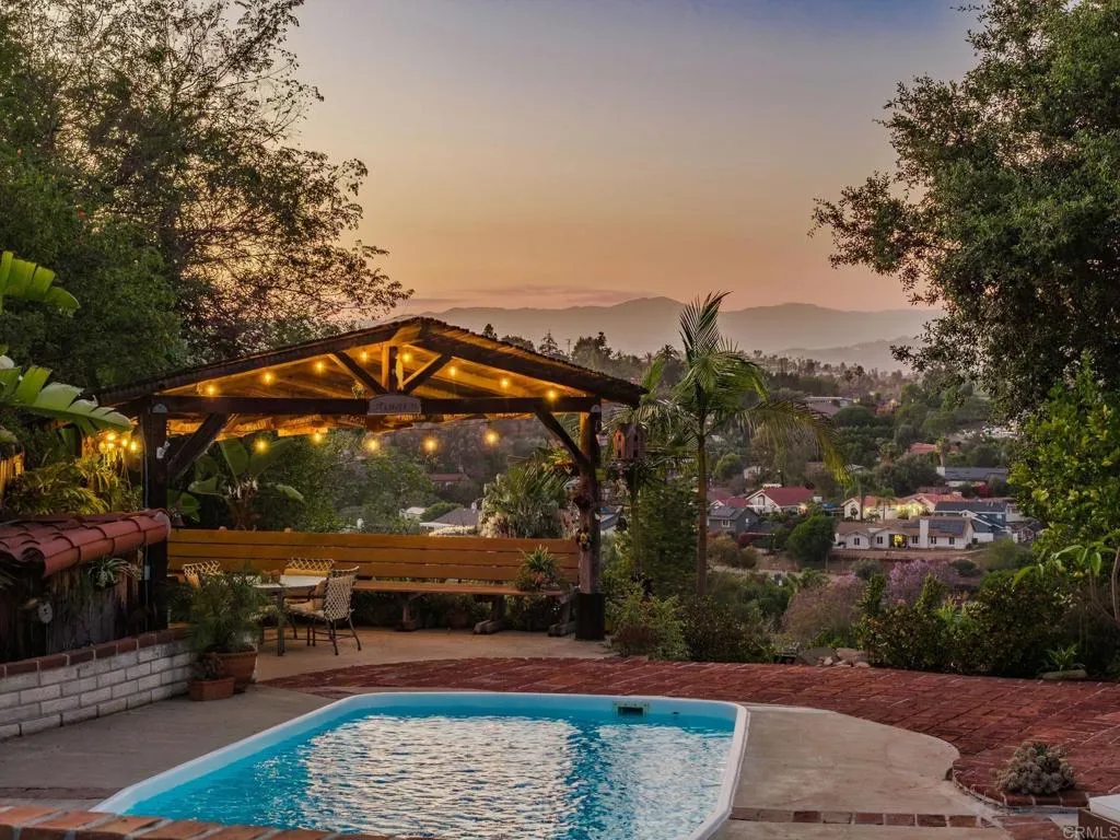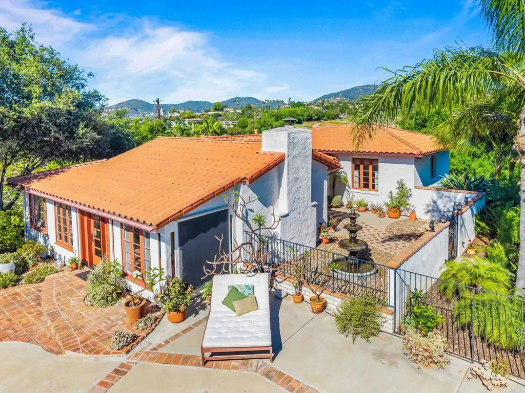 Tucked away at the end of a private drive, this one-of-a-kind true adobe block retreat captures the essence of Southern California livingwhere privacy, character, and sweeping valley views come together, all set on approximately 0.80 very special acres. From the moment you arrive, the home makes an impression. A beautifully designed front courtyard with custom concrete and inset pavers creates a warm, inviting entry, setting the tone for what lies beyond. Inside, authentic adobe construction, exposed beams, and Saltillo-style tile floors create a rich sense of texture and timeless charm rarely found in todays market. The updated kitchen blends function and design with Caesarstone quartz countertops, a Sub-Zero built-in refrigerator, built in drawer dishwasher, and a dual-fuel range, while the main living spaces center around a cozy fireplace and effortless indoor-outdoor flow. The flexible layout offers approximately 2,048 square feet with 3 bedrooms and 3 bathrooms. 2 of the bedrooms including the primary suite are on the main level. One of the 3 bedrooms completes a private lower-level suite with its own entrance, living space, and bathideal for guests, extended family, or creative use. Outdoors, the setting truly shines. A recently refreshed pool, shaded lounge areas, and a tranquil gazebo provide the perfect backdrop for relaxing or entertaining, all framed by panoramic views and mature landscaping. There is a small detached garage/shop along with additional outbuildings that provide a very flexible space. Despite its peaceful, tucked-away feel, the location is incredib