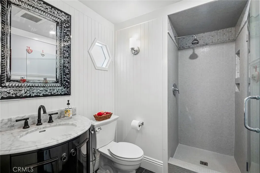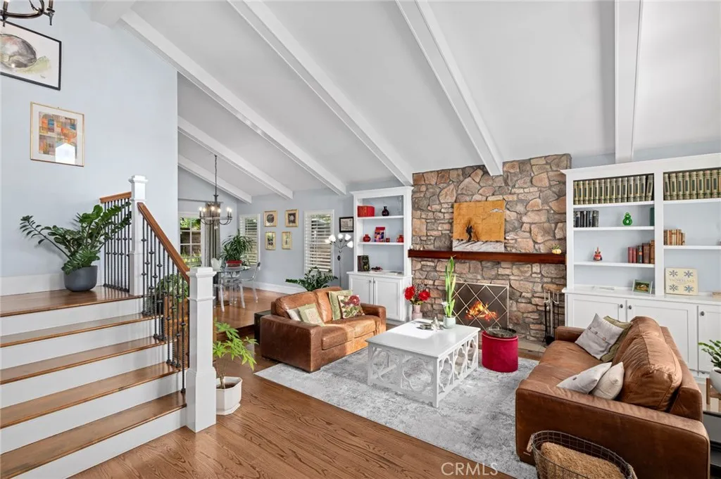 A sense of calm unfolds from the moment you enter, where a sculptural custom staircase with warm wood risers and tailored paneling sets a tone of understated elegance. Soft, ambient lighting and carefully curated fixtures illuminate the natural textures of wide-plank wood flooring, guiding you into an inviting living space anchored by a refined fireplacean intimate setting designed for both quiet reflection and effortless gathering. The kitchen is thoughtfully composed as both a functional workspace and a place of connection. Honed granite surfaces, a farmhouse sink, and artisanal tile backsplash are complemented by professional-grade appliances, including a six-burner cooktop with pot filler, dual convection ovens, and an integrated refrigerator. An extended breakfast counter invites casual mornings, while a discreet dry bar with wine refrigeration enhances the homes capacity for relaxed entertaining. Flowing seamlessly from the kitchen, the family room offers a more intimate retreatwhere a custom window seat frames soft natural light, creating a serene nook for reading, conversation, or quiet moments at the end of the day. A main-level guest suite, currently curated as a private office, is appointed with bespoke cabinetry and shelving, offering both flexibility and refinement. The adjoining bath is enveloped in custom finishes, with full-height detailing that evokes a spa-like simplicity. Upstairs, the primary suite is a tranquil sanctuary. Elevated ceilings with custom paneling create a sense of volume and calm, while a private balcony extends the living space outdoors.