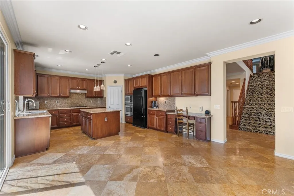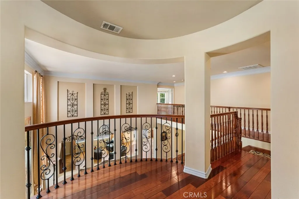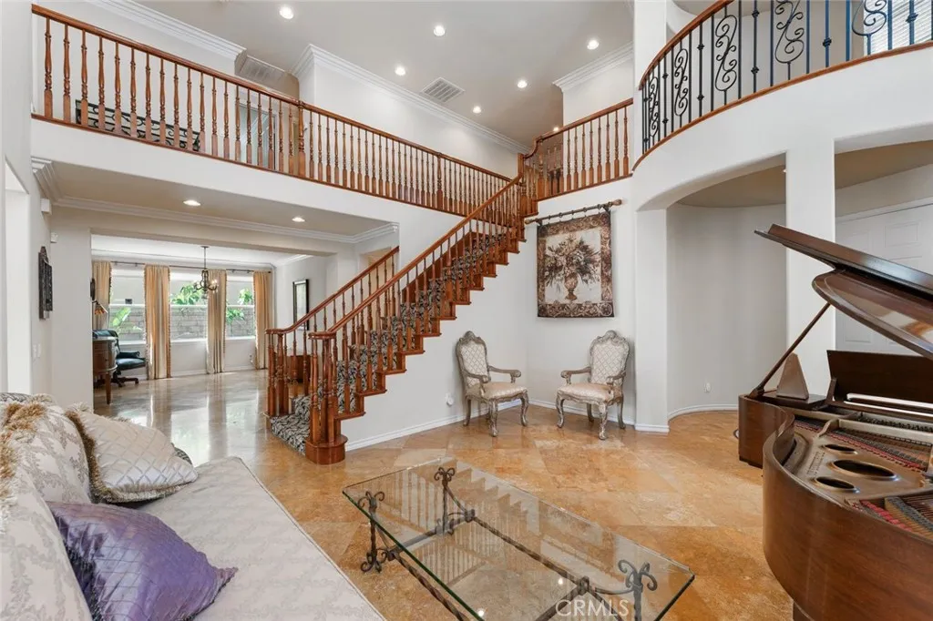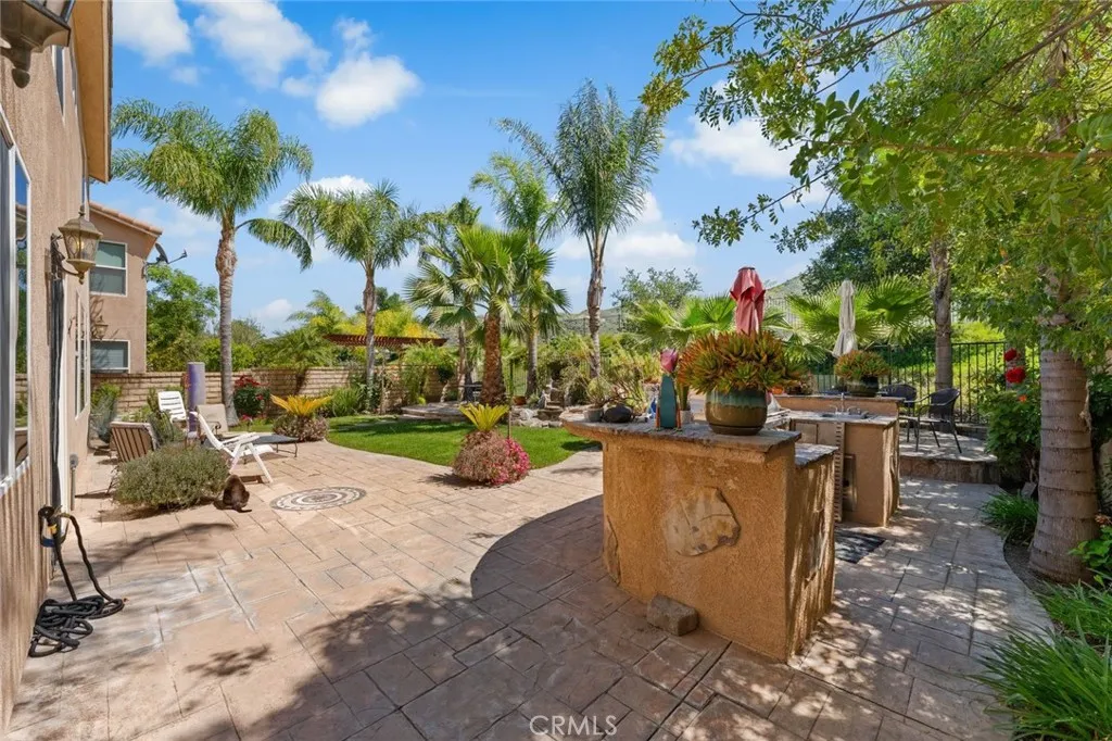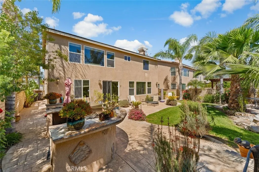 Welcome to this expansive 5-bedroom 4-bathroom home boasting over 3,450 sq ft of thoughtfully designed living space located in the highly sought-after Fair Oaks community of Santa Clarita. Home features elegant entry with custom Onyx & Stone medallion inlay and 24 x 24 travertine stone flooring downstairs and mahogany wood flooring upstairs. Enjoy an open concept floor plan with spacious living and dining areas, soaring high ceilings and abundant natural light throughout. Spacious Master suite and master bath with two walk-in closets, dual sinks, oval soaking tub and separate shower. Home also features a beautiful kitchen with granite counters and a built-in desk area. Other features include a custom stair handrail, crown molding throughout and a separate laundry room upstairs. The backyard offers gorgeous landscaping, a fountain, stamped concrete and a custom BBQ with cook top perfect for entertaining. Private backyard with no rear neighbors. Walking distance to the pool and rec area. Close proximity to the freeway, parks, shopping and restaurants. Very low HOA!