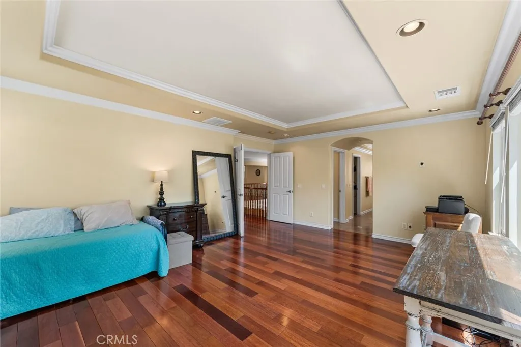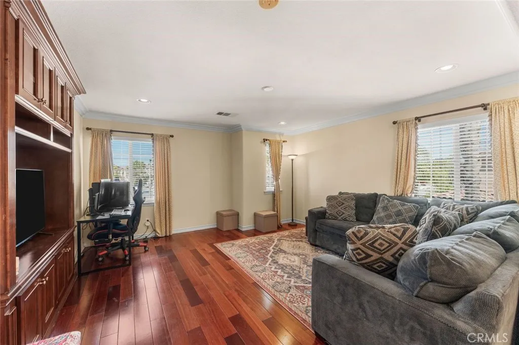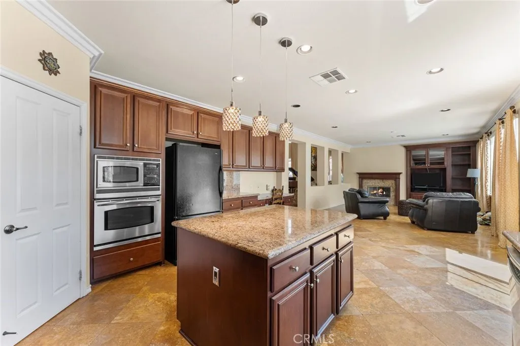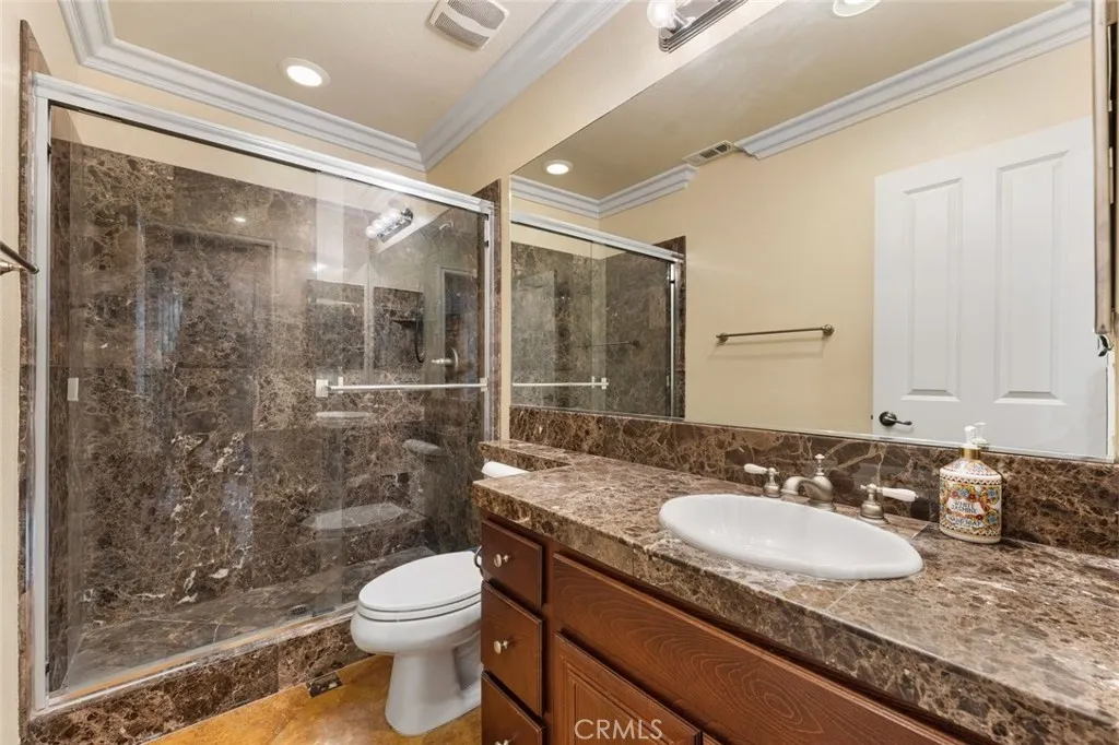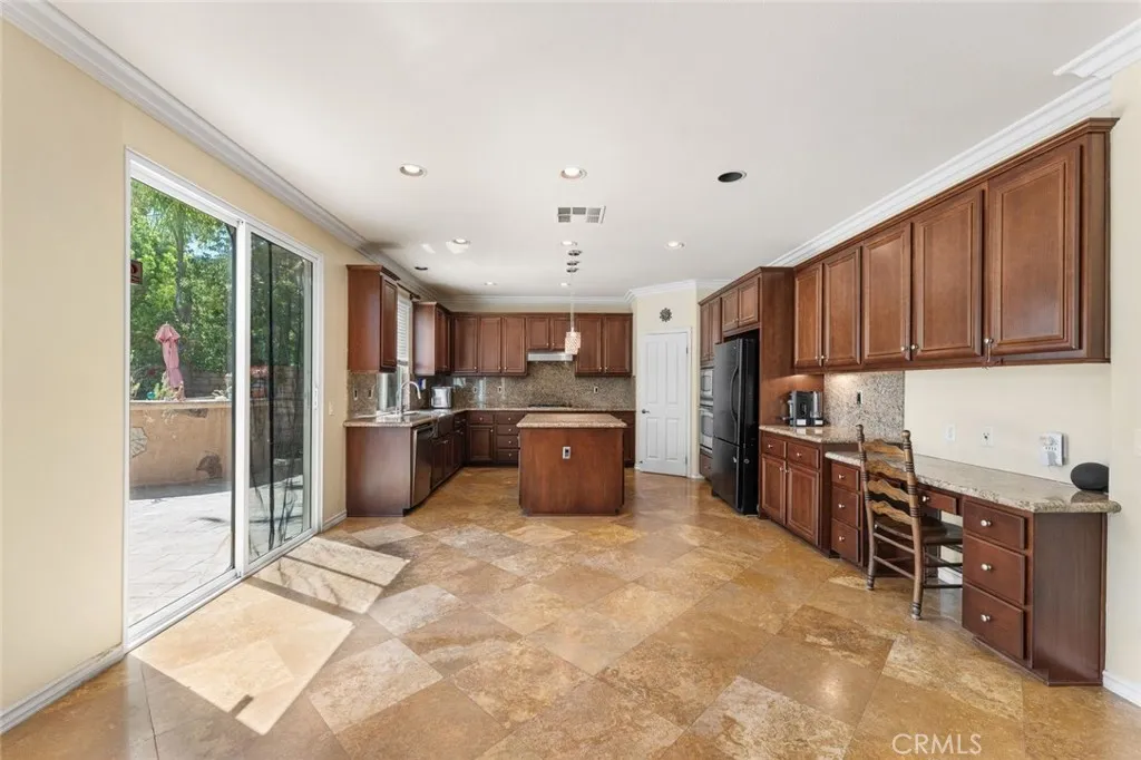 Welcome to this expansive 5-bedroom 4-bathroom home boasting over 3,450 sq ft of thoughtfully designed living space located in the highly sought-after Fair Oaks community of Santa Clarita. Home features elegant entry with custom Onyx & Stone medallion inlay and 24 x 24 travertine stone flooring downstairs and mahogany wood flooring upstairs. Enjoy an open concept floor plan with spacious living and dining areas, soaring high ceilings and abundant natural light throughout. Spacious Master suite and master bath with two walk-in closets, dual sinks, oval soaking tub and separate shower. Home also features a beautiful kitchen with granite counters and a built-in desk area. Other features include a custom stair handrail, crown molding throughout and a separate laundry room upstairs. The backyard offers gorgeous landscaping, a fountain, stamped concrete and a custom BBQ with cook top perfect for entertaining. Private backyard with no rear neighbors. Walking distance to the pool and rec area. Close proximity to the freeway, parks, shopping and restaurants. Very low HOA!