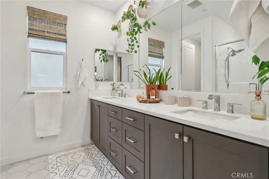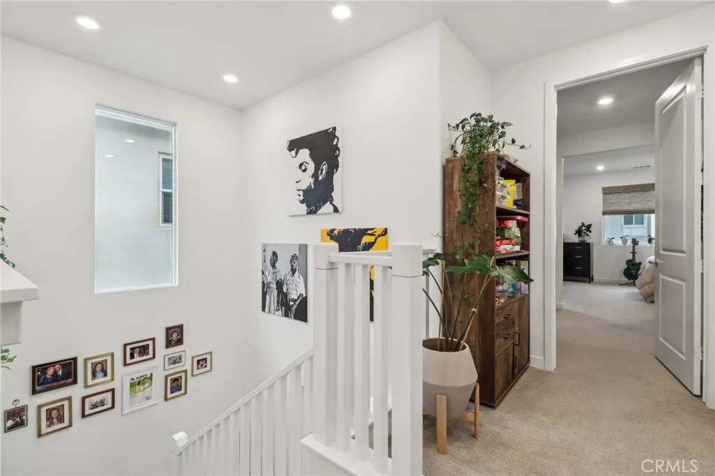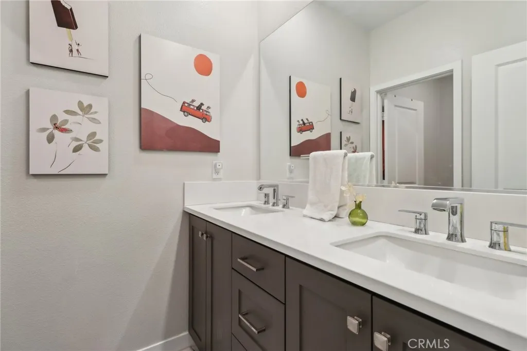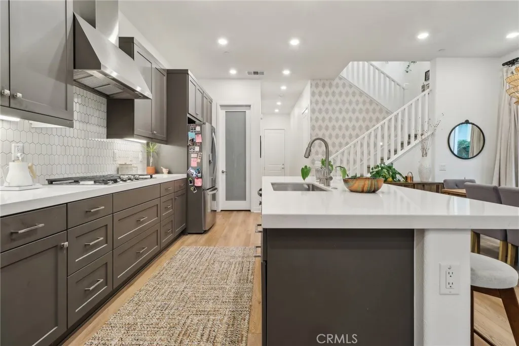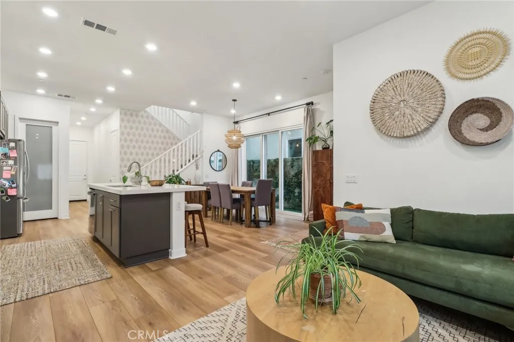 Stunning Move-In Ready Townhome, one of the few with spacious outdoor patio!! Welcome to this beautifully upgraded 3-bedroom, 2.5-bath contemporary townhome offering stylish design, modern comfort, and exceptional community amenities. Built with todays lifestyle in mind, this home features high ceilings, recessed lighting, and an open-concept floor plan that creates a bright and airy living space perfect for both relaxing and entertaining. The chef-inspired kitchen showcases quartz countertops, stainless steel appliances, a large center island, and a spacious walk-in pantry, seamlessly flowing into the main living and dining areas. A convenient downstairs powder room adds function for guests. Upstairs, enjoy a versatile loft space ideal for a home office, media room, or play area. The spacious primary suite offers a walk-in closet, dual-sink quartz vanity, beautifully tiled walk-in shower, and direct access to a large covered patio, creating the perfect private retreat. Two additional guest bedrooms, a full secondary bath with separate tub and shower area, and an upstairs laundry room with extra storage complete the second floor. Additional upgrades include a 2-car attached garage with EV charger, tankless water heater, solar, Ring security system, and smart home features. Located in the highly sought-after FivePoint Valencia community, residents enjoy resort-style pools, parks, scenic walking trails, and beautifully maintained open spaces. Conveniently close to shopping, dining, California Institute of the Arts, College of the Canyons, Six Flags Magic Mountain, top-rated s
