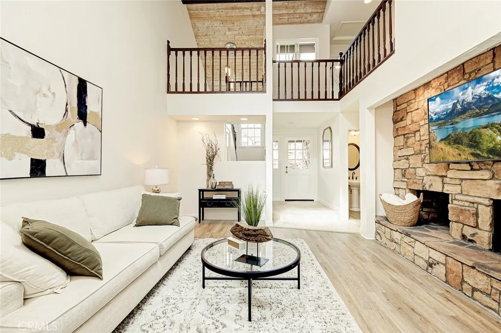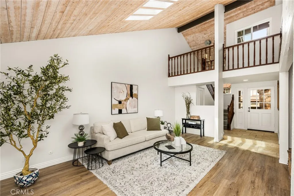 Welcome to 6164 E. Morningview Drive in Anaheim Hills. With approximately 1,967 square feet of living space, this home boasts a bright and open floor plan enhancing the beautiful wood ceilings. The skylights, windows and sliding glass doors flood the home with natural light. A travertine floor entryway leads into the living room with an impressive stacked stone fireplace and hearth. Upstairs shows off two huge primary bedroom suites, each with a large private bathroom. The primary suite bathroom boasts a skylight, jetted tub, walk-in shower with glass door, dual vanities, granite counter, travertine flooring, and closet space. The second bathroom suite features a walk-in closet, travertine flooring with custom glass walk-in shower. Both bedrooms have ceiling fans, vaulted ceilings and lots of windows. The impressive kitchen boasts granite counters, recessed lighting, cooking island, abundant cabinetry and counter space, along with a breakfast bar and eating area. The kitchen, dining room and living room offer sliding glass doors to the expansive backyard with a large covered patio, grass area, landscape lighting, fountain, lemon tree, and soaring palms. Enjoy a serene and peaceful setting in your backyard. A half bathroom is located downstairs. A separate laundry room leads to a two car garage. Dual pane vinyl windows, new flooring, fresh paint, and rainbird backyard sprinklers, are some of the many upgrades. This home sits on a quiet cul-de-sac street in the Royal Circle Village Community. Centrally located near top rated schools, shopping, dining, Saddle Club, golfing, pa