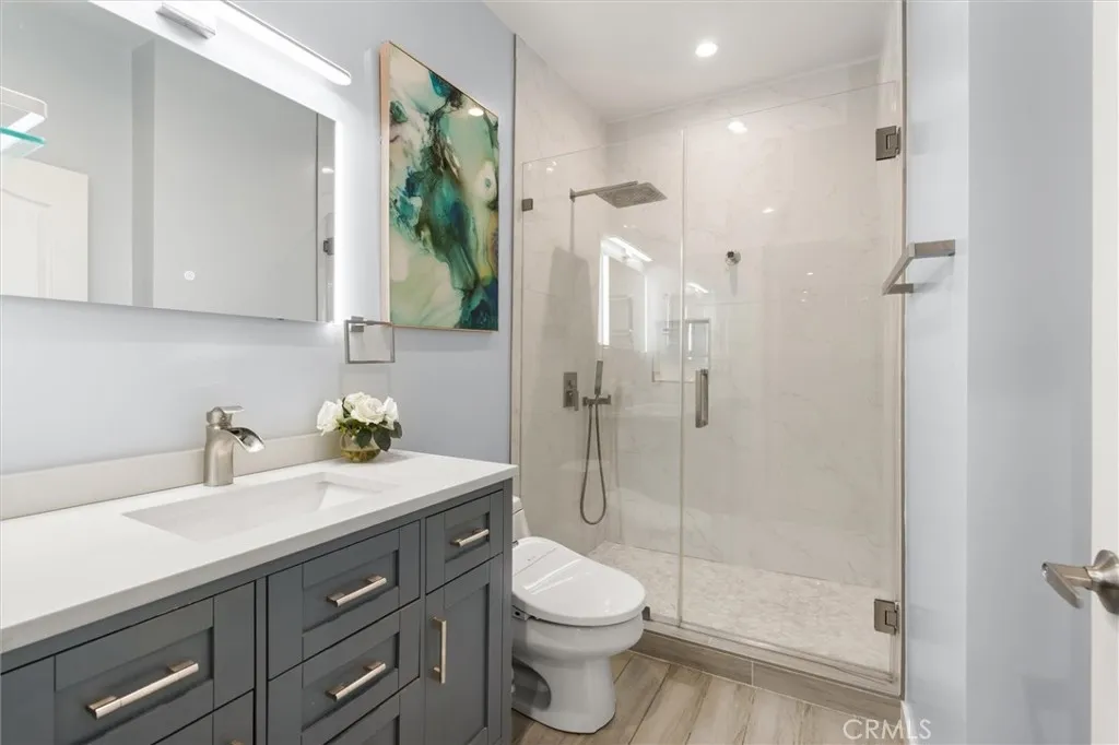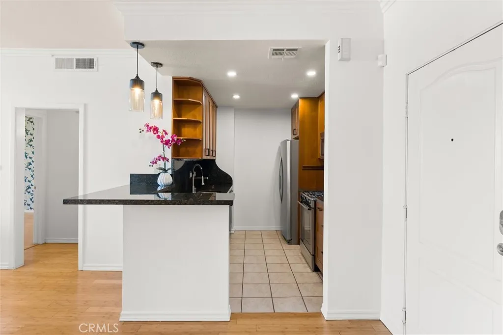 Experience the ultimate urban retreat in the heart of the NoHo Arts District! This tech-forward, freshly painted condo is a buyers dream, blending modern convenience with a prime walkable location. The "smart" interior features a Nest thermostat, Kasa dimmer switches, and a primary suite boasting a remodeled bath with an electric bidet and an anti-fog Bluetooth speaker mirror. The chef-ready kitchen is anchored by premium Bosch appliances and a brand-new refrigerator, while the laundry area features a sleek 2025 LG Wash Tower. Recent upgrades provide peace of mind, including energy-efficient double-pane windows and an A/C system replaced just 3 years ago. Located on the quiet backside of the building to ensure privacy and zero street noise, you can enjoy your morning coffee on the large, tree-lined private balcony or head to the rooftop deck for panoramic Valley views. Secure living with gated 2-car parking, perimeter security cameras, and extra shared storage. Live steps away from NoHos best coffee shops, bars, comedy clubs, and North Hollywood Park. Incredible commuter access to the 101, 134, and 170 freeways, plus proximity to major studios and Universal. Low-maintenance, high-tech, and perfectly situatedwelcome home to Peach Grove!