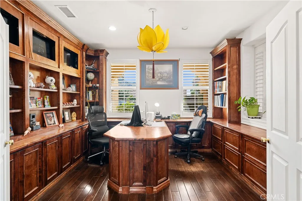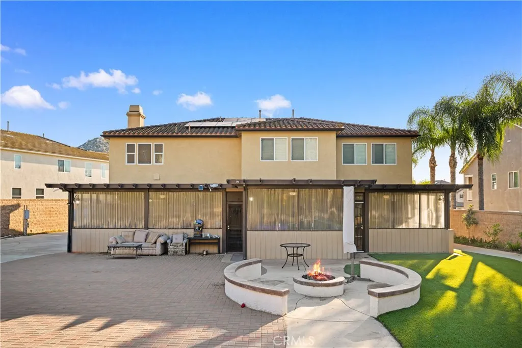 Located in the sought-after Norco Ridge Estates community in Norco, this expansive Plan 5 residence offers approximately 4,749 square feet of well-designed living space on a generous 33,976 square foot lot, with sweeping mountain and neighborhood views that define the Norco Hills setting. The home offers a total of 8 rooms and 8 full bathrooms, providing exceptional flexibility for a variety of living arrangements, including additional bedrooms, home offices, gyms, or creative spaces. A grand entry with a wrought iron staircase leads into formal living and dining areas, accented by dark wood flooring. The kitchen is designed for both everyday use and entertaining, with granite countertops, a large center island, abundant cabinetry, and a full suite of KitchenAid stainless steel appliances, including a 6-burner cooktop, double ovens, warming drawer, and trash compactor. Extending from the spacious family room is a fully enclosed sunroom with a built-in kitchen, creating additional usable interior space ideal for gatherings and year-round enjoyment. Additional interior highlights include office with custom built-in desk and cabinetry, a large upstairs bonus room, plantation shutters, and a well-equipped laundry room with storage upstairs, along with a secondary laundry setup in the garage for added convenience. The primary suite offers a private retreat with dual walk-in closets, and a bathroom featuring a soaking tub, separate shower, and detailed finishes throughout. The oversized backyard is designed for both relaxation and entertaining, featuring a fire pit, and multiple