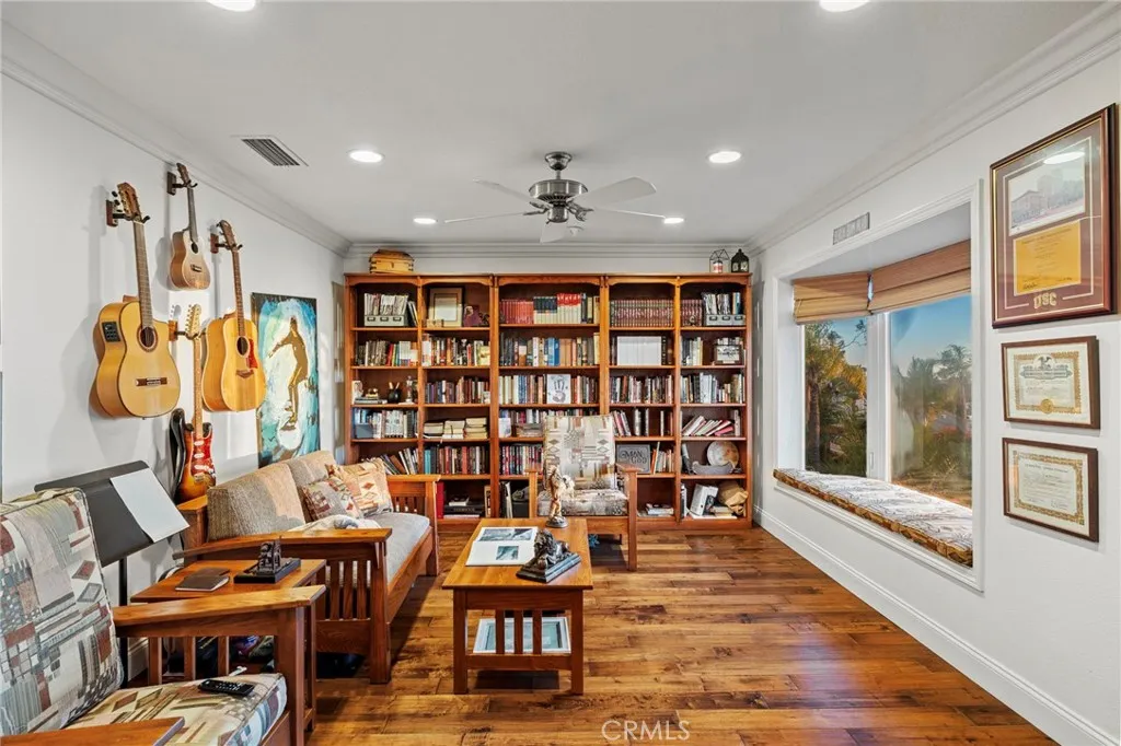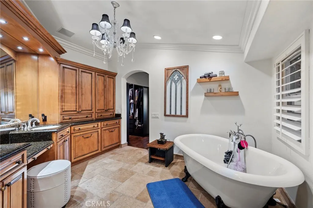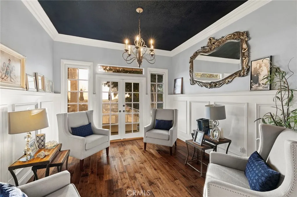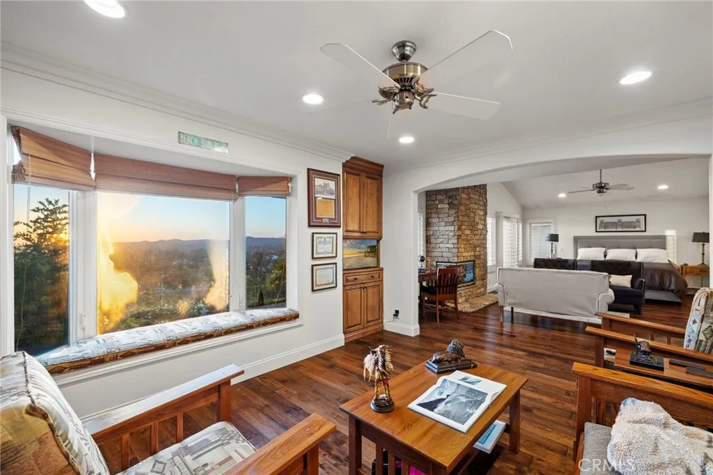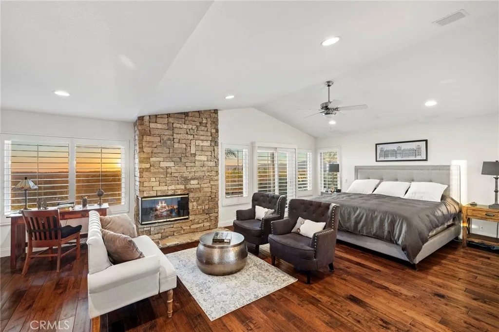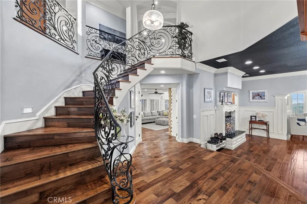 Completely reimagined and meticulously remodeled, this exceptional residence in the highly sought-after Rancho Cielo community of Trabuco Canyon blends luxury, comfort, and modern efficiency. Featuring 5 bedrooms, 3.5 bathrooms, approximately 3,728 square feet, plus a large bonus room and a private library/retreat off the primary suite, this home is designed for both everyday living and entertaining. A custom solid wood front door welcomes you into a beautifully upgraded interior with hardwood flooring, wainscoting, crown molding, plantation shutters, and a striking wrought iron staircase. The chefs kitchen showcases custom double-stacked alder cabinetry, granite countertops, a large center island, Sub-Zero refrigerator/freezer, Bosch dishwasher, six-burner gas cooktop, double ovens with warming drawer, Shaws fireclay farmhouse sink, under-cabinet lighting, and a butlers pantry. An extended slider creates seamless indoor-outdoor flow. Modern upgrades include solar, new HVAC and ducting, dual-pane windows, NEST climate control, Simply Safe security, built-in speakers, recessed lighting, and ceiling fans throughout. The primary suite offers a fireplace, spa-inspired bath with dual-head shower, and a private balcony with glass panels to capture sweeping views. Additional fireplaces in the dining and family rooms add warmth and charm. The backyard is a true retreat with a custom-tiled pool, paver decking, built-in BBQ island, and covered patio with shiplap ceiling, lighting, fans, outdoor TV, and drop-down shades. Professionally landscaped with synthetic turf, olive tree, light