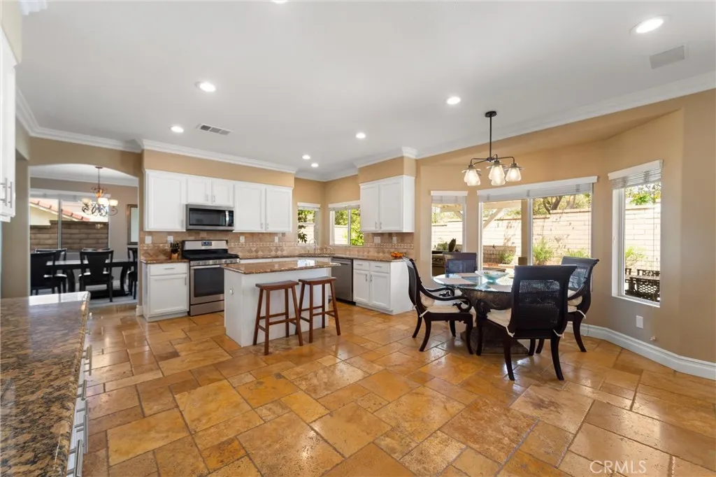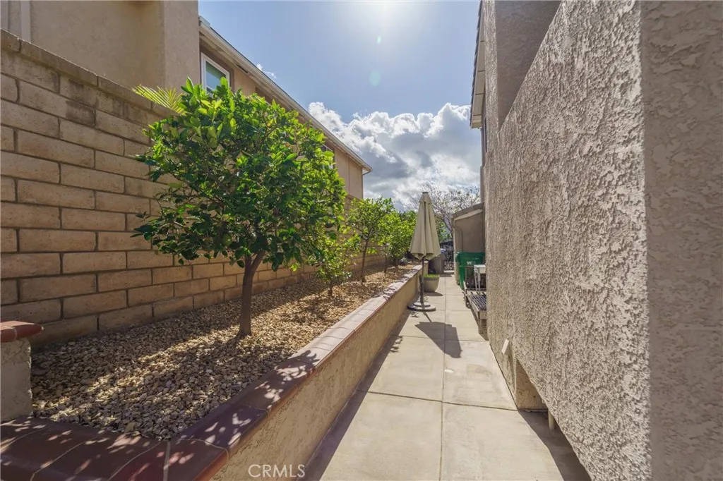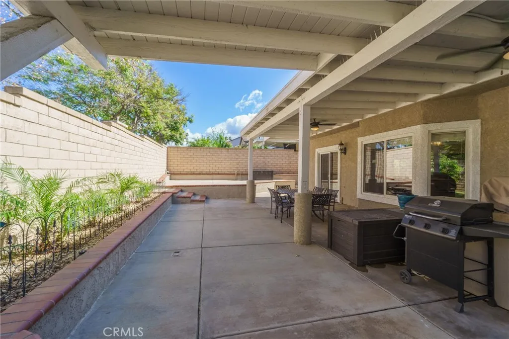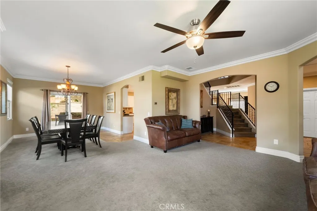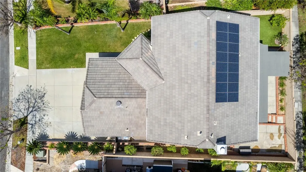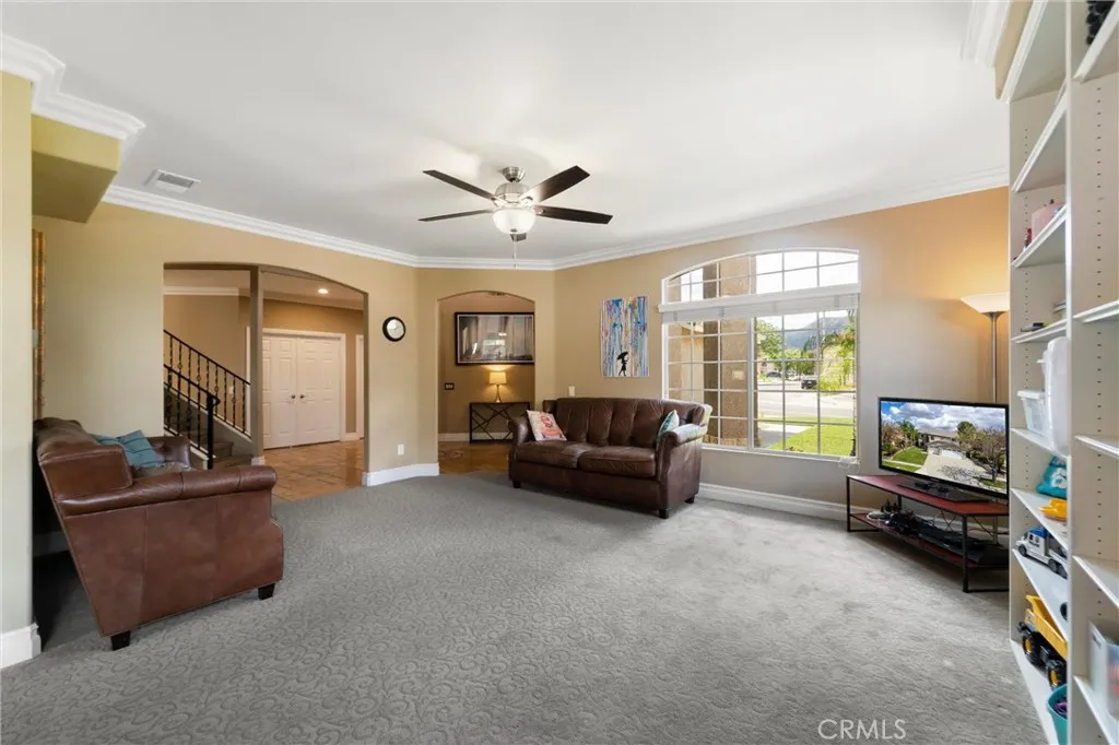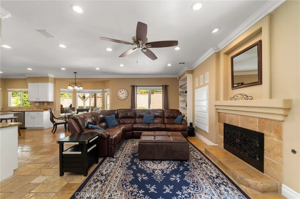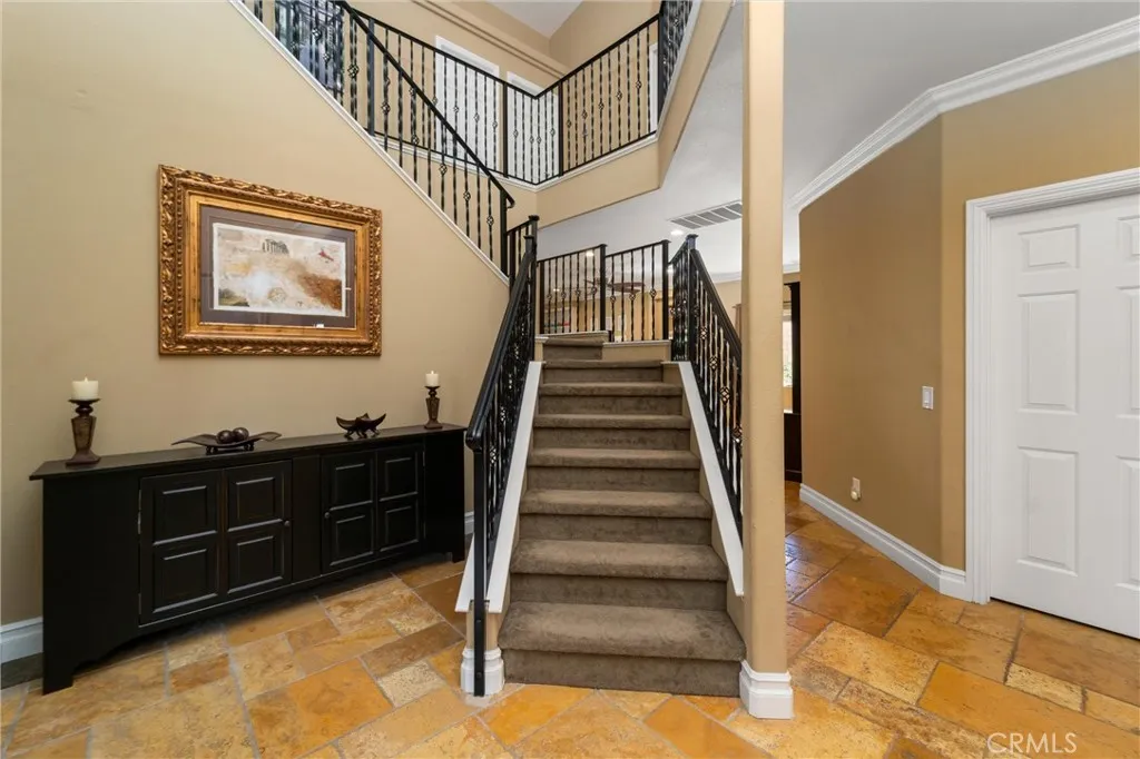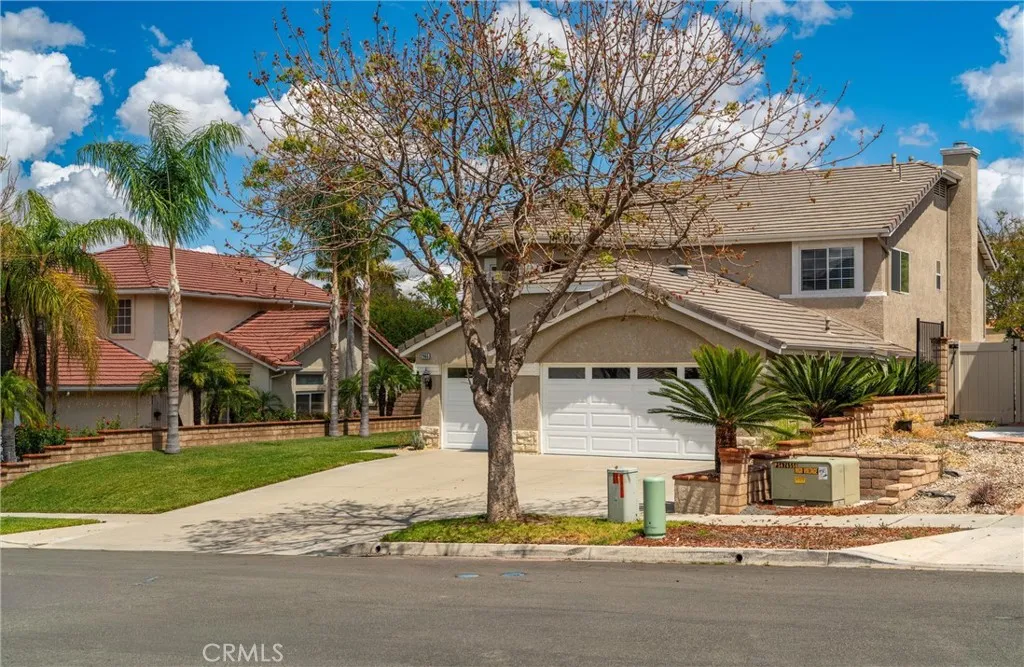 Beautifully maintained and significantly upgraded two-story single-family home offering 3,195 square feet of well-designed living space on a 7,405-square-foot (0.17-acre) lot in an established Corona neighborhood. Built in 1997, the home includes 4 bedrooms, 2.5 bathrooms, a 3-car garage, and a wood-burning fireplace. Recent major improvements include a fully owned solar system approx. 5.2 Kw, a nearly brand-new air conditioning system and a complete PEX re-pipe throughout the home deliver energy efficiency, year-round comfort, and long-term peace of mind. The entry opens to a dramatic two-story foyer finished in travertine tile with a custom mosaic medallion and a wrought-iron staircase. The adjacent formal living and dining rooms feature arched windows, crown molding, chandelier lighting, and sliding-glass access to the backyard. The family room centers on a stone-surround fireplace with built-in display niches and opens directly into the kitchen, which is finished with granite counters, white cabinetry, stainless-steel appliances, a tumbled-stone backsplash, and a center island with seating. A walk-in pantry sits behind an etched-glass door, and a bay-window breakfast nook overlooks the yard. Upstairs, the primary suite features high ceilings and neighborhood/mountain views, with an en-suite bath finished in marble counters, a deep soaking tub, a frameless-glass walk-in shower, and dual walk-in closets. Connected by an open air balcony/hallway, three additional bedrooms and a full bathroom complete the spacious upstairs living space. Outside, professional landscaping, ma