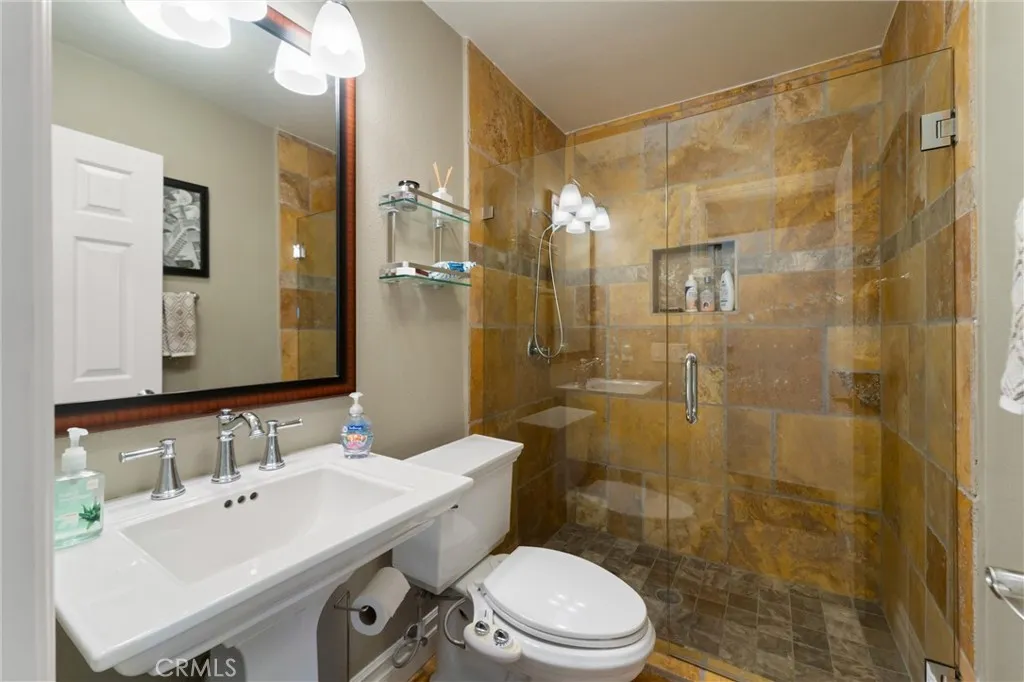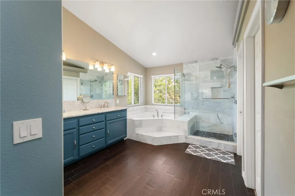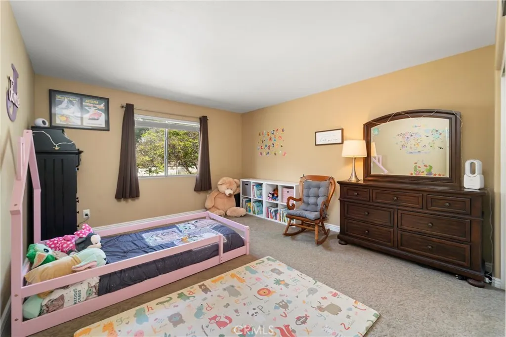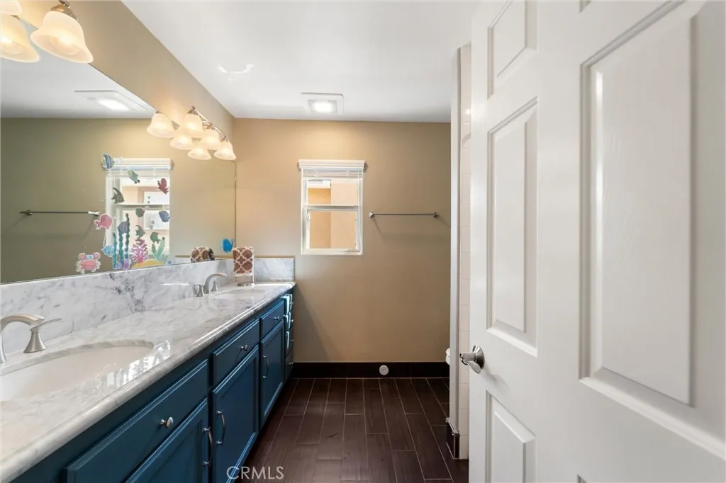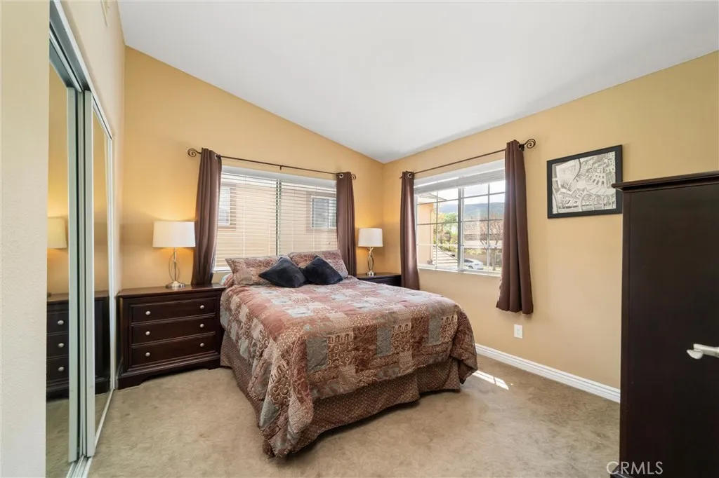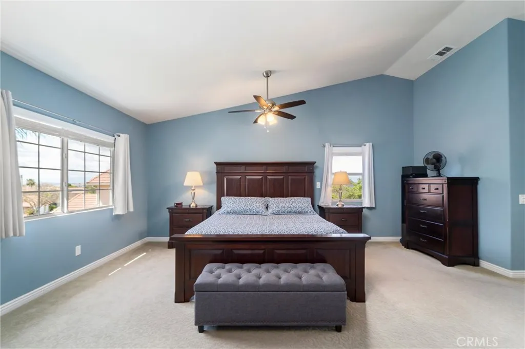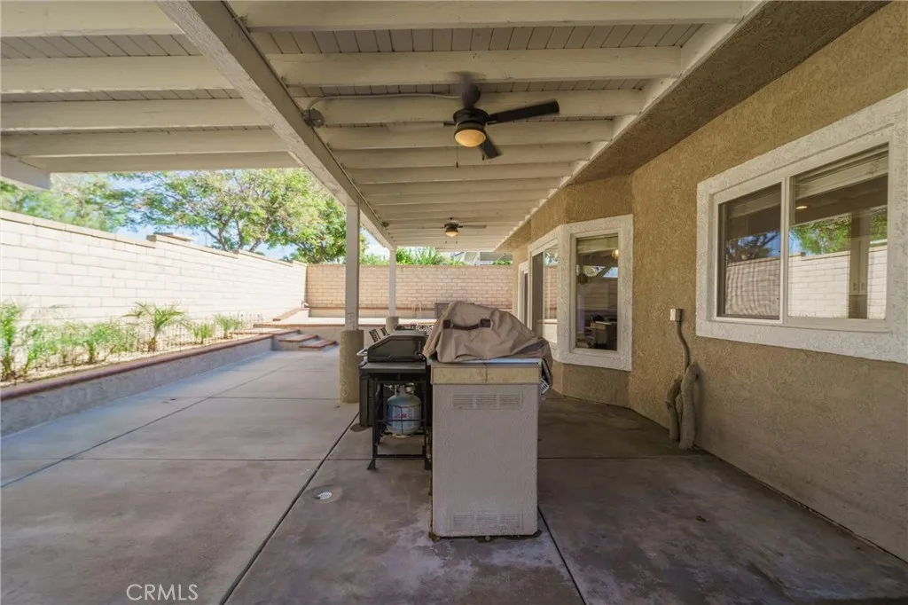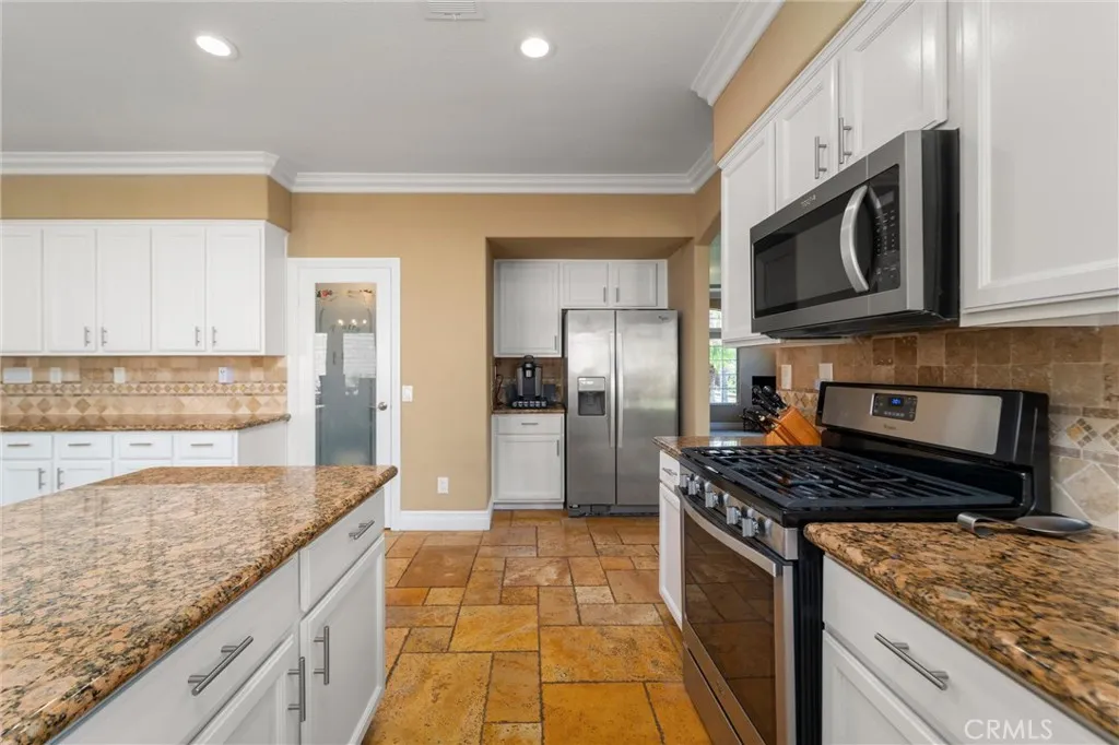 Beautifully maintained and significantly upgraded two-story single-family home offering 3,195 square feet of well-designed living space on a 7,405-square-foot (0.17-acre) lot in an established Corona neighborhood. Built in 1997, the home includes 4 bedrooms, 2.5 bathrooms, a 3-car garage, and a wood-burning fireplace. Recent major improvements include a fully owned solar system approx. 5.2 Kw, a nearly brand-new air conditioning system and a complete PEX re-pipe throughout the home deliver energy efficiency, year-round comfort, and long-term peace of mind. The entry opens to a dramatic two-story foyer finished in travertine tile with a custom mosaic medallion and a wrought-iron staircase. The adjacent formal living and dining rooms feature arched windows, crown molding, chandelier lighting, and sliding-glass access to the backyard. The family room centers on a stone-surround fireplace with built-in display niches and opens directly into the kitchen, which is finished with granite counters, white cabinetry, stainless-steel appliances, a tumbled-stone backsplash, and a center island with seating. A walk-in pantry sits behind an etched-glass door, and a bay-window breakfast nook overlooks the yard. Upstairs, the primary suite features high ceilings and neighborhood/mountain views, with an en-suite bath finished in marble counters, a deep soaking tub, a frameless-glass walk-in shower, and dual walk-in closets. Connected by an open air balcony/hallway, three additional bedrooms and a full bathroom complete the spacious upstairs living space. Outside, professional landscaping, ma