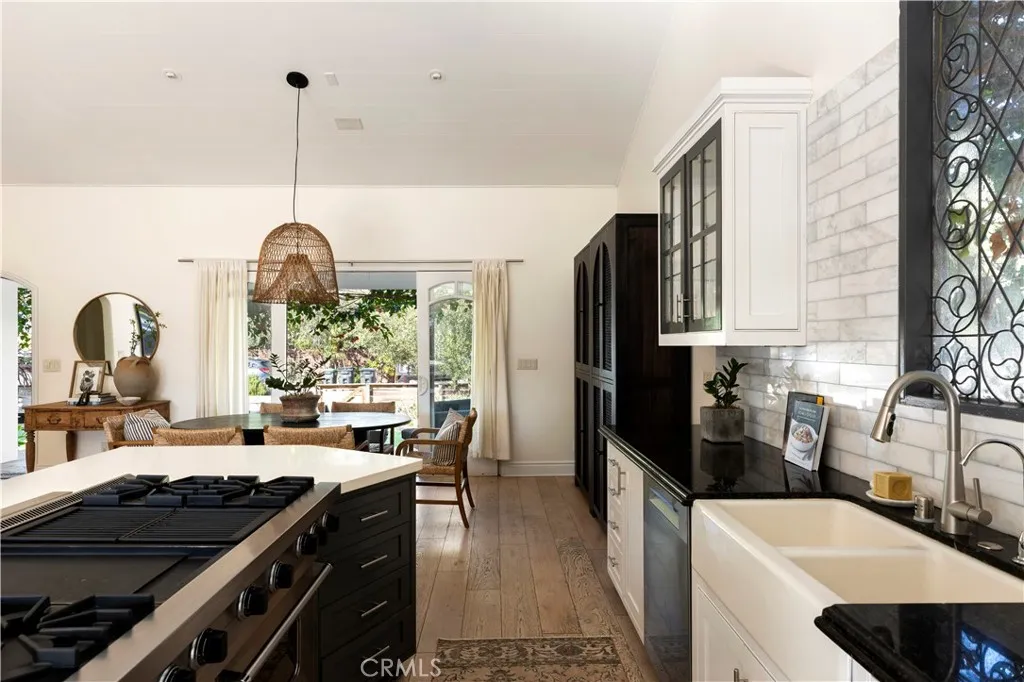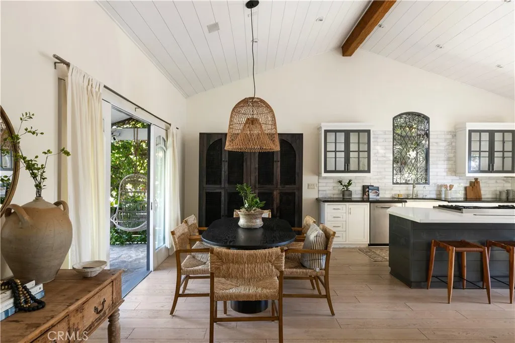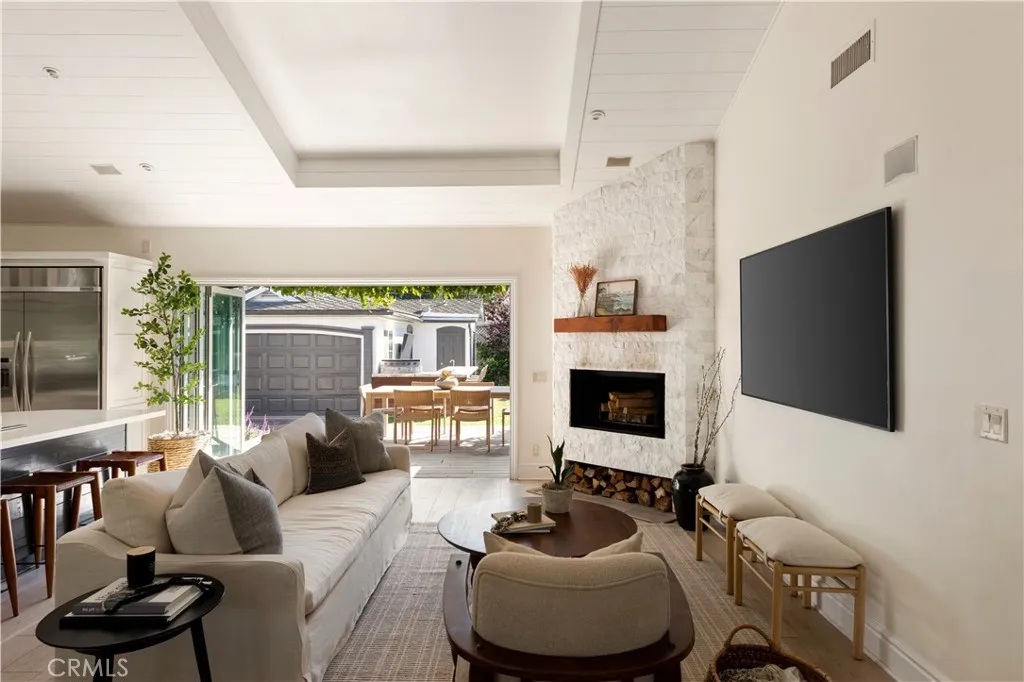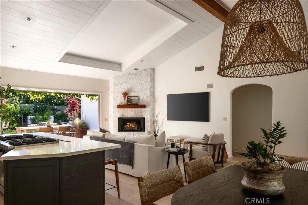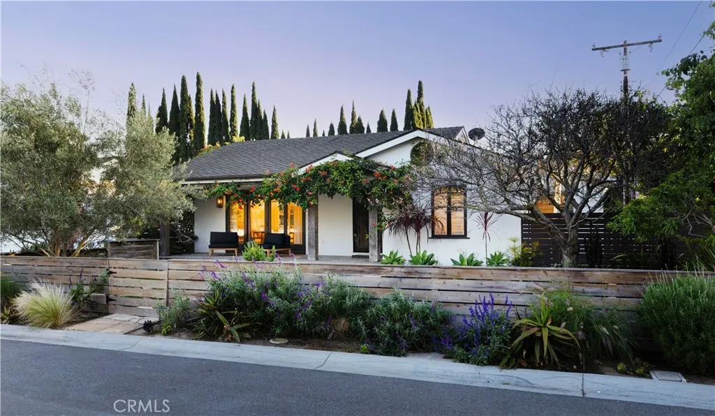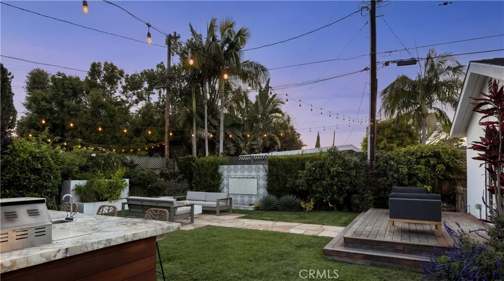 Tucked at the end of a quiet cul-de-sac and draped in blooming trumpet vines, this thoughtfully updated Eastside Costa Mesa residence blends timeless design with effortless indoor-outdoor living on a generously sized lot. Over the years, the property has been expanded to offer three bedrooms and two-and-a-half bathrooms within a light-filled, open-concept floor plan. Vaulted shiplap ceilings soar overhead, grounded by light hardwood floors and arched details. The kitchen is the undisputed heart of the home: custom two-tone cabinetry with glass fronts, marble subway tile, a six-burner range with double oven, farmhouse sink, and a generous breakfast bar that flows into the living and dining areas. A fireplace anchors the living room, while a nearly 12 La Cantina door dissolves the boundary between indoors and out. The primary suite addition offers a peaceful retreat with a private deck and direct backyard access, while the secondary bedrooms and updated bathroom provide flexible space for guests, home office, or play room. The home is further enhanced by central air conditioning, a whole-house Aquasana water filtration system, and an under-sink reverse osmosis system. Designed for year-round enjoyment, the front and backyards unfold as a series of intimate yet connected outdoor spaces, with eight mature citrus and fruit trees woven throughout. An entertainers bar, complete with barbecue, sink, and refrigerator, opens to a sweeping backyard garden setting where string lights, a fire pit lounge, and tiled fountain create a relaxed, inviting atmosphere. A conveniently located ha