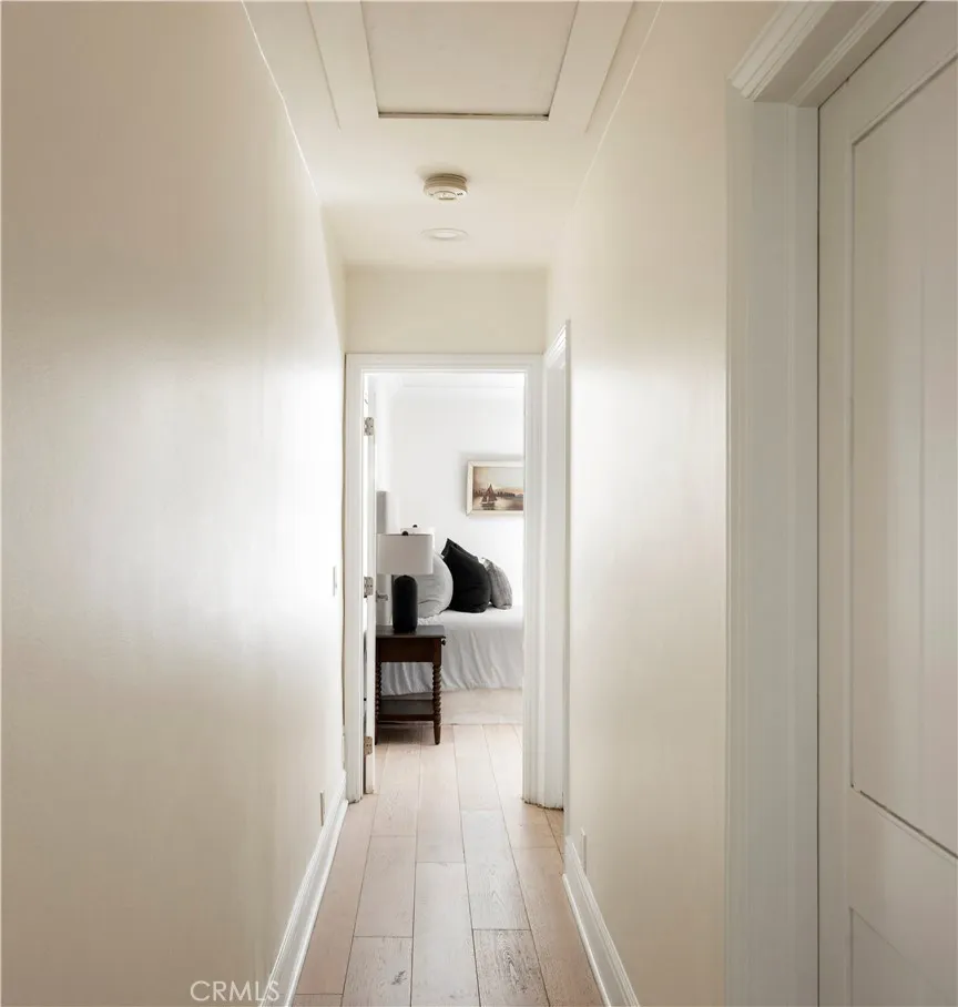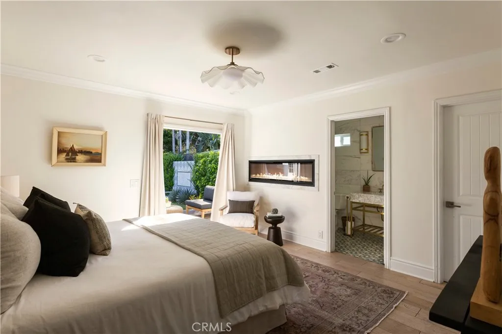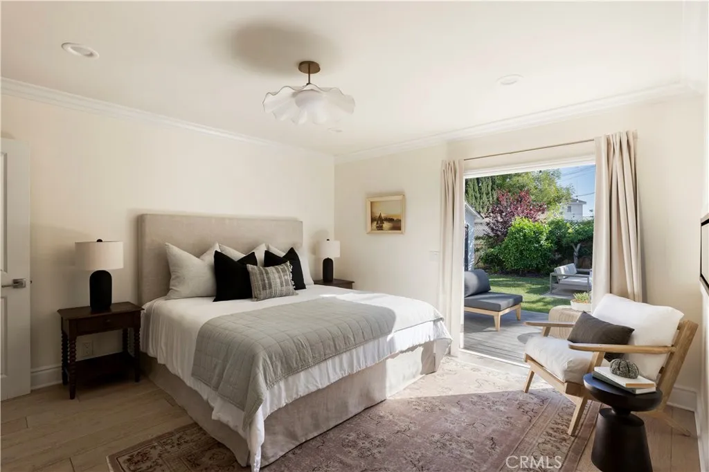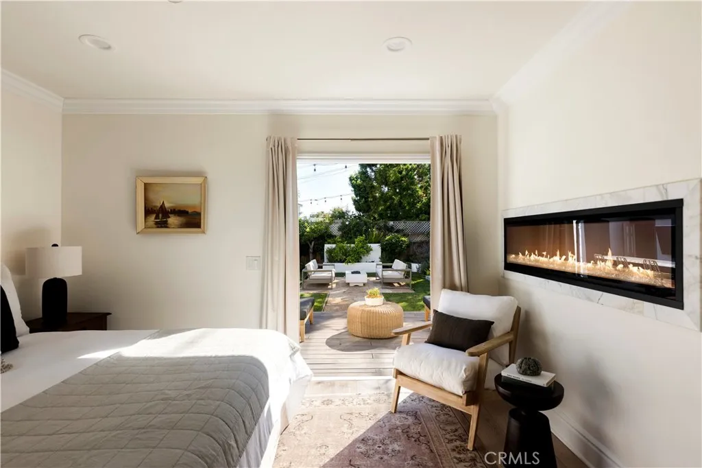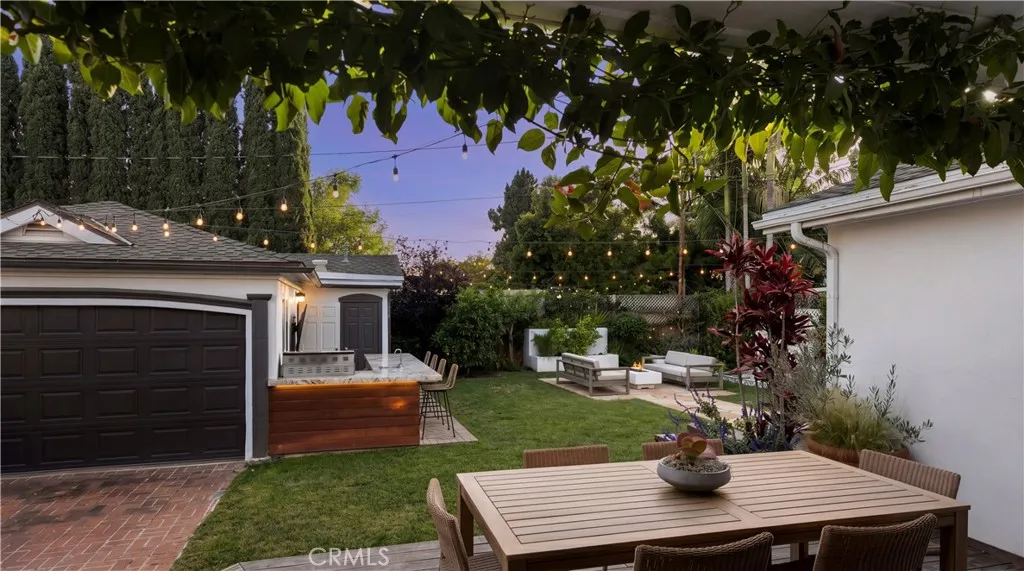 Tucked at the end of a quiet cul-de-sac and draped in blooming trumpet vines, this thoughtfully updated Eastside Costa Mesa residence blends timeless design with effortless indoor-outdoor living on a generously sized lot. Over the years, the property has been expanded to offer three bedrooms and two-and-a-half bathrooms within a light-filled, open-concept floor plan. Vaulted shiplap ceilings soar overhead, grounded by light hardwood floors and arched details. The kitchen is the undisputed heart of the home: custom two-tone cabinetry with glass fronts, marble subway tile, a six-burner range with double oven, farmhouse sink, and a generous breakfast bar that flows into the living and dining areas. A fireplace anchors the living room, while a nearly 12 La Cantina door dissolves the boundary between indoors and out. The primary suite addition offers a peaceful retreat with a private deck and direct backyard access, while the secondary bedrooms and updated bathroom provide flexible space for guests, home office, or play room. The home is further enhanced by central air conditioning, a whole-house Aquasana water filtration system, and an under-sink reverse osmosis system. Designed for year-round enjoyment, the front and backyards unfold as a series of intimate yet connected outdoor spaces, with eight mature citrus and fruit trees woven throughout. An entertainers bar, complete with barbecue, sink, and refrigerator, opens to a sweeping backyard garden setting where string lights, a fire pit lounge, and tiled fountain create a relaxed, inviting atmosphere. A conveniently located ha