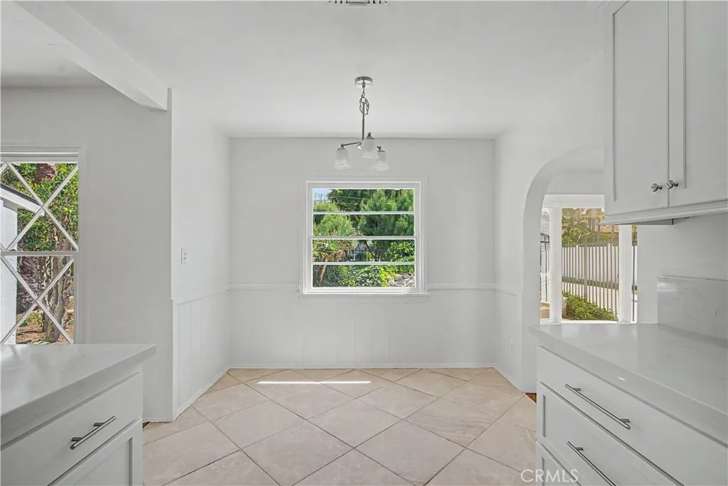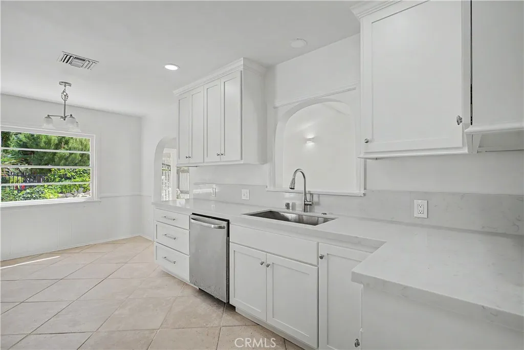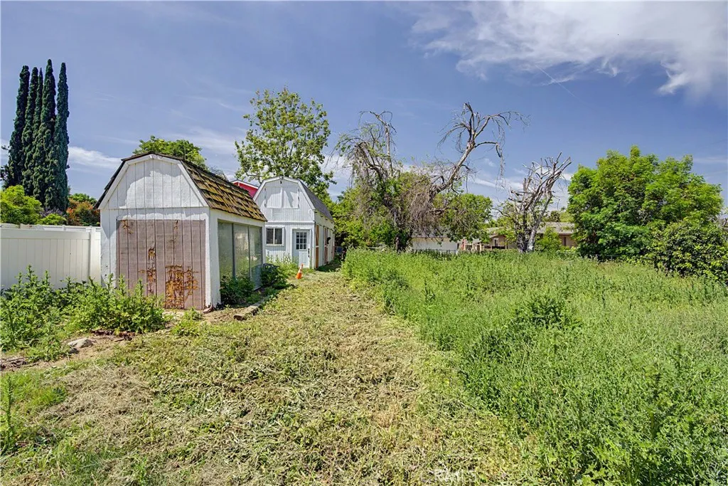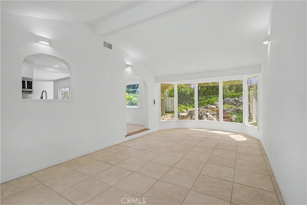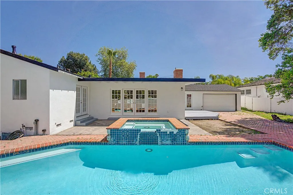 5733 Oakdale Ave. in Woodland Hills, located on the iconic Candy Cane Lane, is a beautifully renovated 3-bed + 2-bath home offering 1,994 sq. ft. of living space on an expansive 17,788 sq. ft. flat lot. A circular-style driveway with dual access points runs parallel to the home and connects to a secondary drive leading to a pull-through garage, providing ample off-street parking and easy access. Mature landscaping and a private entry gate open to a brick pathway that guides you to the front door. Inside, the entry opens to the first of three living areas, featuring refinished hardwood floors and a classic brick fireplace. This space opens into the renovated kitchen, complete with stainless steel appliances, brand new custom cabinetry, quartz countertops and a breakfast nook. An archway opens to the second living area, ideal as a formal dining room or entertaining space, highlighted by a wall of windows along a curved wall. French doors open from this room to the backyard patio. A third living area offers an additional brick fireplace and two sets of French doors, creating a strong indoor-outdoor connection. Hardwood floors continue into the primary suite, which includes a walk-in closet, an upgraded en suite bathroom with a quartz-top vanity, and its own set of French doors leading to the backyard. Two additional bedrooms also feature hardwood flooring and share a updated bathroom with a double-sink quartz vanity. A separate laundry room adds convenience. The backyard is divided into two distinct areas. The first boasts a patio, pool, jacuzzi and easy access to the pass-thr