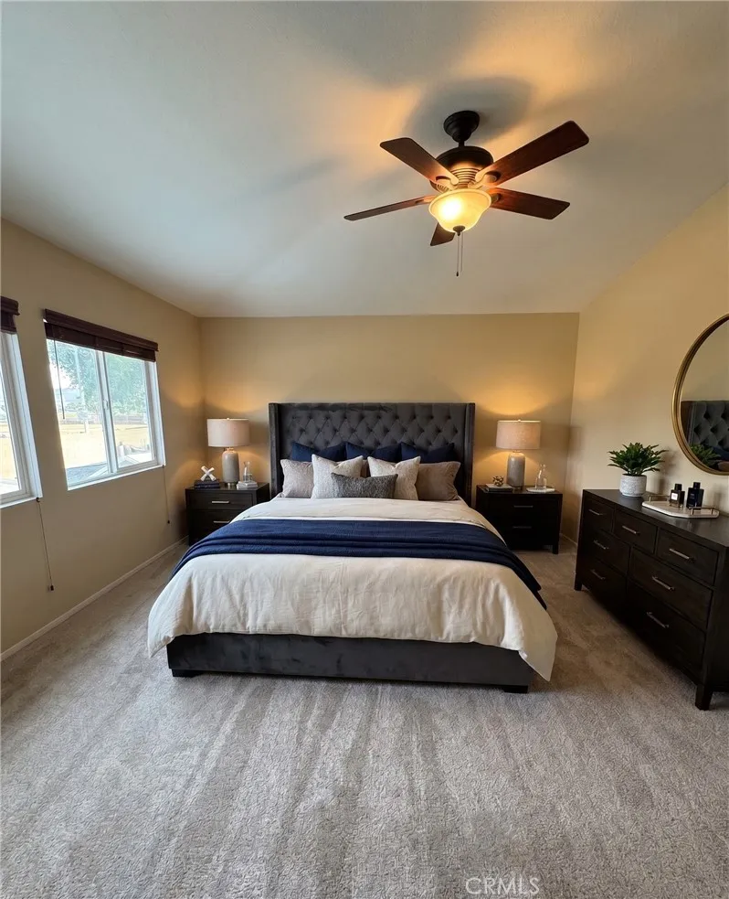 MOVE-IN READY, this 6-BEDROOM residence is on a CORNER LOT, offering a rare combination of privacy, scale, and refined living. The expansive floor plan features a highly desirable MAIN-LEVEL BEDROOM, a grand living room, and a family room anchored by a fireplace and enhanced with built-in media and ceiling speaker wiring. At the heart of the home, the GOURMET KITCHEN impresses with a striking GRANITE ISLAND, breakfast bar seating, a walk-in pantry, and an abundance of white cabinetry. This serene primary suite showcases a spacious dressing area, dual vanities, a tub, a SEPARATE glass-enclosed shower, and an expansive walk-in closet. A versatile EXPANSIVE LOFT with custom built-in workstation and cabinetry offers the ideal flex space for a private office, library, or lounge. The home features brand NEW CARPETING throughout, CUSTOM paint, and CEILING FANS in every bedroom and the main living areas,. Step outside to a beautifully GRAND backyard oasis, with a COVERED PATIO featuring DUAL NEW CEILING FANS, lush manicured lawns, and block/vinyl wall fencing for enhanced privacywith NO NEIGHBORS BEHIND. The grounds include a dedicated dog run and GATED RV PARKING with an extended concrete pad. The property offers a rare 4-CAR TANDEM GARAGE DRIVE-THRUOGH, pull-down attic storage, and additional gated, drive-through concrete parking. Nestled in a quiet, desirable neighborhood just moments from shopping and dining, this home presents a rare opportunity to own a residence that perfectly balances luxury, space, and everyday practicality.