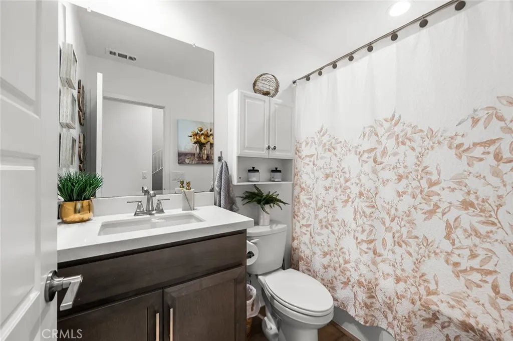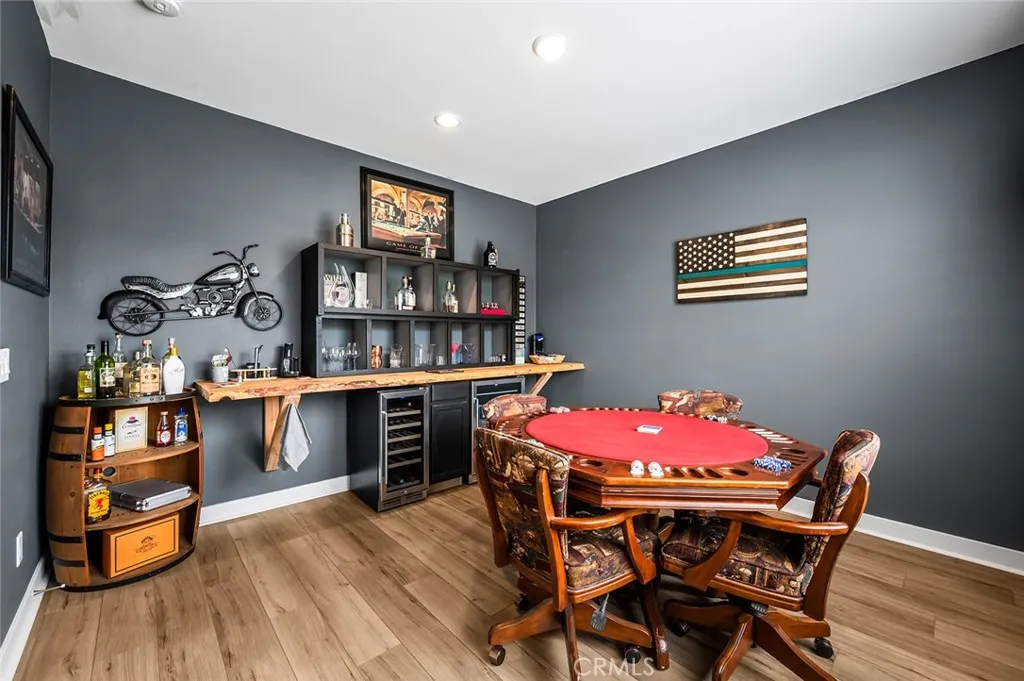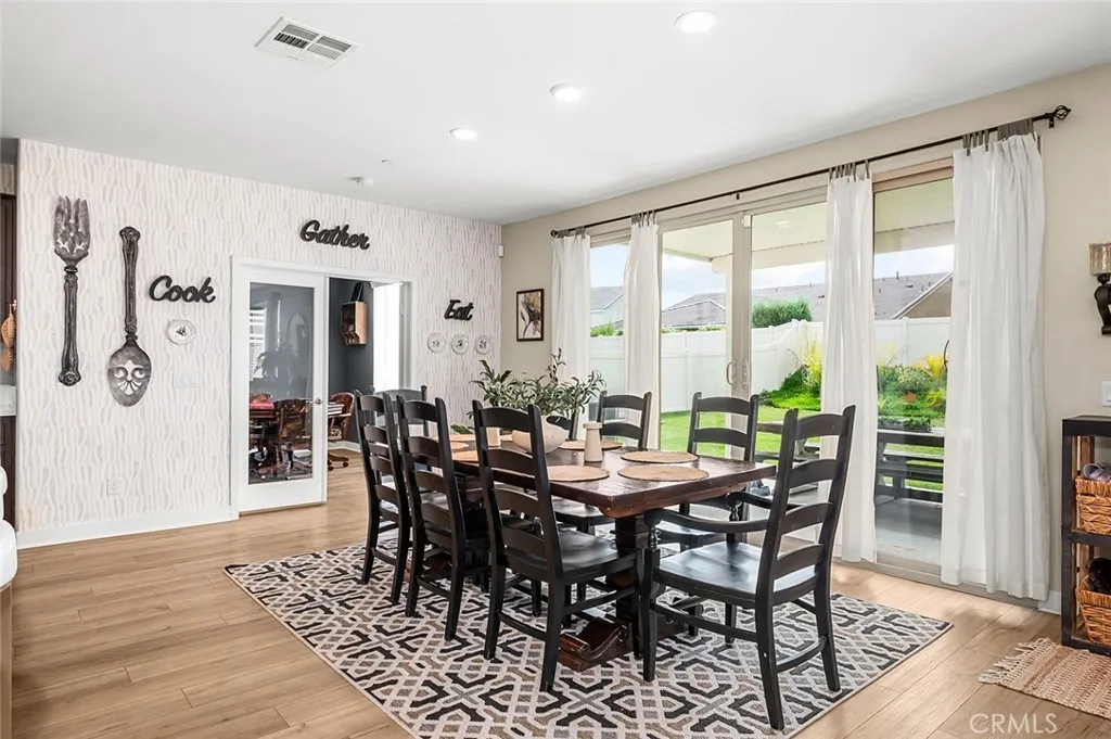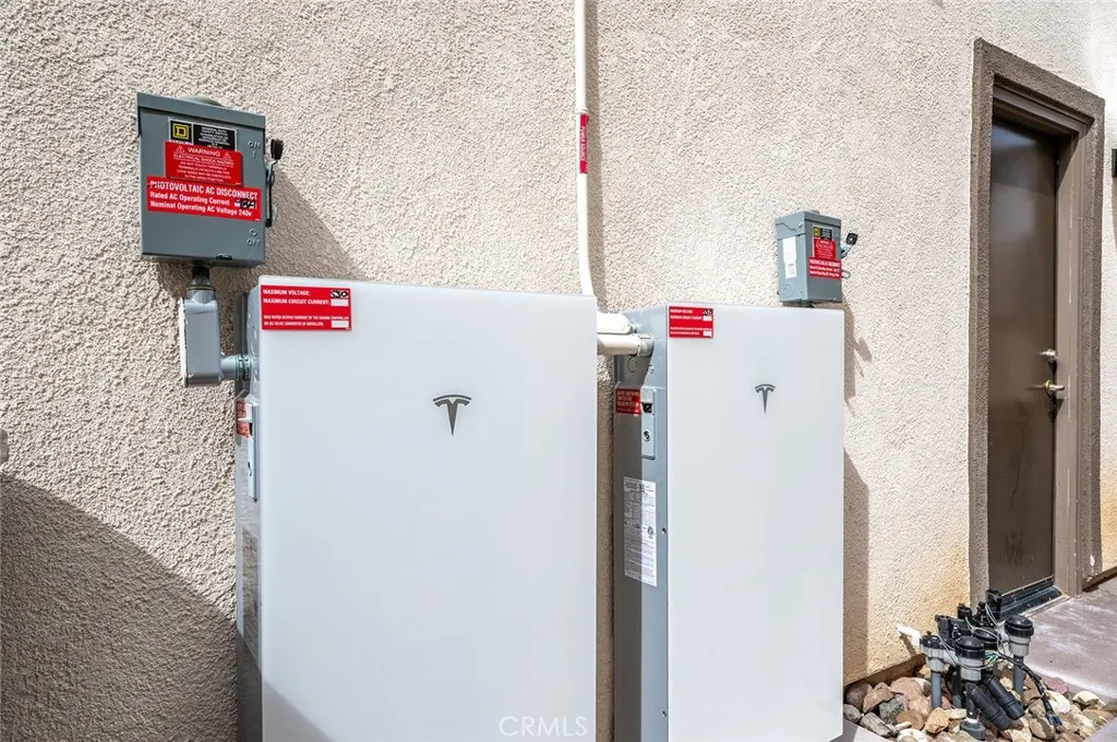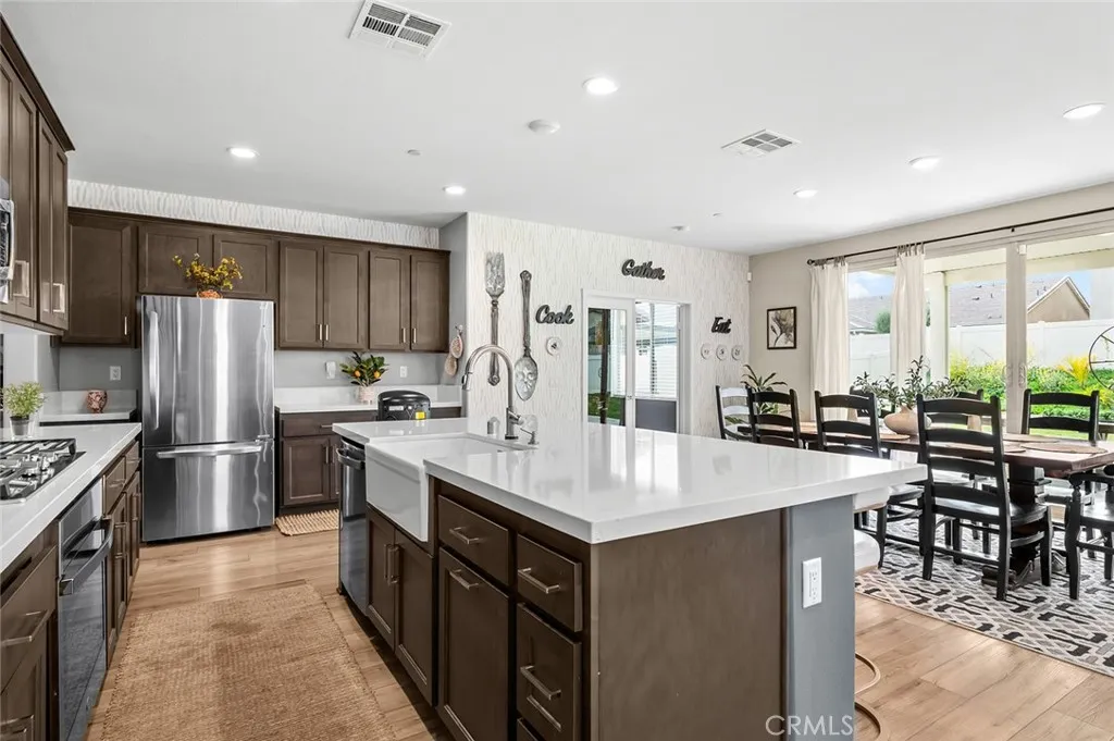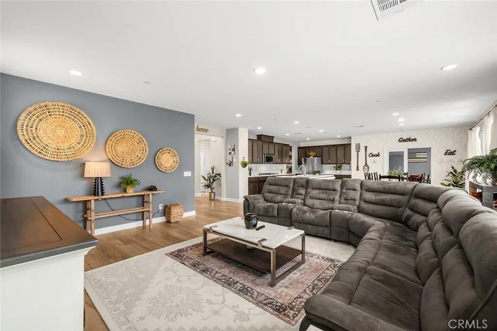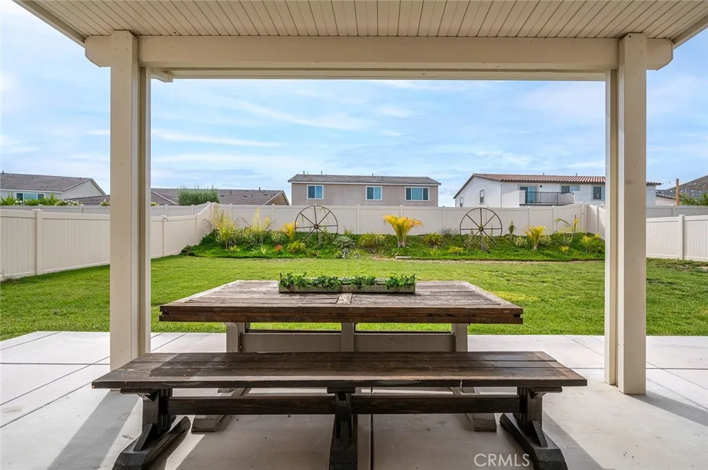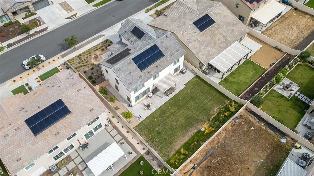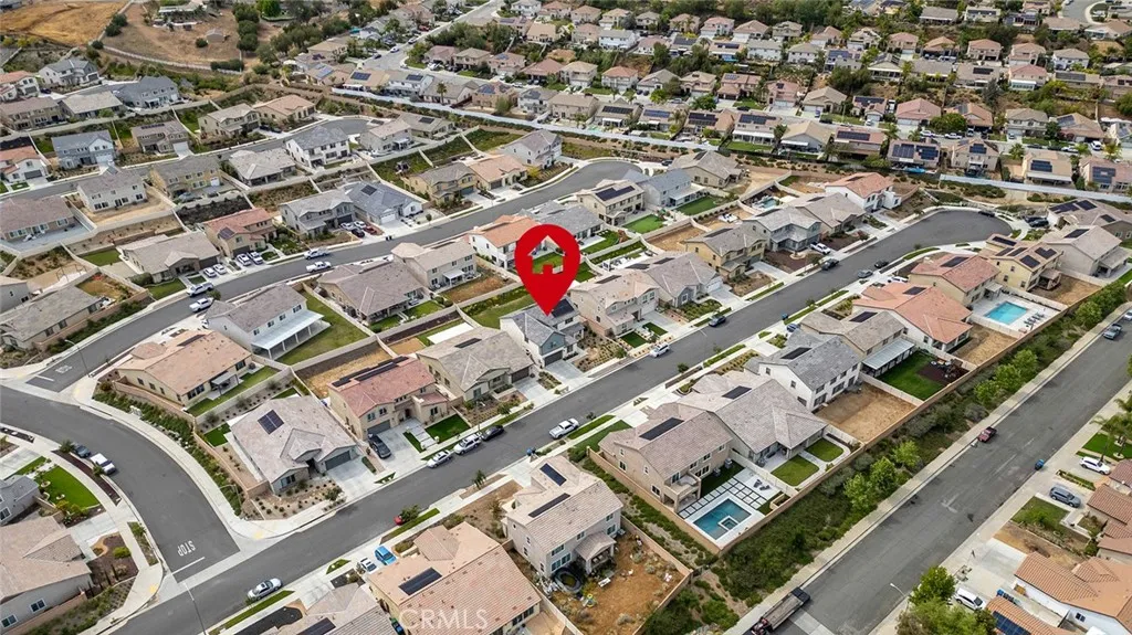Welcome to Audie Murphy Ranch in Menifee/canyon Lake Discover this exceptional, energy-efficient residence located in the highly desirable Audie Murphy Ranch community. This meticulously upgraded home showcases contemporary design, high-end finishes, and outstanding attention to detail throughout. A versatile tandem garage extends the length of the home, providing parking for two cars in a single bay while creating valuable extra space for storage, a home gym, or a workshop that keeps the main living areas clutter-free and maximizes the homes overall functionality and appeal. The open-concept floor plan features upgraded lighting, quartz countertops in the kitchen and all bathrooms, and luxury vinyl tile flooring in the main living areas and bathrooms. The gourmet kitchen includes a farmhouse-style sink, touch-activated faucet, upgraded stove and oven, a widened refrigerator space, and a frosted pantry door. The 12-foot sliding glass door opens to an extended covered patio, ideal for seamless indoor-outdoor living. This home is equipped with 25 solar panels and two Tesla battery storage packs, providing exceptional energy efficiency. Additional highlights include dual-zone heating and air conditioning, every room pre-plumbed for ceiling fans, upgraded banister railing on the staircase, and a bonus room with French doors that can serve perfectly as an office or flex space. The primary bathroom offers an upgraded soaking tub for added luxury. The exterior features an extended driveway and patio, a three-car garage with decorative windows and dual exterior lighting, a gas line