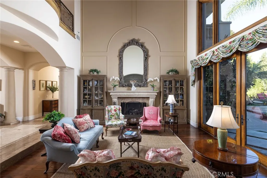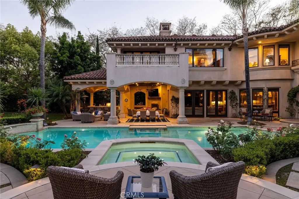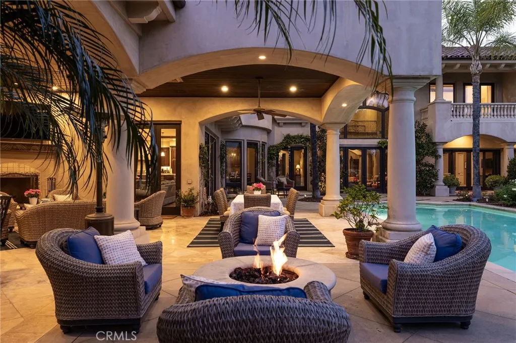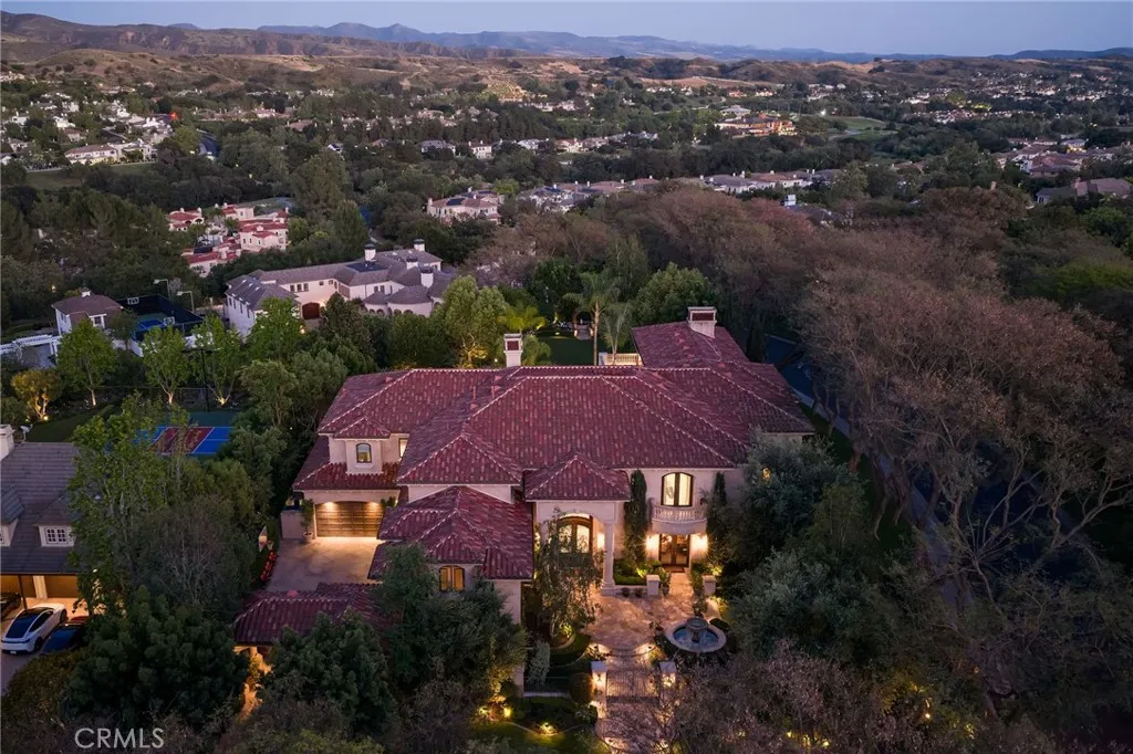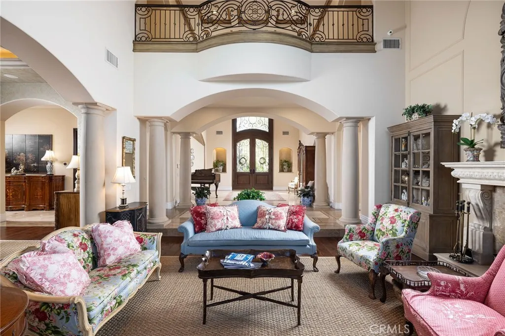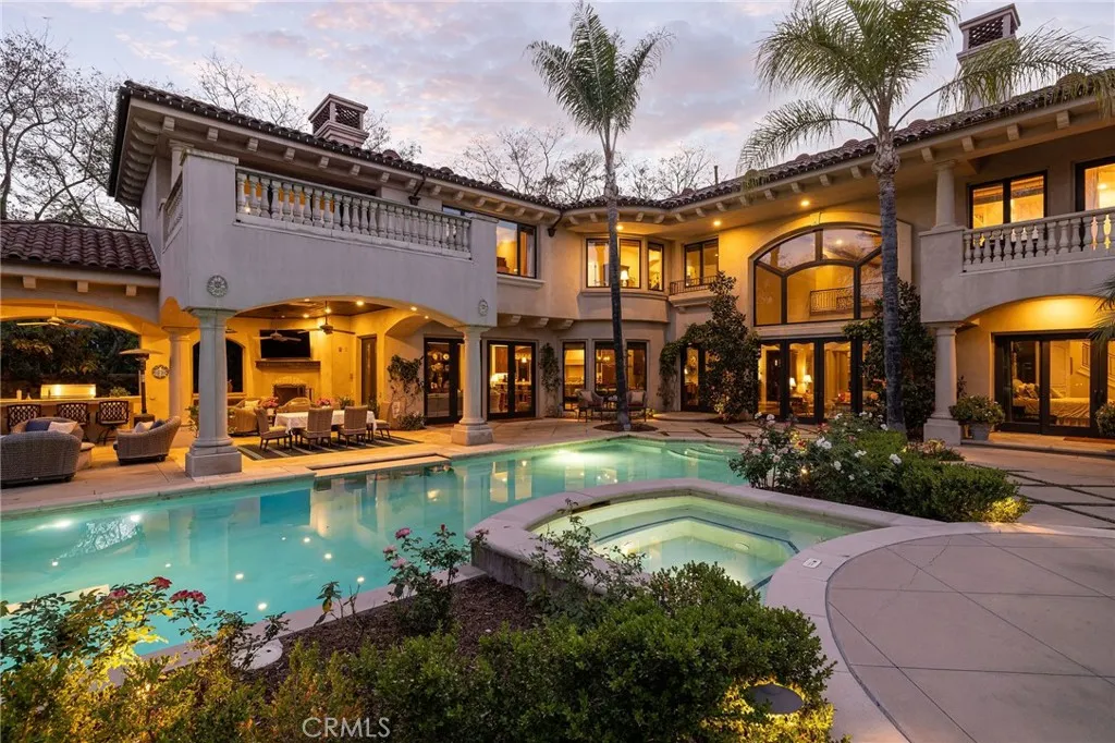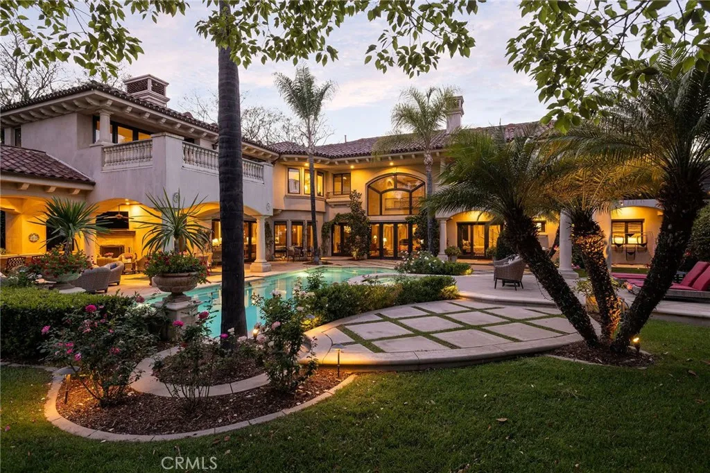 Welcome to 26 Palomino, located within the highly desirable guard-gated community of Coto de Caza. Set on approximately 1 acre in the Woods neighborhood, this custom estate offers 6 beds/7 baths with timeless architectural detail throughout. Upon arrival you see the lush Mediterranean curb appeal with a gated court yard and a gated motor court with porte-cochere leading to a 6.5-car garage. From the moment you enter the home, youre greeted by soaring two-story ceilings, a stunning rotunda above the staircase, and walls of doors and windows that frame the backyard and flood the home with natural light. Rich wood and stone flooring, solid wood doors, detailed molding, and beautiful arched hallways carry throughout much of the home. The expansive kitchen features a large island, high-end appliances, double dishwashers, and a bright breakfast nook detailed with bay windows. It opens seamlessly to an oversized family room with soaring beamed ceilings, wood floors, and a statement fireplace. A wine cellar, full walk-in pantry, and abundant storage add both function and convenience. Equally impressive, the living room has a stunning fireplace and soaring ceilings, dining room with a lighted inset ceiling, and an office with floor-to-ceiling woodwork and coffered ceilings. Additional downstairs highlights include a downstairs bedroom with en-suite bath, dual staircases, and an oversized laundry room. Upstairs, the primary suite is its own private sanctuary, featuring a sitting area, fireplace, balcony with hillside and mountain views, 2 additional flex rooms, and a spacious walk-in