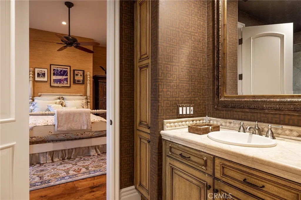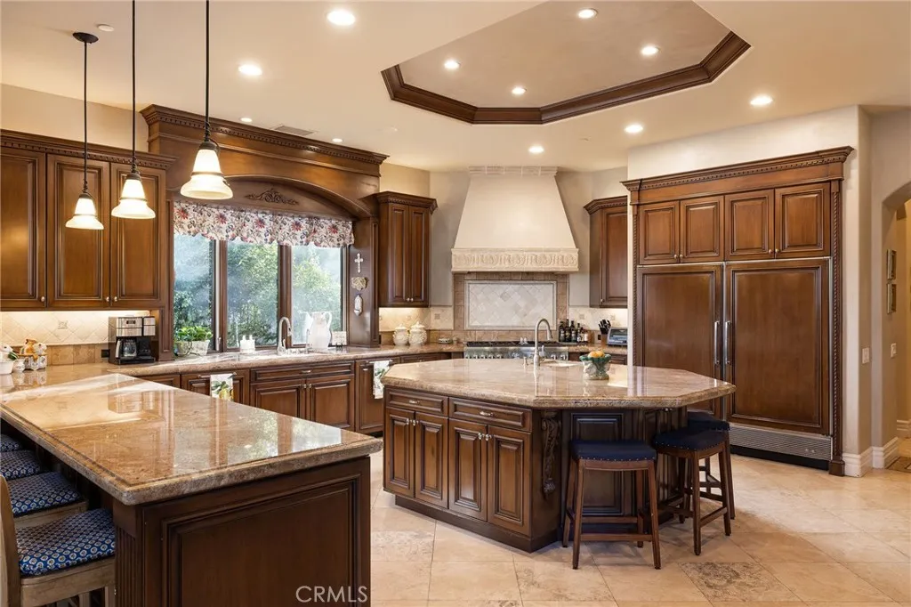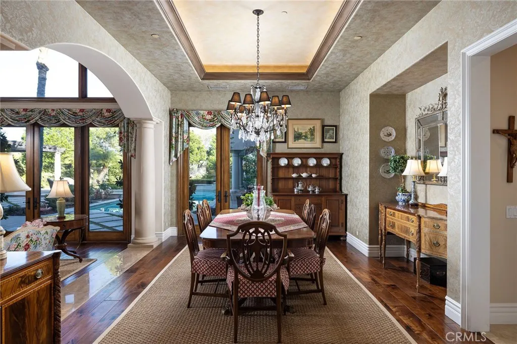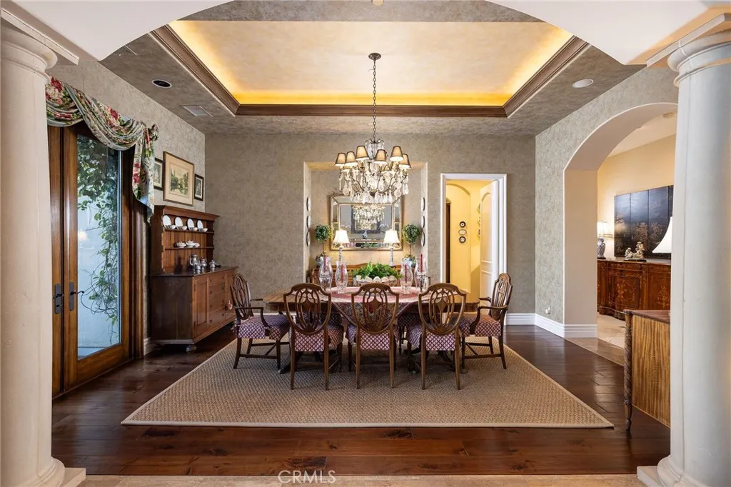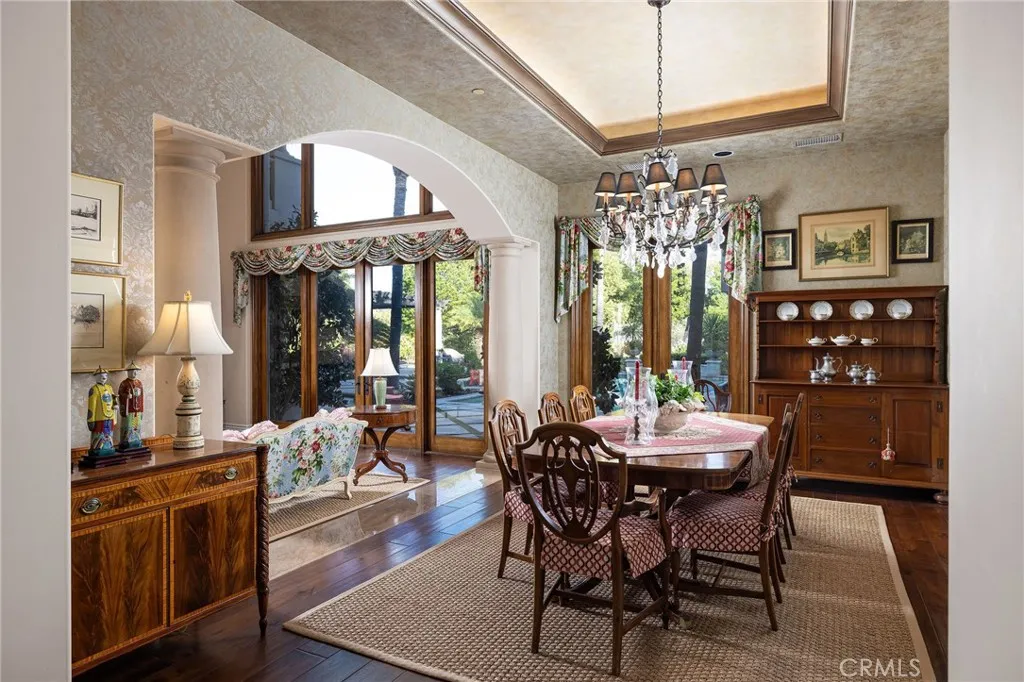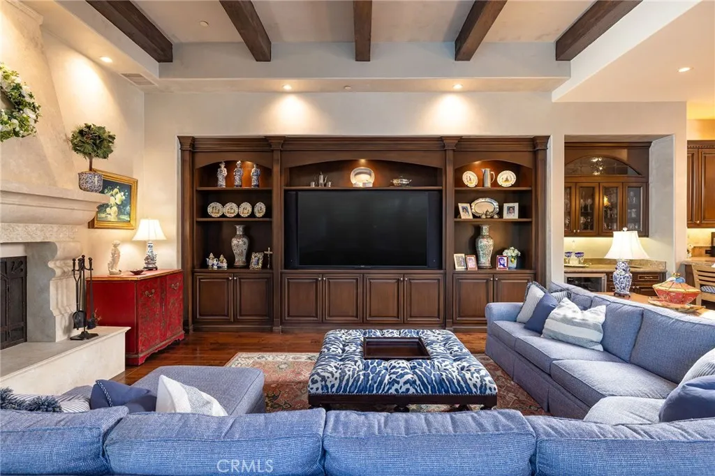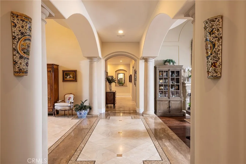 Welcome to 26 Palomino, located within the highly desirable guard-gated community of Coto de Caza. Set on approximately 1 acre in the Woods neighborhood, this custom estate offers 6 beds/7 baths with timeless architectural detail throughout. Upon arrival you see the lush Mediterranean curb appeal with a gated court yard and a gated motor court with porte-cochere leading to a 6.5-car garage. From the moment you enter the home, youre greeted by soaring two-story ceilings, a stunning rotunda above the staircase, and walls of doors and windows that frame the backyard and flood the home with natural light. Rich wood and stone flooring, solid wood doors, detailed molding, and beautiful arched hallways carry throughout much of the home. The expansive kitchen features a large island, high-end appliances, double dishwashers, and a bright breakfast nook detailed with bay windows. It opens seamlessly to an oversized family room with soaring beamed ceilings, wood floors, and a statement fireplace. A wine cellar, full walk-in pantry, and abundant storage add both function and convenience. Equally impressive, the living room has a stunning fireplace and soaring ceilings, dining room with a lighted inset ceiling, and an office with floor-to-ceiling woodwork and coffered ceilings. Additional downstairs highlights include a downstairs bedroom with en-suite bath, dual staircases, and an oversized laundry room. Upstairs, the primary suite is its own private sanctuary, featuring a sitting area, fireplace, balcony with hillside and mountain views, 2 additional flex rooms, and a spacious walk-in