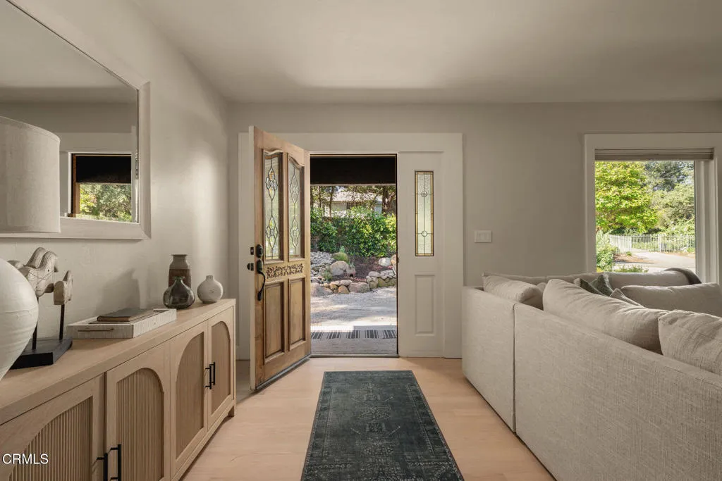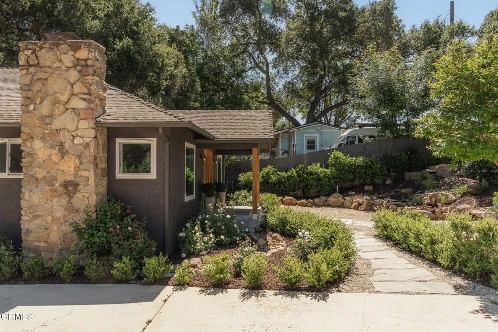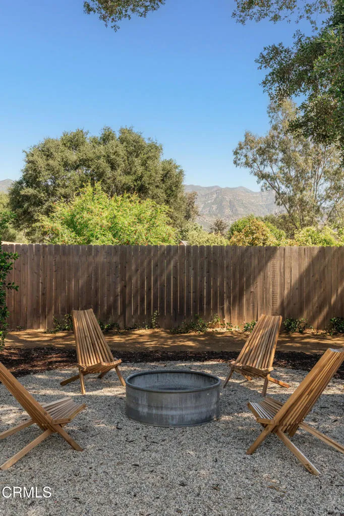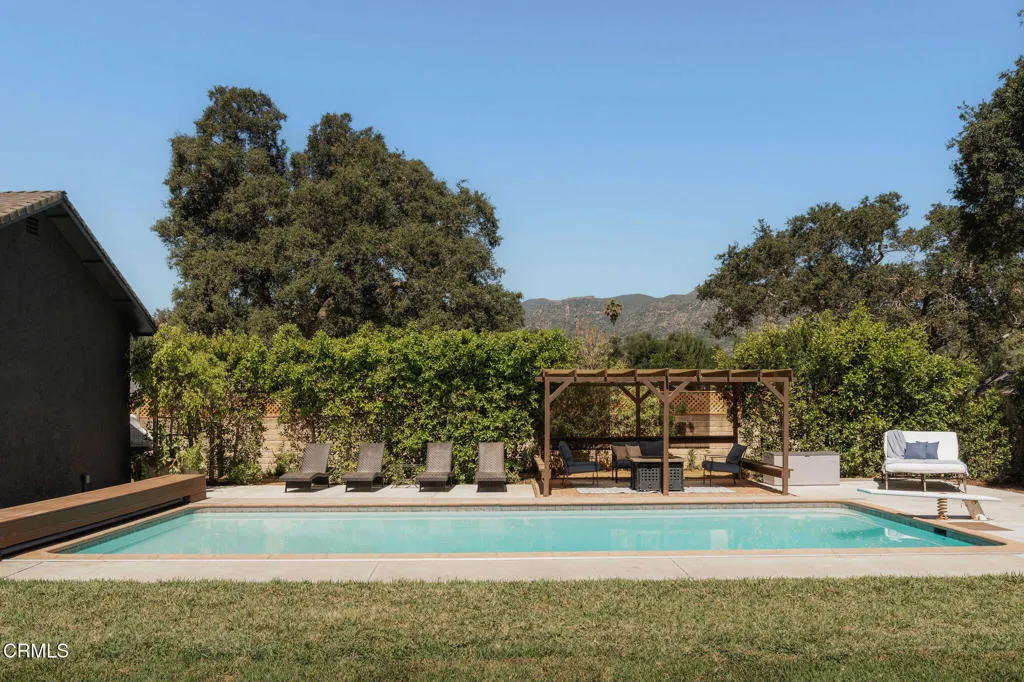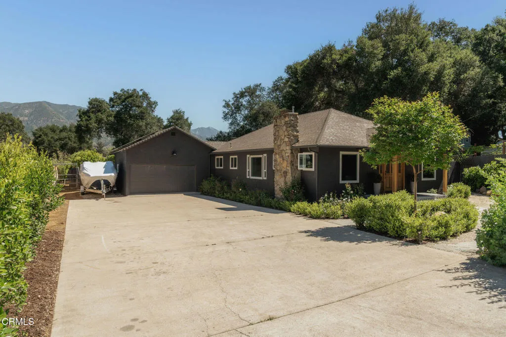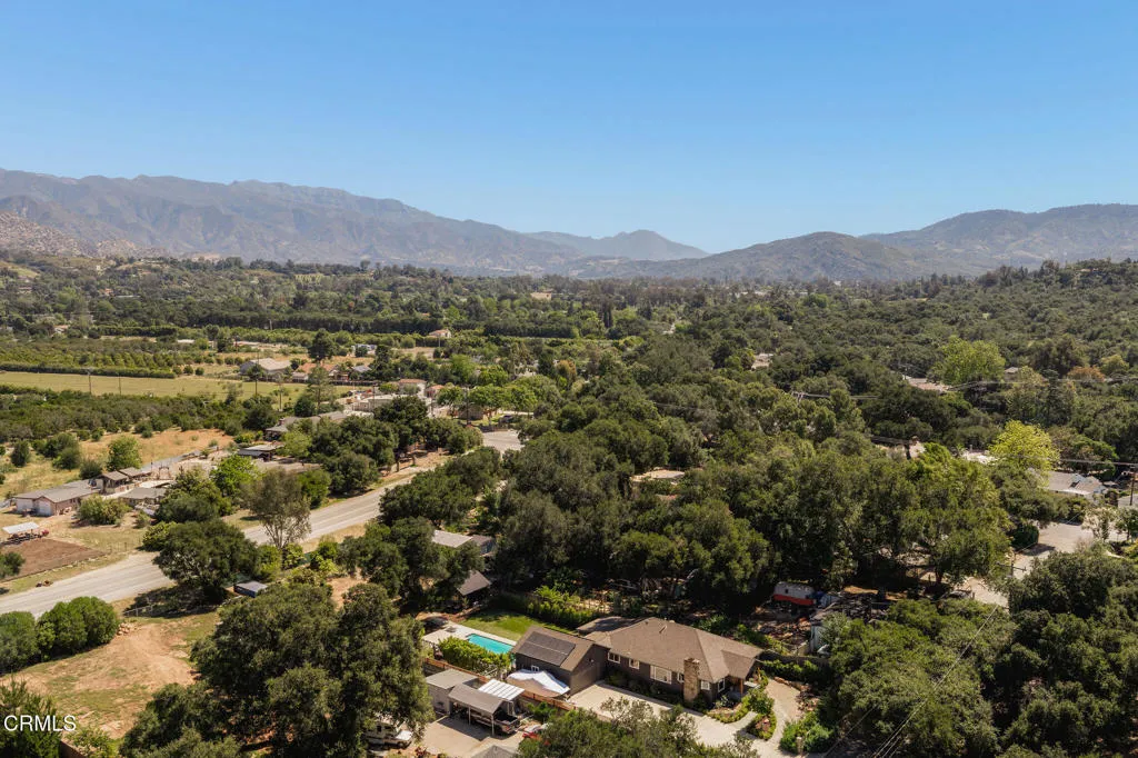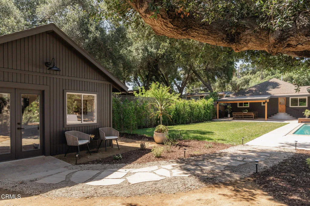 Tucked at the end of a quiet cul-de-sac in Meiners Oaks, this inviting property offers peaceful living with beautiful mountain views, including glimpses of Chief's Peak. The main residence features 3 bedrooms and 2 bathrooms across approximately 1,600 sq ft, highlighted by recently refinished solid red oak floors, remodeled bathrooms, and a lightly updated kitchen. The inviting living space, centered around a charming fireplace, creates the perfect place to gather, unwind, and feel at home. Set on over half an acre, the property includes an expansive driveway and an oversized two car garage with newly added storage above. Step outside and the property truly begins to unfold. Beneath a newly built patio cover, long afternoons turn into memorable evenings, dining al fresco in the soft Ojai light. The backyard is anchored by a majestic oak tree, with a sparkling pool, cabana, and separate 256 sq ft pool house/office thoughtfully arranged around it. Whether hosting guests, creating a private workspace, or enjoying a quiet moment poolside, the setting offers exceptional flexibility and charm. Beyond the main yard, the property opens to a variety of mature fruit trees including avocado, citrus, persimmon, pomegranate, apricot, and nectarine. With ample space for animals, gardening, or expanded use, the property also includes a large metal-covered barn, a 20-foot shipping container for storage, and convenient rear access from the road behind. A rare opportunity to enjoy space, versatility, and the Ojai lifestyle in a peaceful setting, plus a special feature you'll have to see in p
