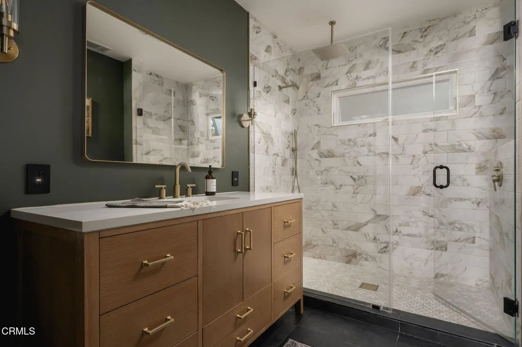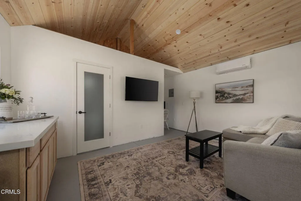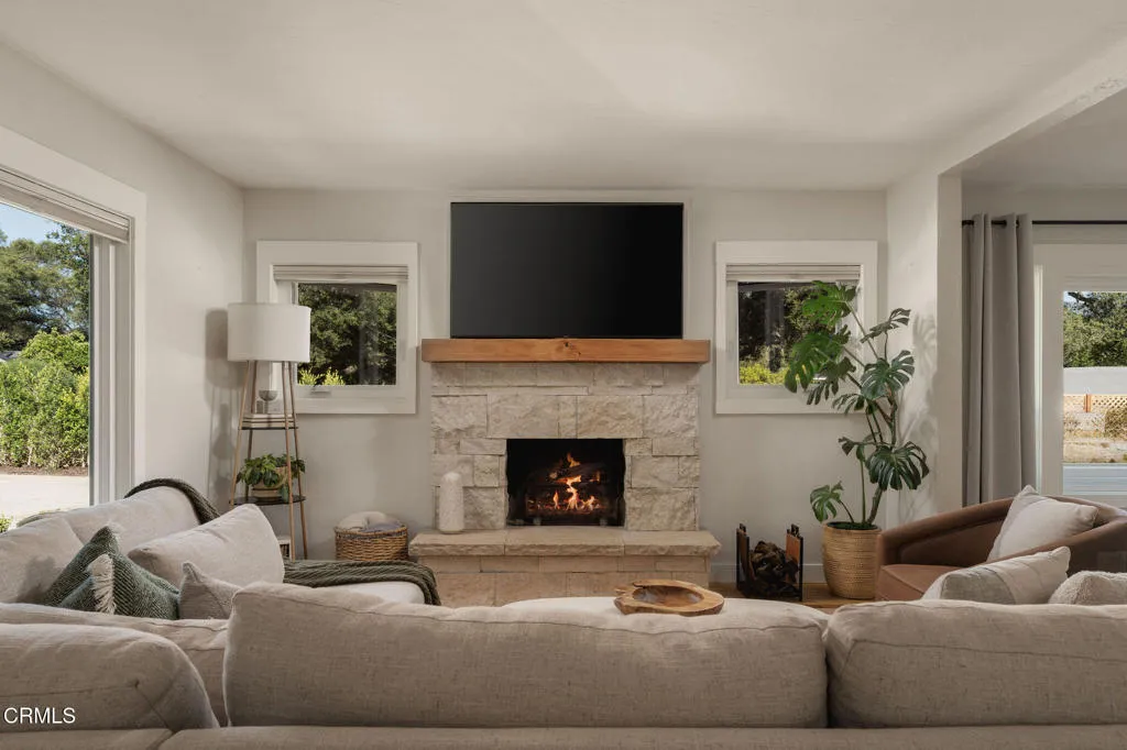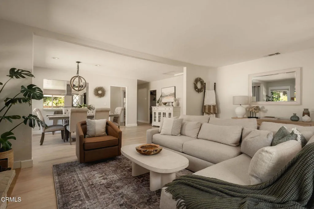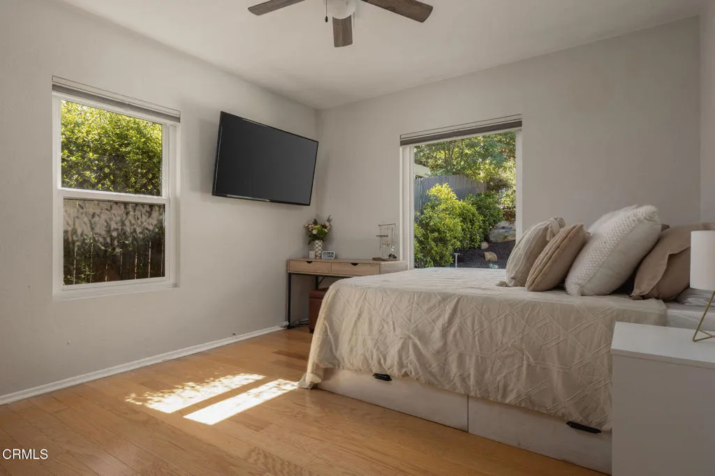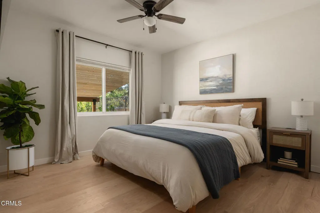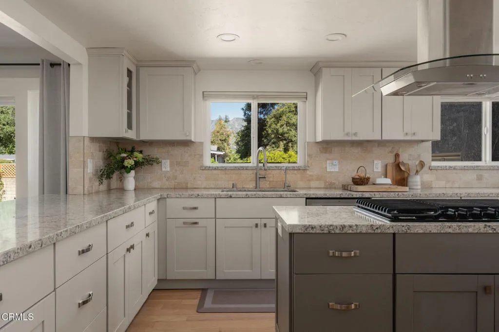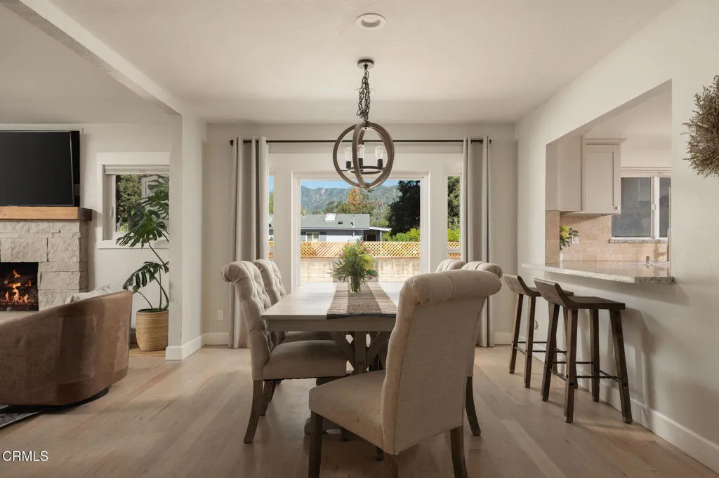Tucked at the end of a quiet cul-de-sac in Meiners Oaks, this inviting property offers peaceful living with beautiful mountain views, including glimpses of Chief's Peak. The main residence features 3 bedrooms and 2 bathrooms across approximately 1,600 sq ft, highlighted by recently refinished solid red oak floors, remodeled bathrooms, and a lightly updated kitchen. The inviting living space, centered around a charming fireplace, creates the perfect place to gather, unwind, and feel at home. Set on over half an acre, the property includes an expansive driveway and an oversized two car garage with newly added storage above. Step outside and the property truly begins to unfold. Beneath a newly built patio cover, long afternoons turn into memorable evenings, dining al fresco in the soft Ojai light. The backyard is anchored by a majestic oak tree, with a sparkling pool, cabana, and separate 256 sq ft pool house/office thoughtfully arranged around it. Whether hosting guests, creating a private workspace, or enjoying a quiet moment poolside, the setting offers exceptional flexibility and charm. Beyond the main yard, the property opens to a variety of mature fruit trees including avocado, citrus, persimmon, pomegranate, apricot, and nectarine. With ample space for animals, gardening, or expanded use, the property also includes a large metal-covered barn, a 20-foot shipping container for storage, and convenient rear access from the road behind. A rare opportunity to enjoy space, versatility, and the Ojai lifestyle in a peaceful setting, plus a special feature you'll have to see in p