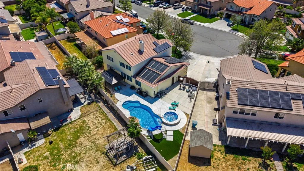 Welcome to your dream pool home nestled on a quiet cul-de-sac, in the growing community of San Jacinto. This incredible updated 2 story home residence offers 4 spacious bedrooms, 3 baths, den, loft, 3 car garage and RV parking. 3161 sqft of thoughtfully design living space on a generous 8,276 sqft lot. Perfect for multi-generational living or guest stays, the highly sought after first floor bedroom and full bath provides flexibility and convenience. Additional highlights include spacious and updated kitchen with stainless steel appliances, white quartz and a stylish backsplash. The oversized bedrooms, upgraded bathrooms, upgraded flooring, ceiling fans, light fixtures throughout the home. A whole house water softener and the home is powered by solar and includes a Tesla charger. Escape to your own private paradise with this incredible outdoor space featuring a stunning solar heated fiberglass pool/spa ideal for evening entertainment or quiet relaxation. Don't miss the opportunity to make this gem your own.