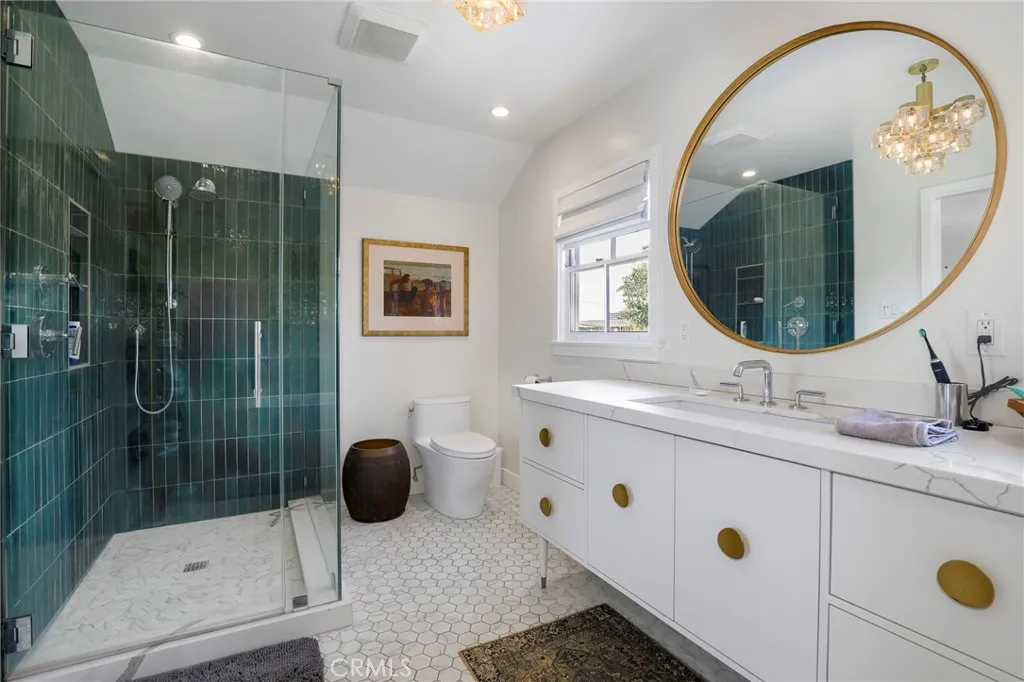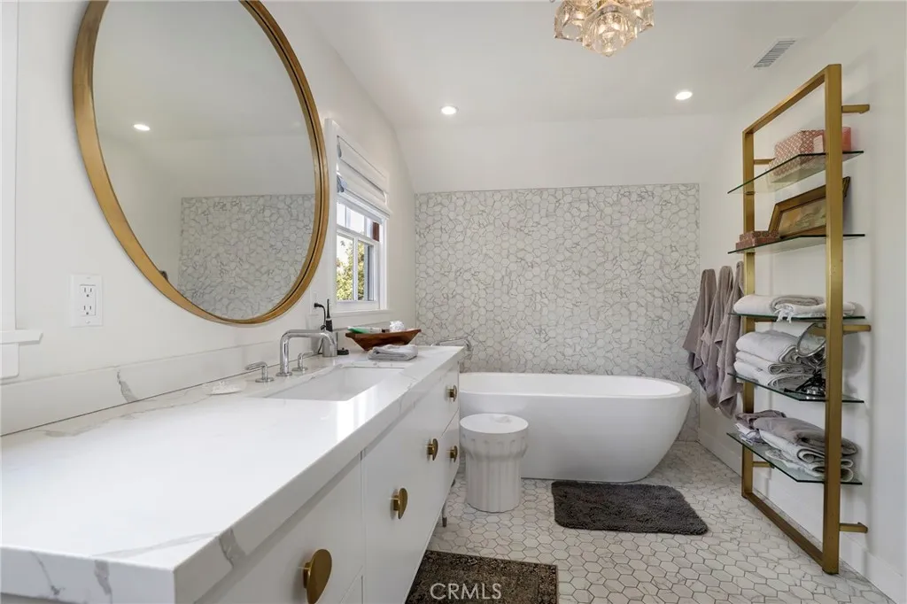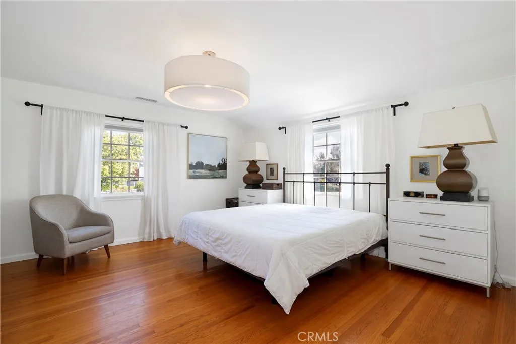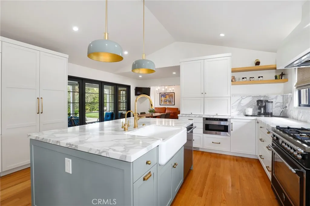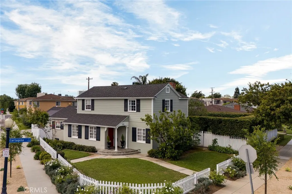 BIXBY KNOLLS! Built in 1941, poised majestically on just over a .25 acre lot, this home will appeal! The front yard faces Olive & Cartagena and boasts drought tolerant landscaping plus is completed with a white picket fence. Enter to appreciate the classic architecture & layout of the upscale 1940s era. Formal entry welcomes guests. Go through to the formal dining room - imagine hosting a dinner party. Formal living room features a fireplace, classic mantle & sconces. Details include classic 1940s hardware, trim & finishes. The double hung wood windows let in plenty of natural light in every room. Completely remodeled in 2021, the custom kitchen is the heartbeat of this home! Vaulted ceiling, Calcutta marble counters & backsplash, plus center island equipped with a Kohler farm sink, upscale faucet and an instant-hot water dispenser (perfect for morning tea), finished with Calcutta marble countertop and a breakfast bar. Custom cabinets include pan drawers, appliance storage, a built-in China cabinet with glass doors, plus a large built in pantry. Bertazzoni 36-inch range, hood, refrigerator, microwave & dishwasher. An LG laundry center is down the hall. Custom French doors open to the private backyard which creates an indoor outdoor ease of living and entertaining. Completing this level, privately situated at the back, is a main-floor primary suite, with it's own garden area. Upstairs are two ensuite bedrooms. The primary bedroom, with east & north windows enjoys plenty of natural light, two closets plus space for home office/seating area. The ensuite remodeled primary bath