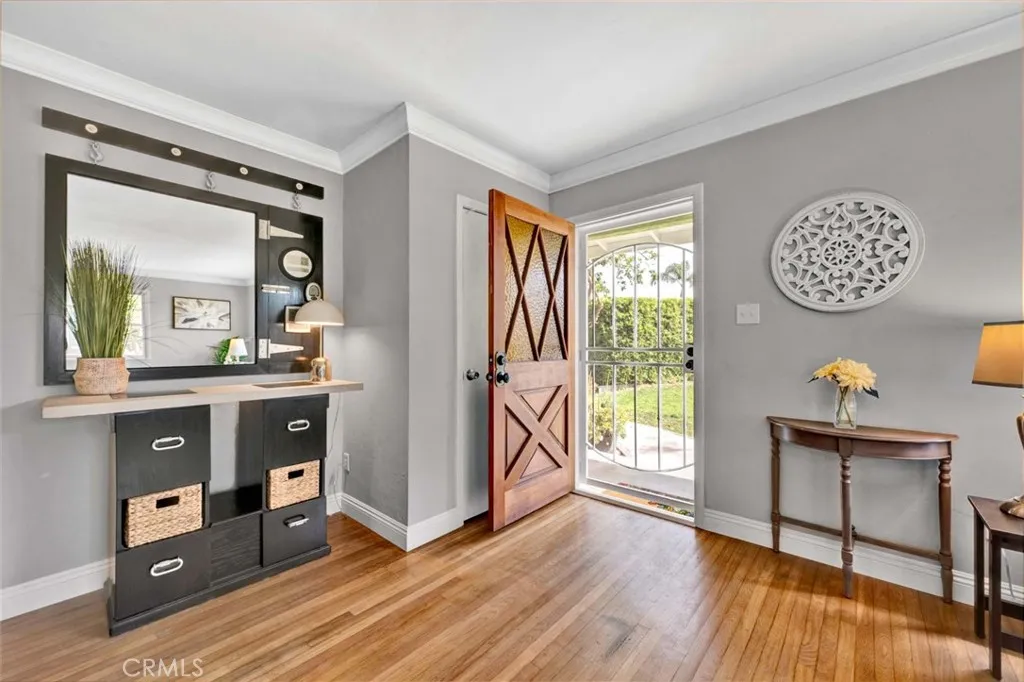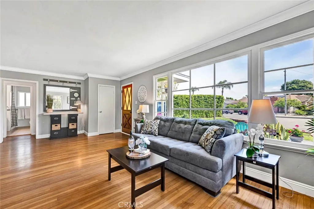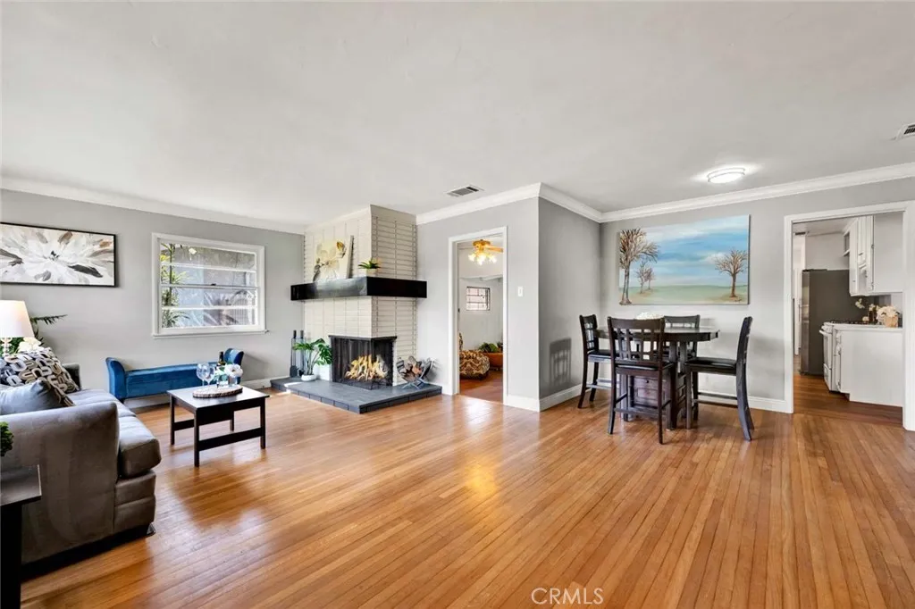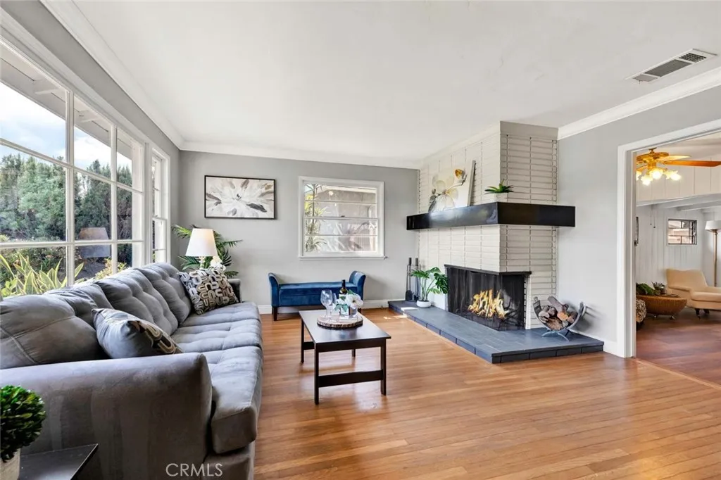 Welcome to a home that doesnt just check boxesit expands whats possible.Tucked into a highly desirable Garden Grove neighborhood,this beautifully remodeled single-story residence offers the rare combination of refined living,flexible space & future expansionperfect for professionals, growing households,or multi-generational living.From the moment you arrive,the charm is undeniable.A welcoming front sitting patio,lush w/ roses, succulents & a striking hibiscus tree,sets the tone for whats inside.Follow the stone-paver walkway to a vintage front door that opens into a light-filled interior where classic character meets thoughtful upgrades.Inside,rich hardwood floors,crown molding & tall baseboards create a warm,elevated feel,while a wall of windows floods the living space w/ natural light.At the center of it all,an impressive two-sided stone fireplace anchors both the living & family roomsperfect for cozy evenings or hosting w/ style. The fully remodeled kitchen is designed for both beauty & function,featuring sleek quartz countertops,crisp white cabinetry,stainless steel appliances & a charming breakfast nook.A convenient pass-through window keeps the connection flowing into the family room,where open beam ceilings, wainscoting & brand-new dual-pane French doors invite seamless indoor-outdoor living.The backyard isnt just largeits an opportunity. Set on a pie-shaped lot,this expansive outdoor space offers exceptional potential to build an ADUideal for extended family,rental income,or a private workspace.The oversized covered patio creates the perfect setting for entertaining