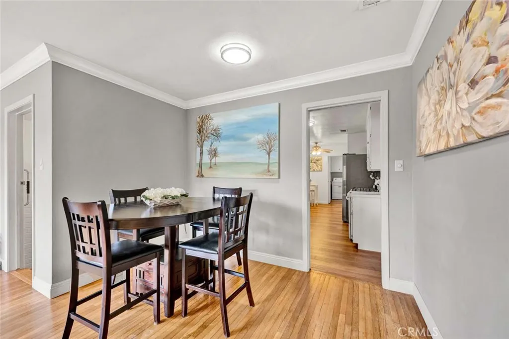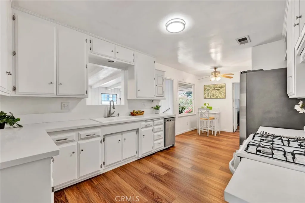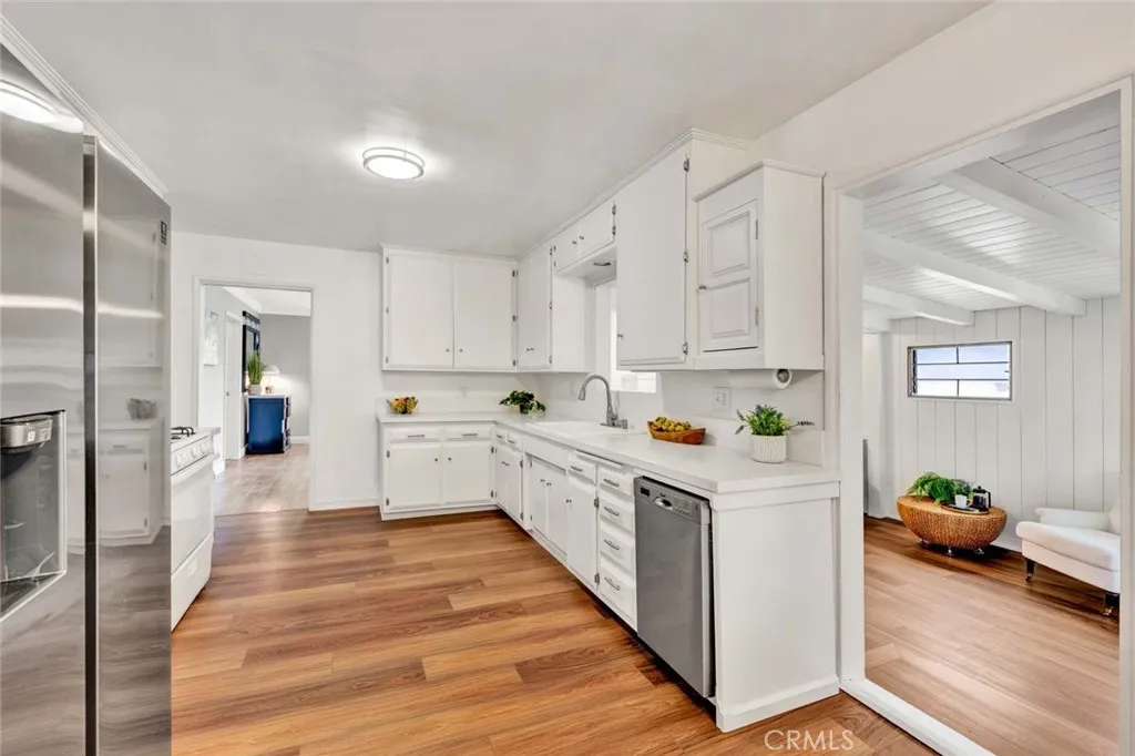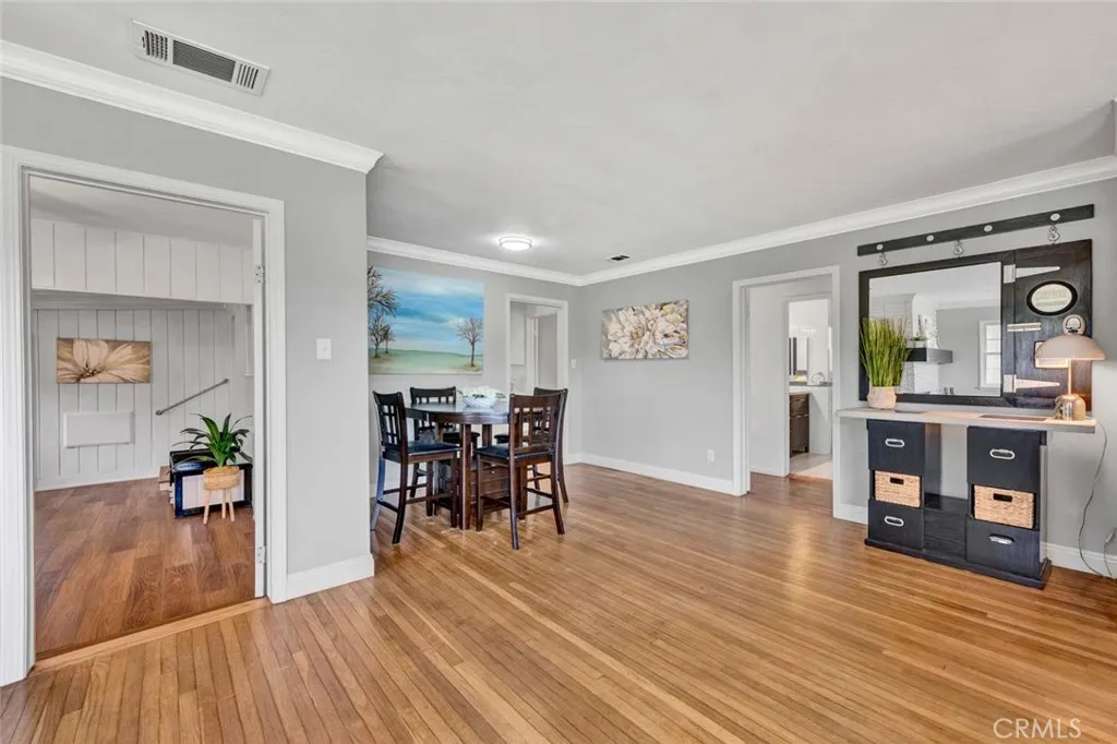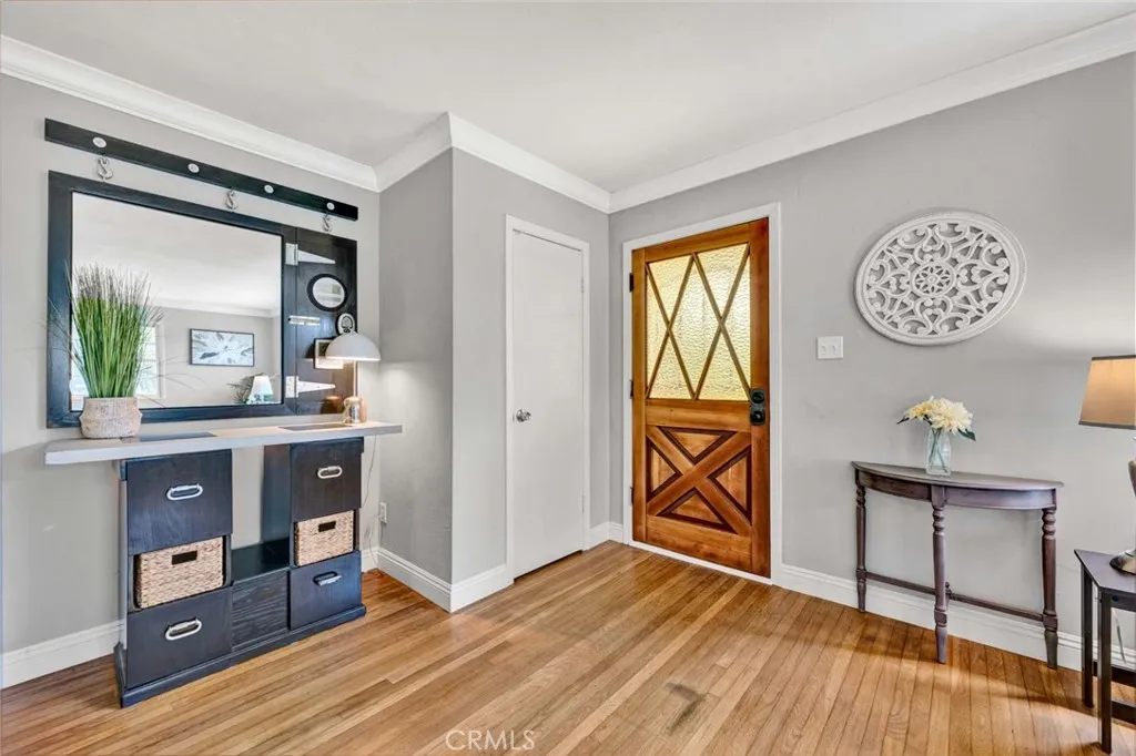 Welcome to a home that doesnt just check boxesit expands whats possible.Tucked into a highly desirable Garden Grove neighborhood,this beautifully remodeled single-story residence offers the rare combination of refined living,flexible space & future expansionperfect for professionals, growing households,or multi-generational living.From the moment you arrive,the charm is undeniable.A welcoming front sitting patio,lush w/ roses, succulents & a striking hibiscus tree,sets the tone for whats inside.Follow the stone-paver walkway to a vintage front door that opens into a light-filled interior where classic character meets thoughtful upgrades.Inside,rich hardwood floors,crown molding & tall baseboards create a warm,elevated feel,while a wall of windows floods the living space w/ natural light.At the center of it all,an impressive two-sided stone fireplace anchors both the living & family roomsperfect for cozy evenings or hosting w/ style. The fully remodeled kitchen is designed for both beauty & function,featuring sleek quartz countertops,crisp white cabinetry,stainless steel appliances & a charming breakfast nook.A convenient pass-through window keeps the connection flowing into the family room,where open beam ceilings, wainscoting & brand-new dual-pane French doors invite seamless indoor-outdoor living.The backyard isnt just largeits an opportunity. Set on a pie-shaped lot,this expansive outdoor space offers exceptional potential to build an ADUideal for extended family,rental income,or a private workspace.The oversized covered patio creates the perfect setting for entertaining